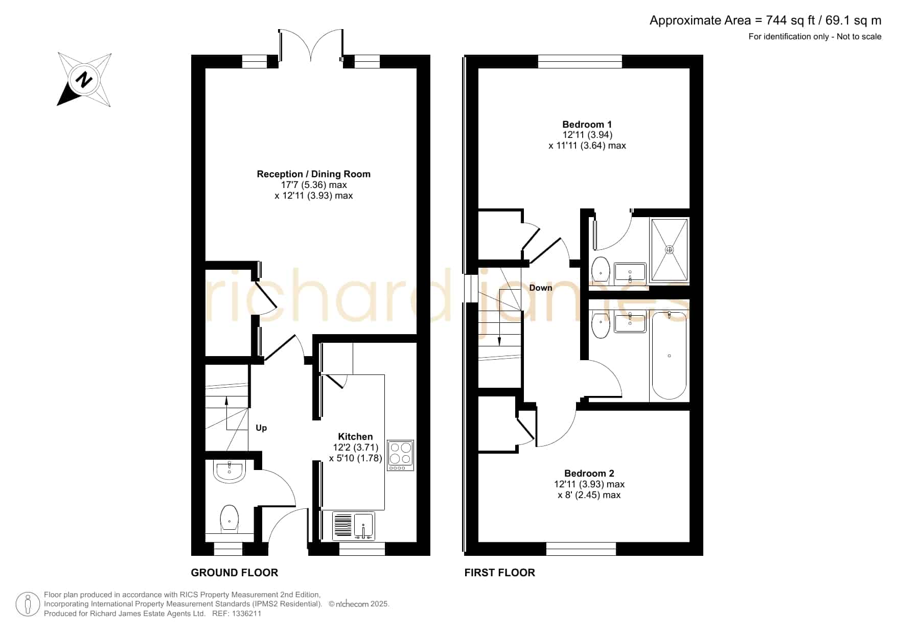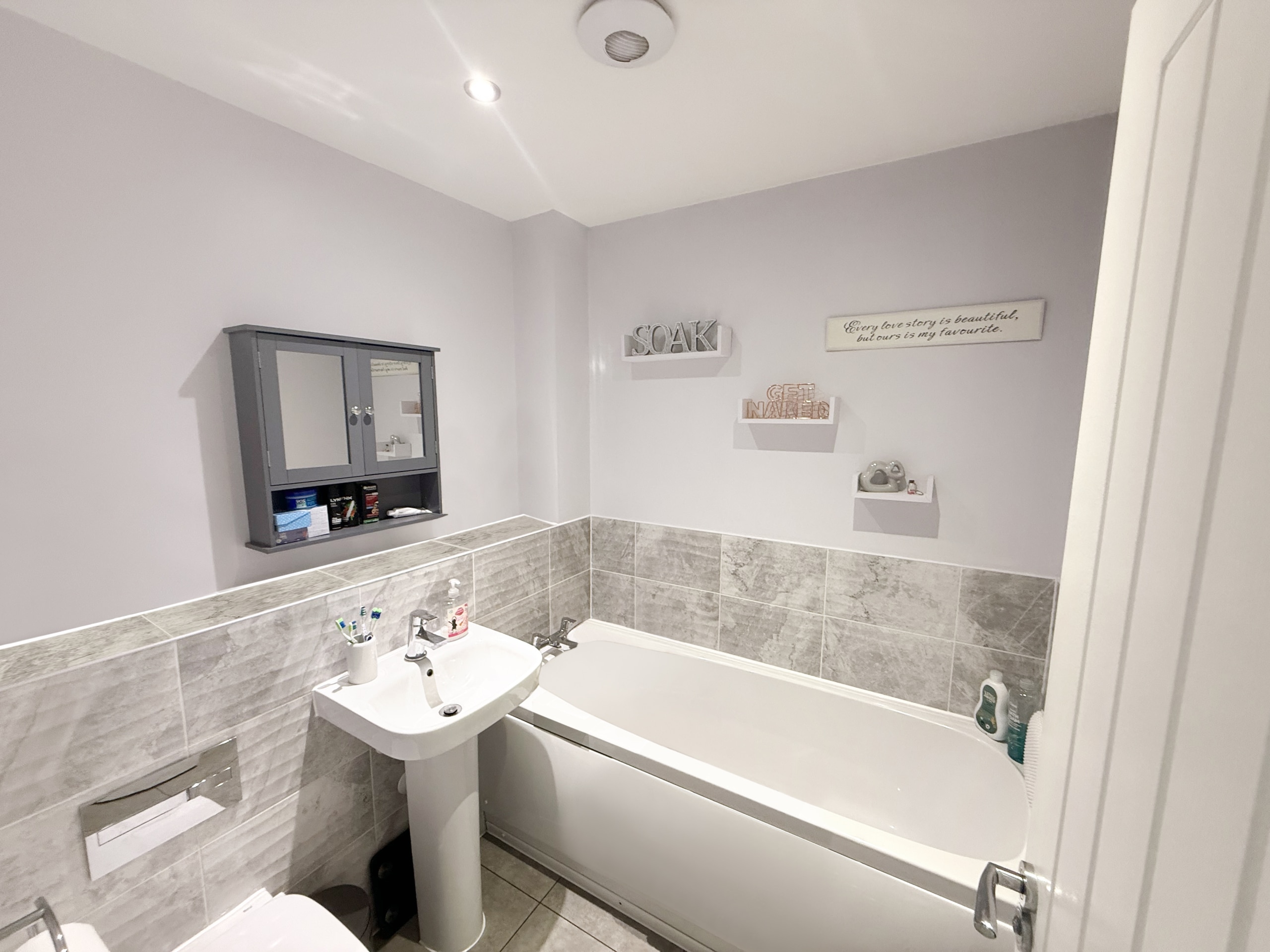 Upstairs, there are two well-proportioned bedrooms, including a generous main bedroom filled with natural light. The second bedroom offers flexibility as a home office, nursery, or guest space, complemented by a stylish family bathroom.