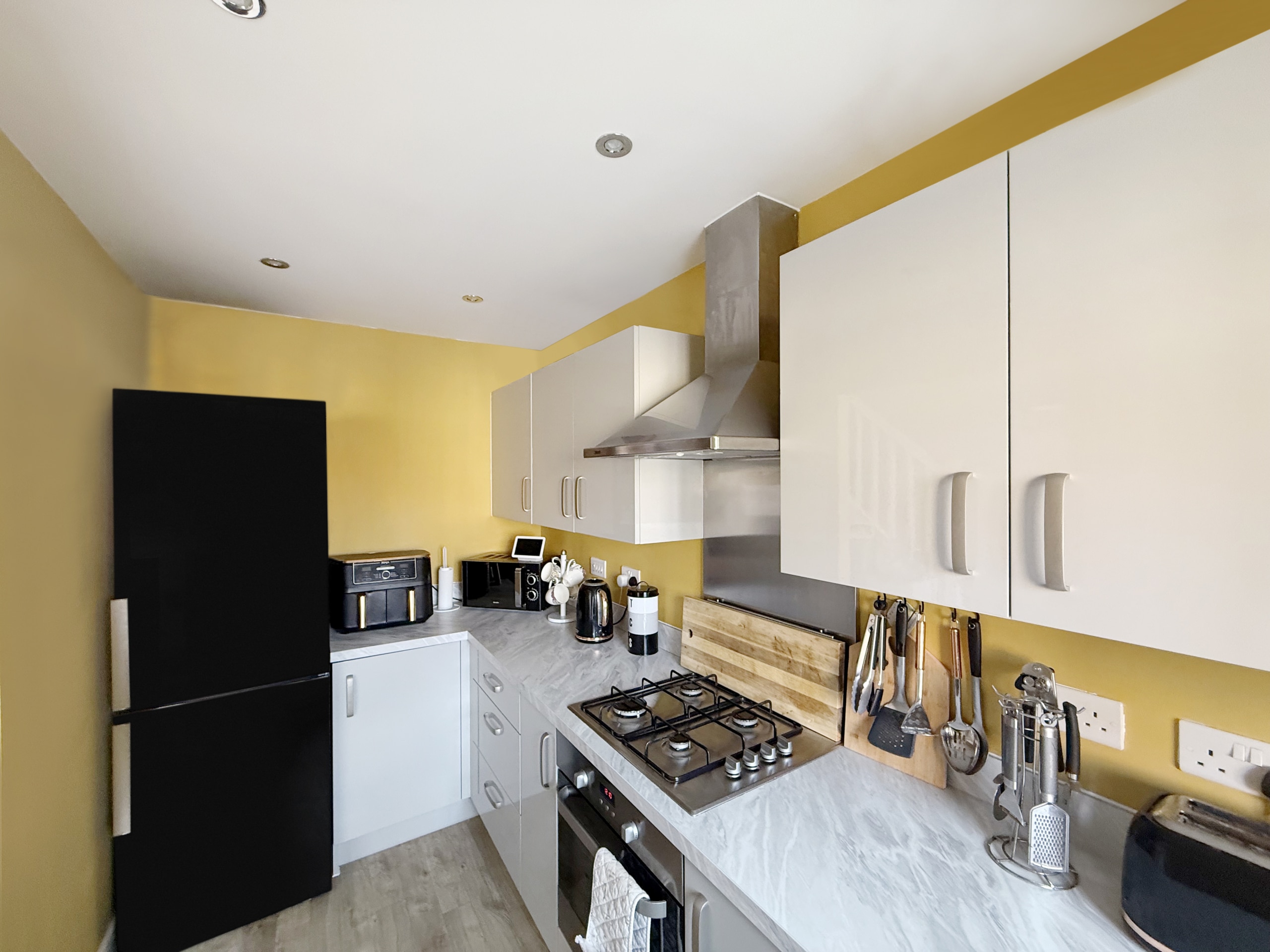 The entrance hallway leads into a contemporary fitted kitchen, complete with sleek finishes and practical storage. To the rear, the open-plan living and dining area provides a spacious hub of the home, enhanced by French doors that open directly onto the garden, creating a seamless indoor-outdoor flow.