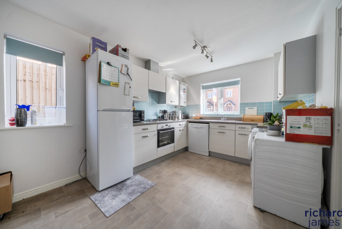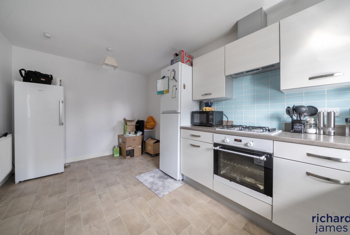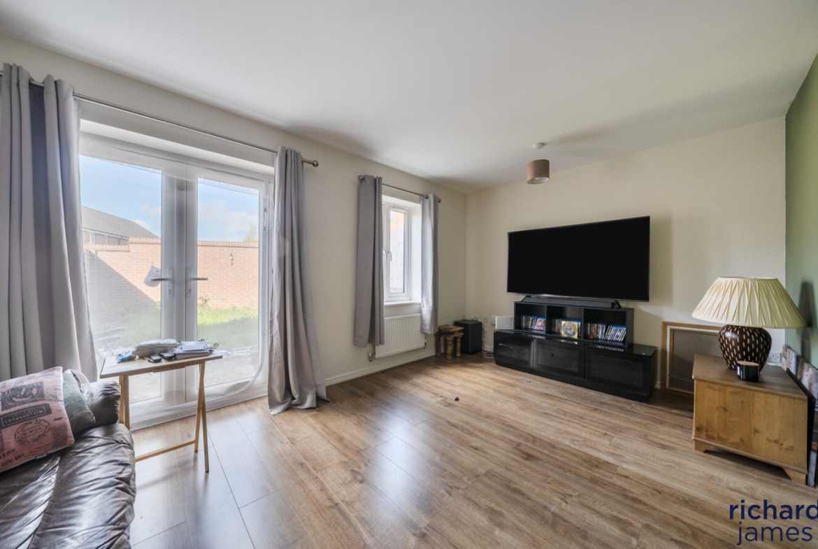 The ground floor is arranged with a contemporary kitchen/dining room positioned to the front of the property, providing an excellent space for everyday living and entertaining. To the rear sits a bright and inviting living room, enjoying direct access to the garden via French doors, creating a seamless connection between indoor and outdoor living. A convenient cloakroom completes the ground floor accommodation.