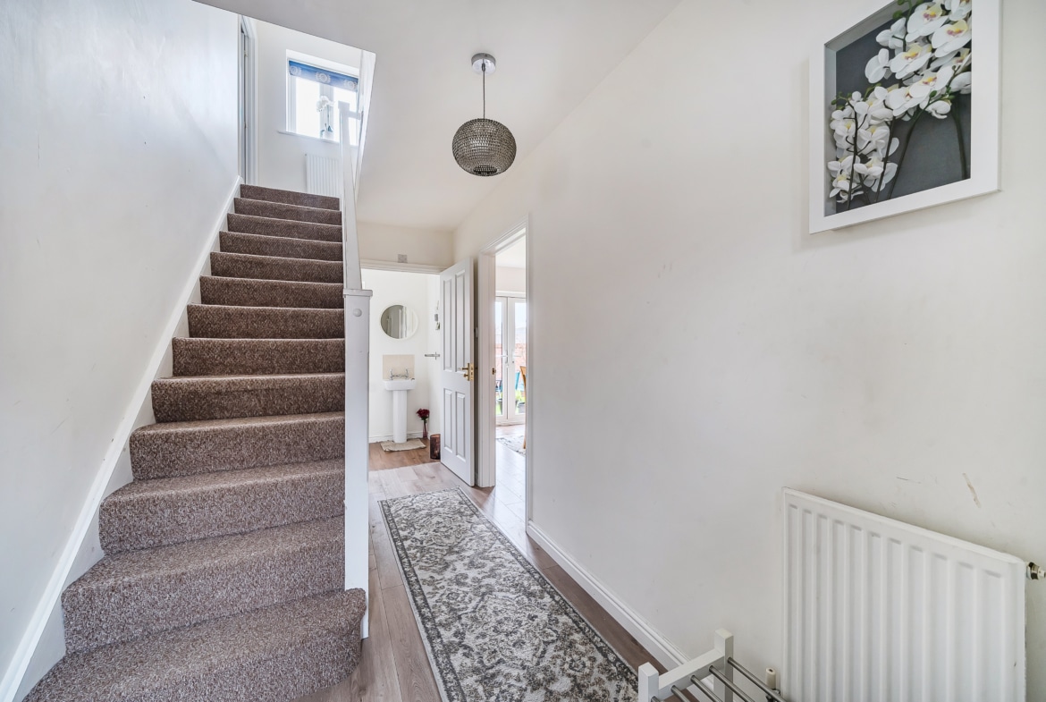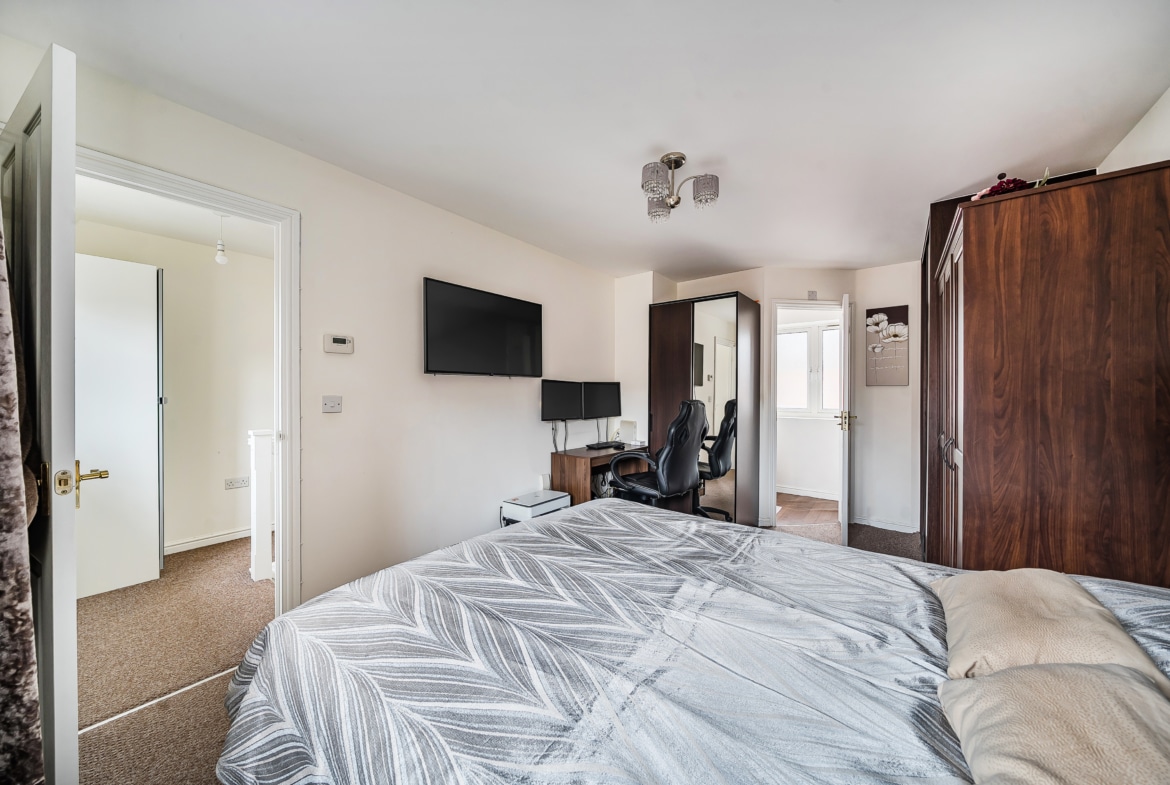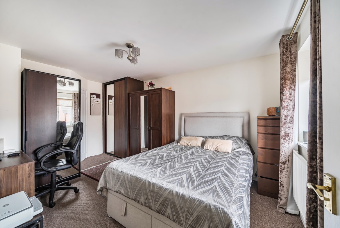 The first floor comprises three bedrooms, with the main bedroom positioned to the front of the property with an en-suite. Two further bedrooms are located to the rear and side. A family bathroom serves all bedrooms and includes a bath with shower over, WC, and wash basin.