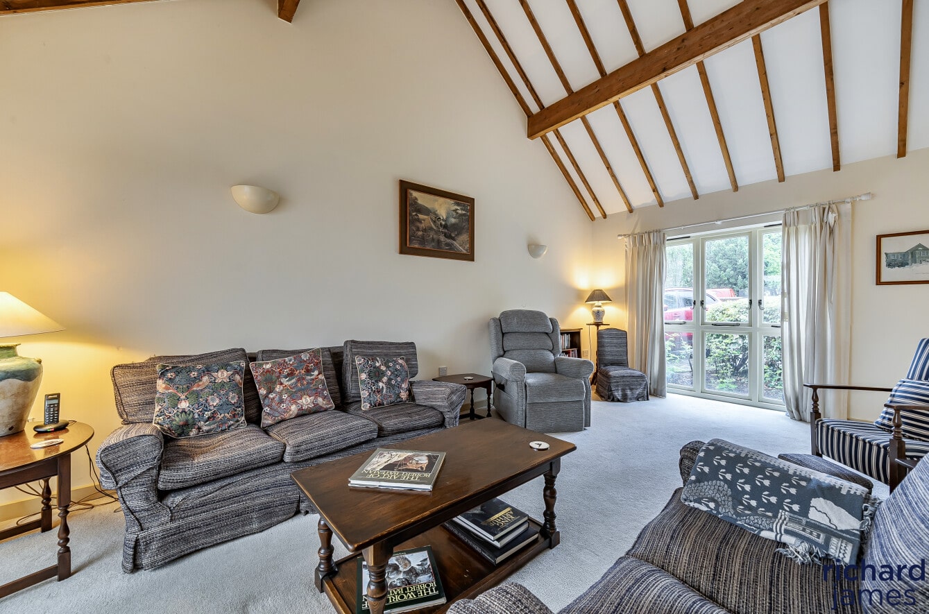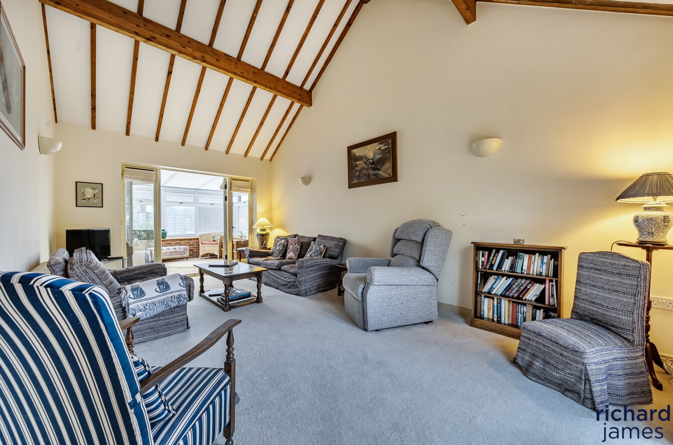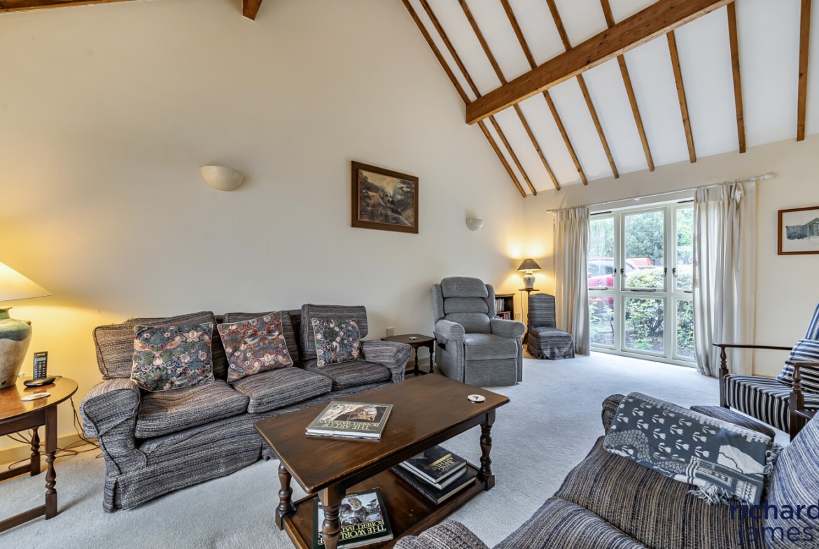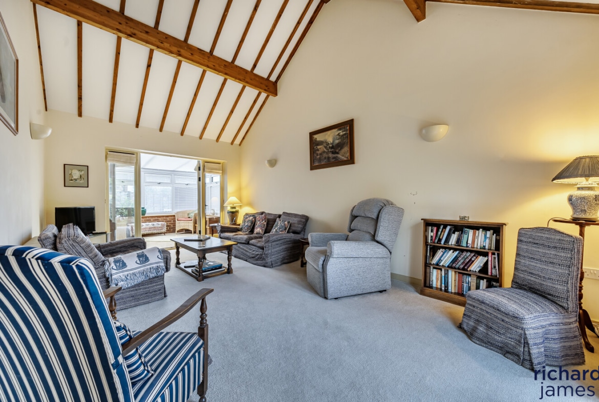The heart of the home is the spacious living room, bathed in natural light from large windows and a vaulted ceiling that enhances the sense of openness. The exposed timber beams add a touch of rustic charm, perfectly complementing the room’s elegant, yet practical design.