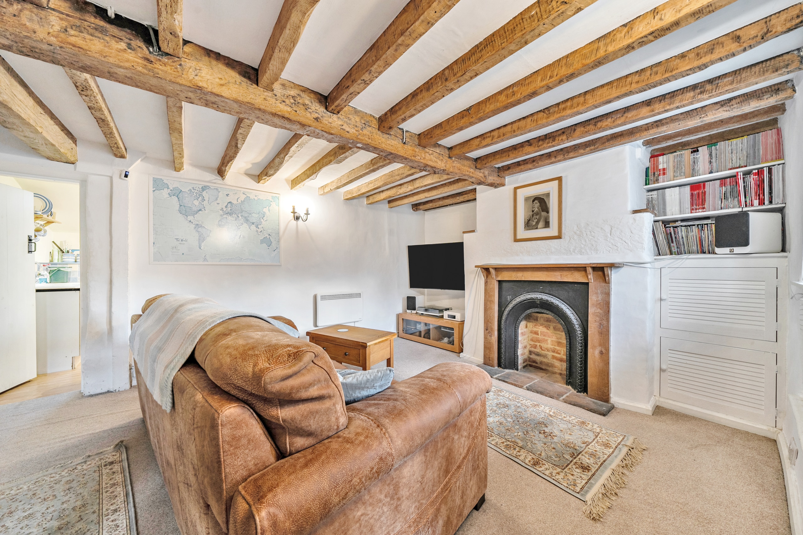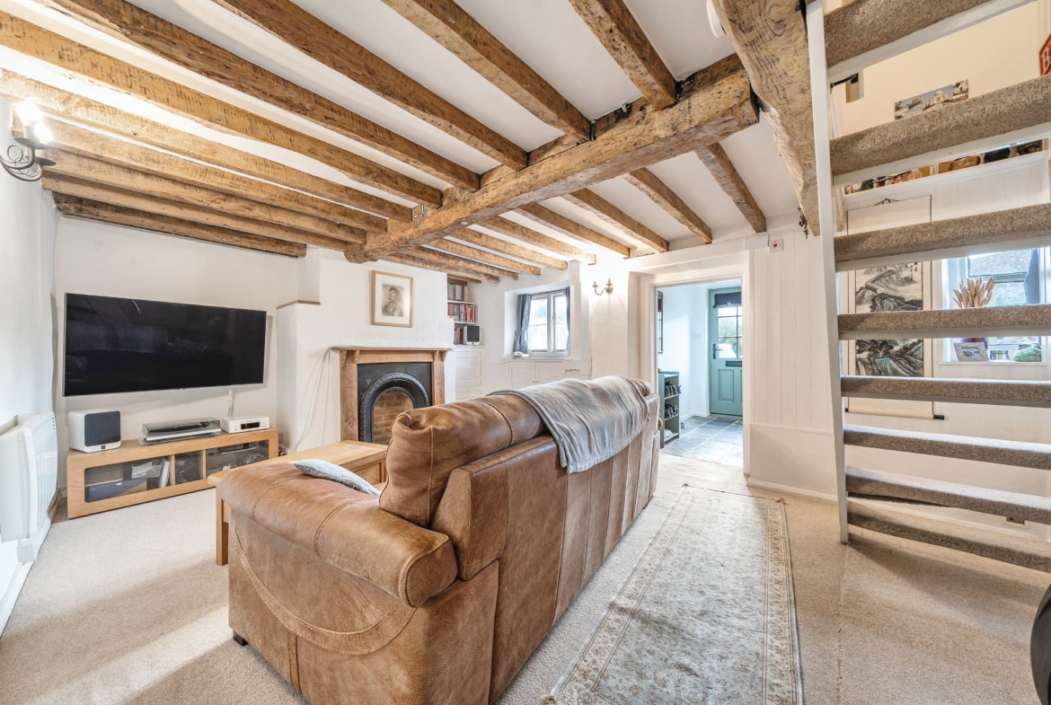 Part of a row of four equally charming thatched cottages, No. 17 occupies a desirable middle terrace position. The entrance leads through a characterful flagstone reception hall into a cosy sitting room, where exposed beams, a brick fireplace with a timber mantle, a tiled hearth, and bespoke recessed cupboards create a warm and inviting ambiance. Open stairs ascend to the first floor, enhancing the sense of space.