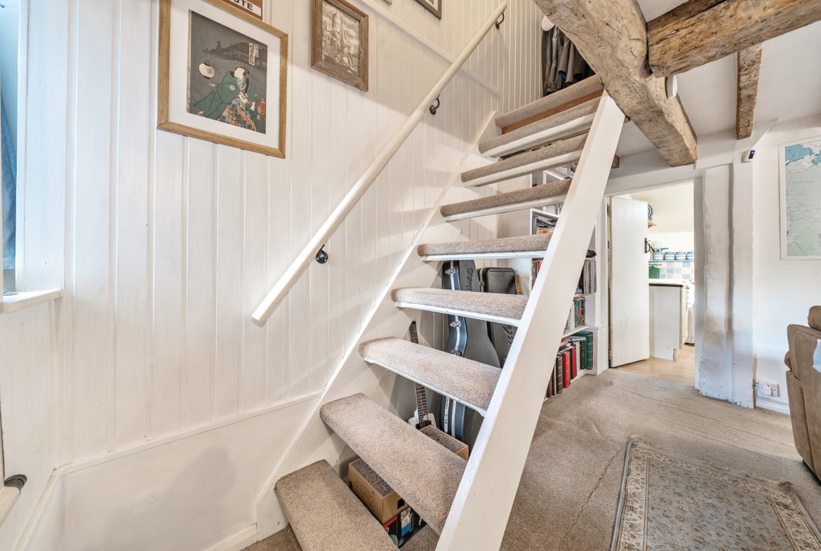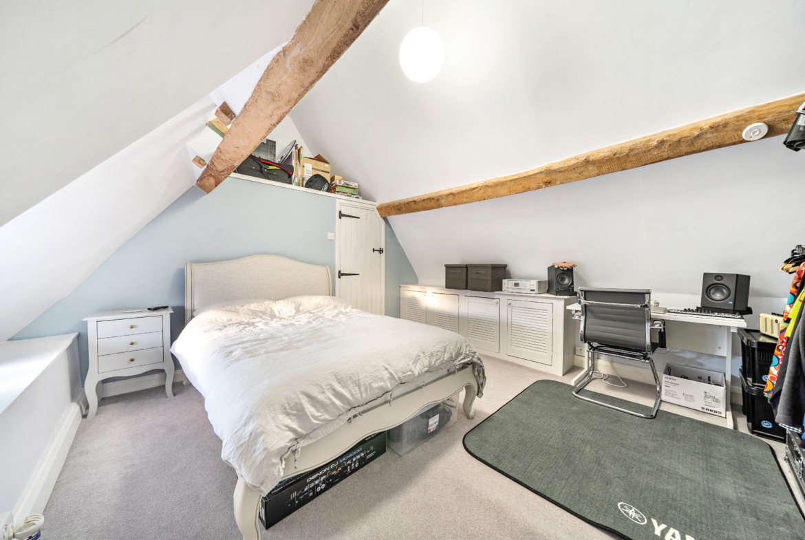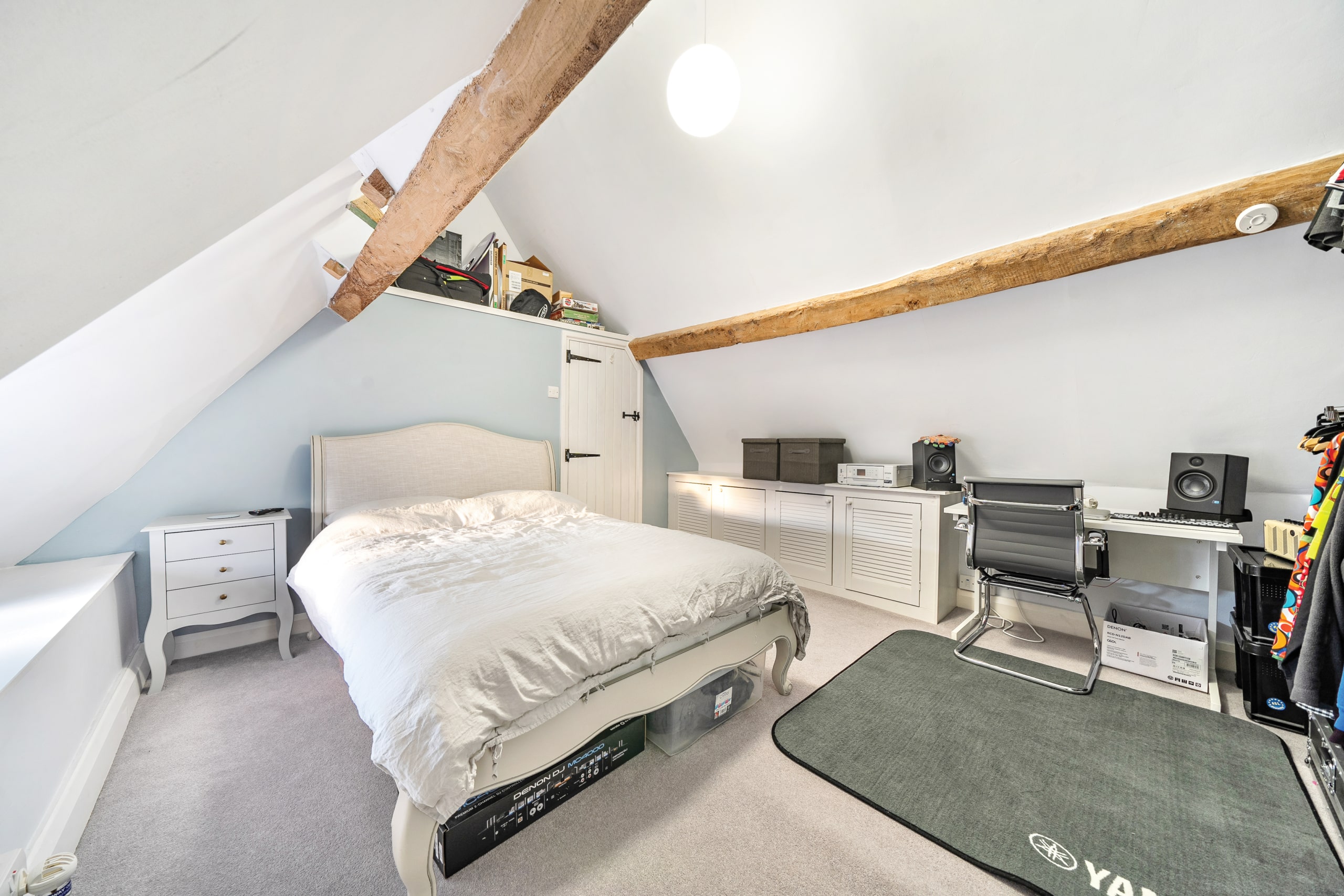 Upstairs, the charming double bedroom enjoys views over the front aspect and benefits from built-in storage within the eaves.