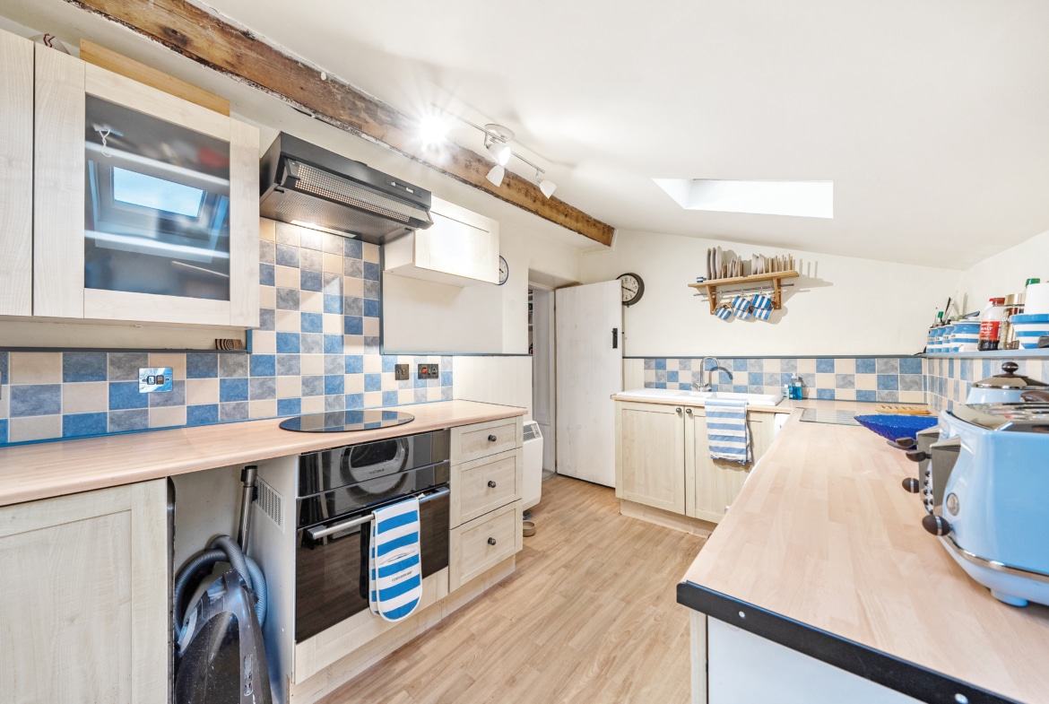 The kitchen is flooded with natural light, thanks to both a window and twin Velux skylights.