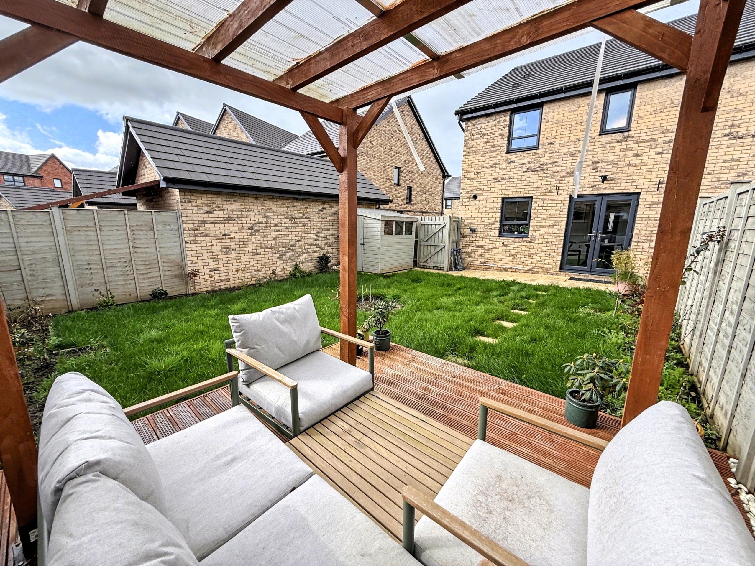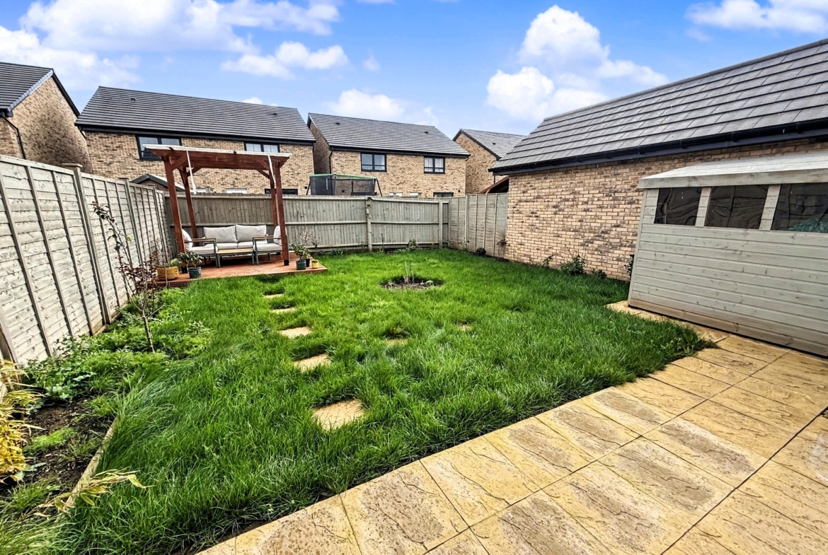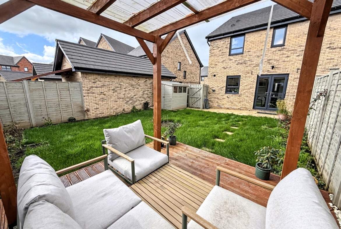 To the outside, to the front, is a well stocked shrub garden with path to front door and driveway to side providing off road parking and EV charging point. With the good sized Rear Garden, offering patio area, opening to lawn with pergola to rear with seating space under.