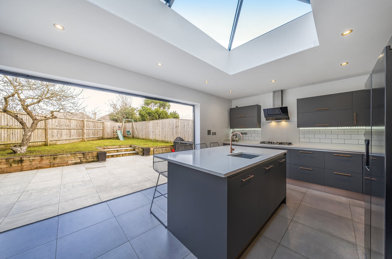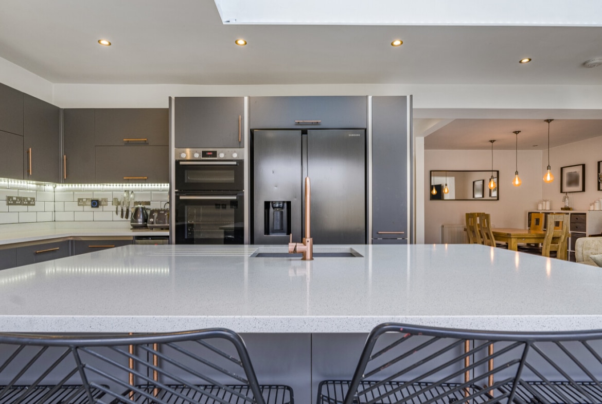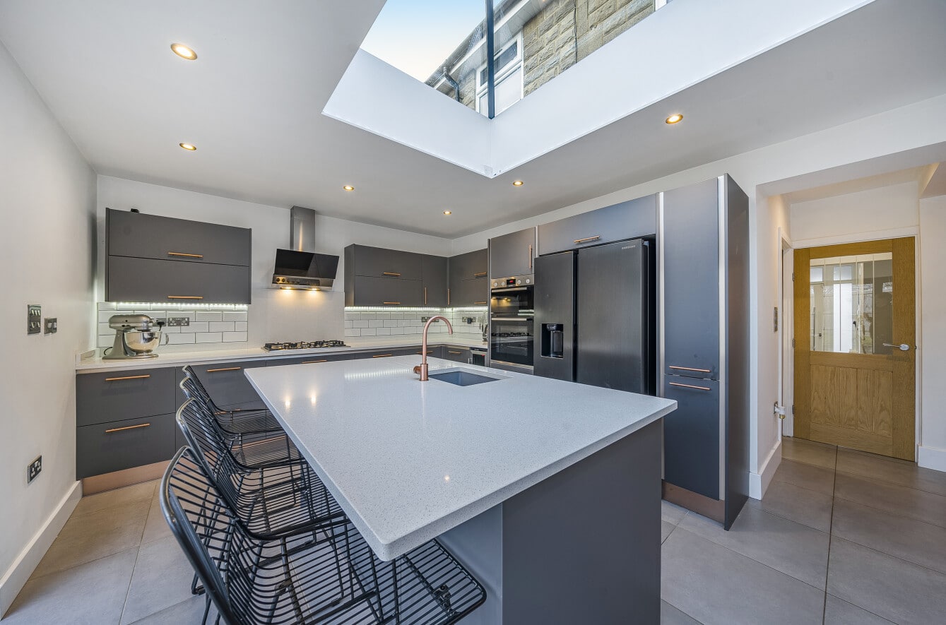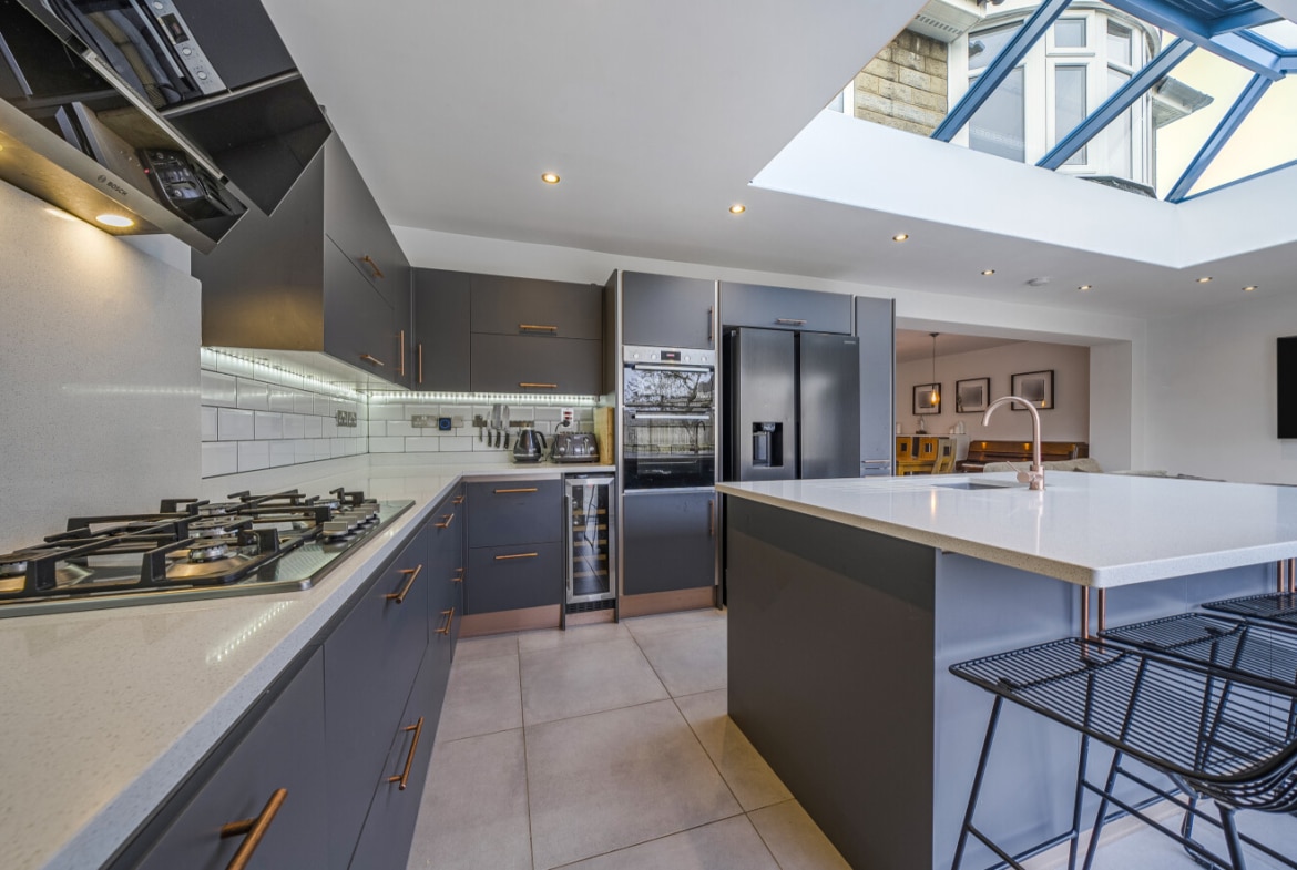 This double bay fronted, character home, has been thoughtfully extended to provide ample living space for all the family to enjoy. The well appointed accommodation includes: Hall with useful storage system, Sitting Room with bay window and inset log burner, modern Cloakroom and the superb 25′ x 24′ max refitted Kitchen/Dining/Family Room, which enjoys under floor heating, lantern roof, as well as an extensively refitted Kitchen with integrated Bosch appliances, island unit and bi-fold doors opening into the landscaped Rear Garden. As well as, a generous sized refitted Utility Room and door into the Garage. To the first floor, you’ll find the Four Bedrooms with refitted Ensuite Shower Room to Bedroom One and a further refitted Family Bathroom, with four piece suite, to the first floor.