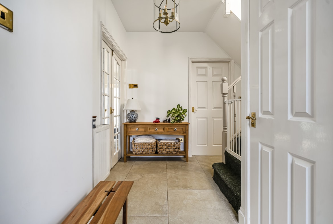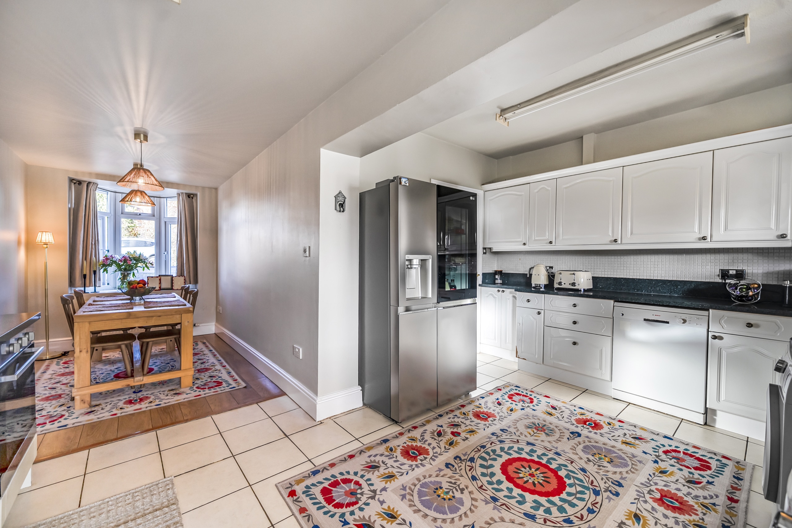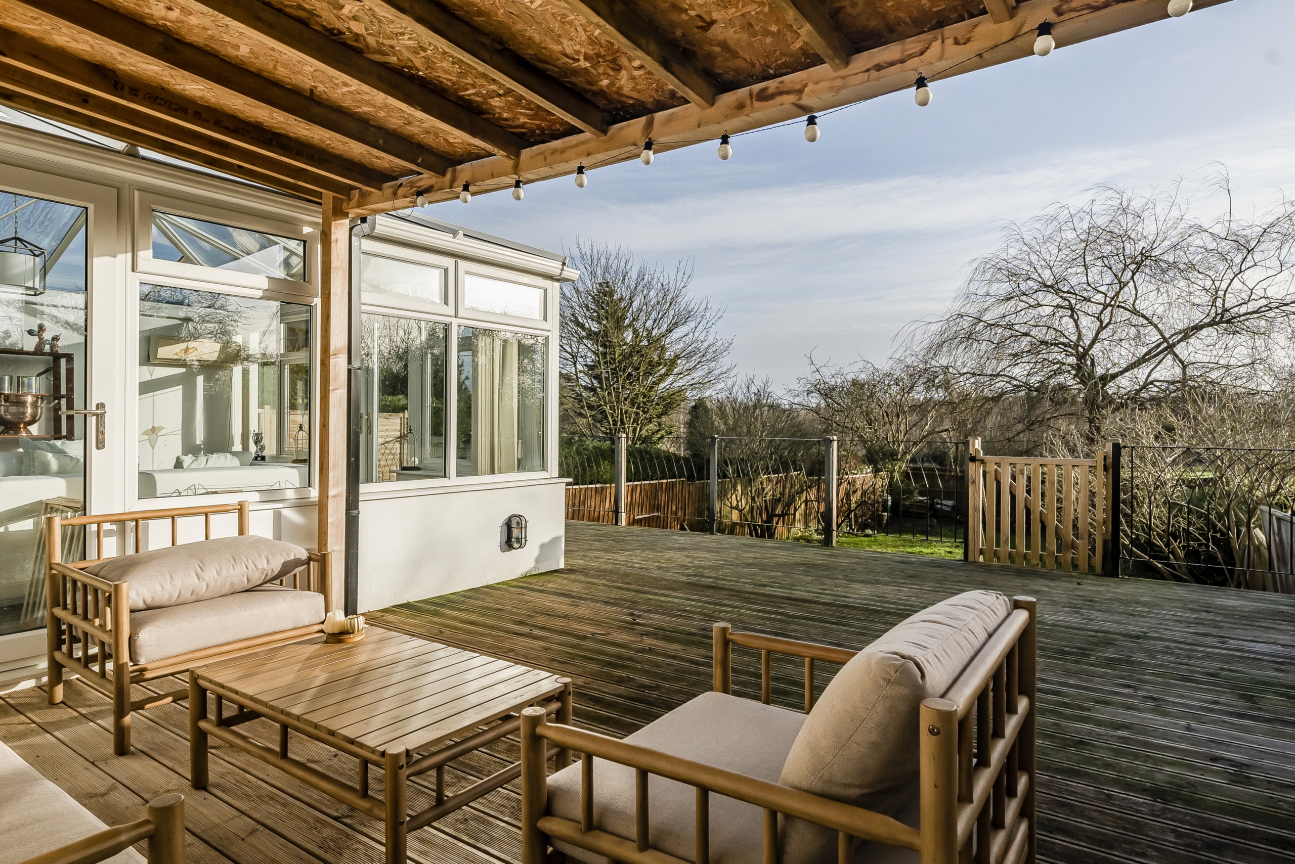 Outside, the property impresses with a block-paved driveway, parking for three vehicles. The rear garden, ideal for outdoor entertaining, opens onto the picturesque Polo Ground with a serene gated entrance. An extensive decked area leads to a lush lawn enclosed by mature shrubs, offering a peaceful outdoor retreat.