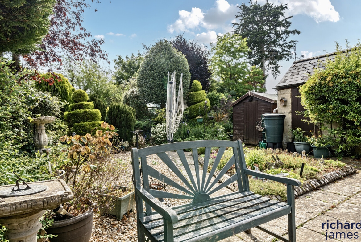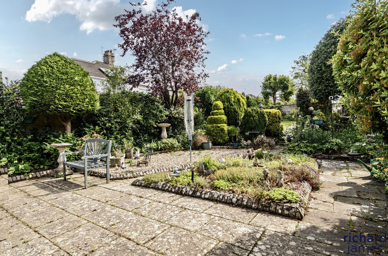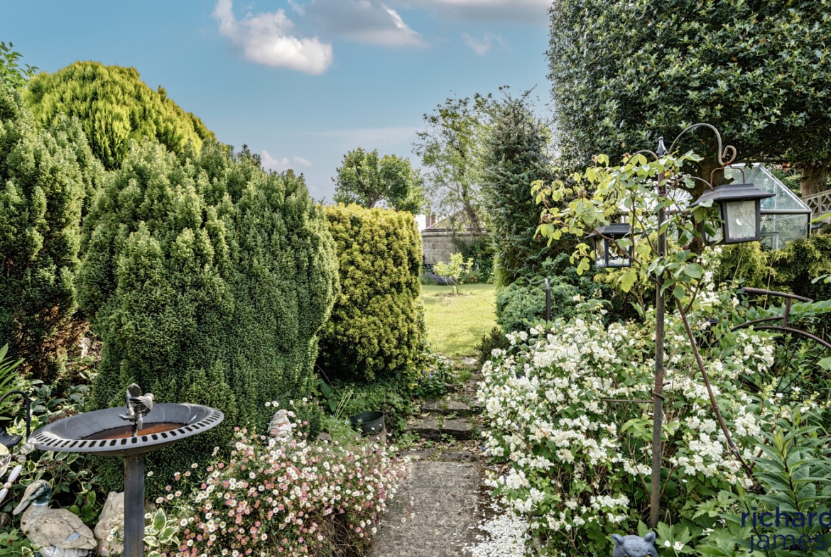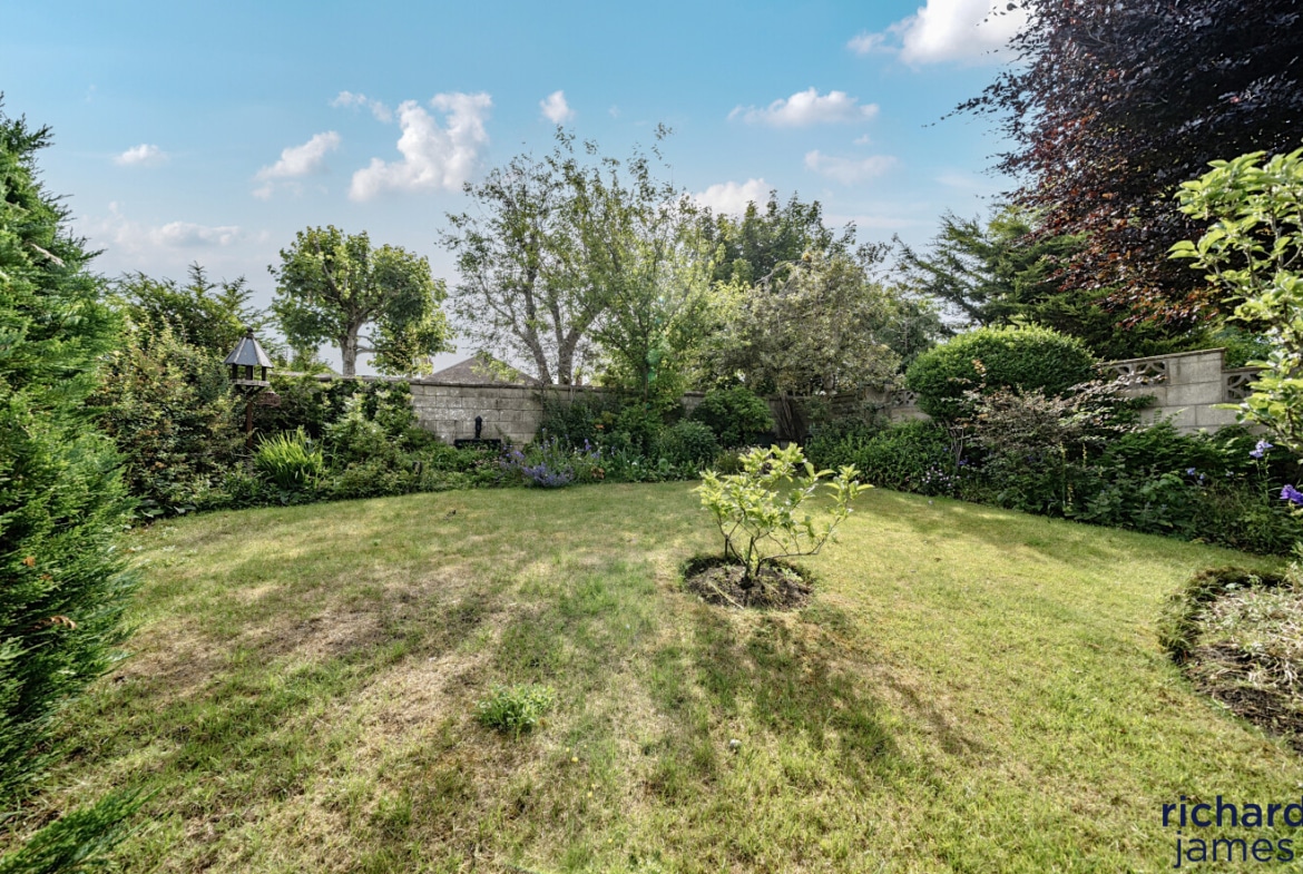 To the rear is a spacious rear garden with a patio seating and barbecue area leading to a generous lawn. There is also a detached garage and an outside W.C.