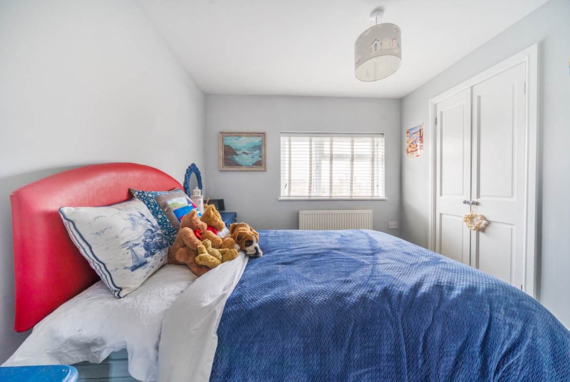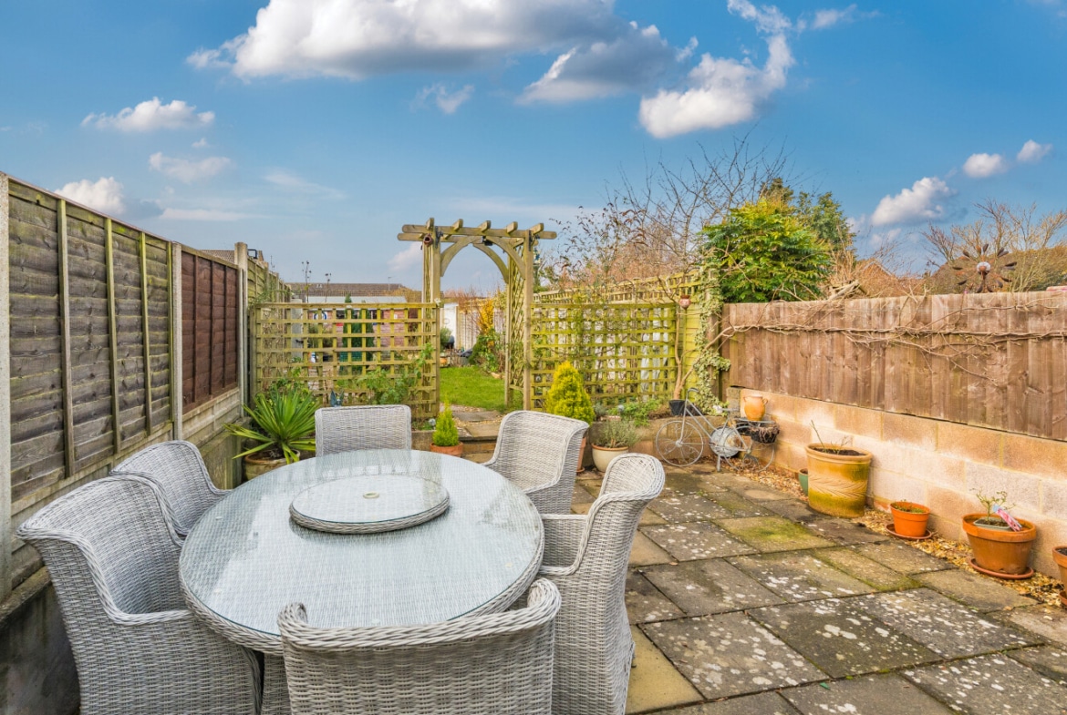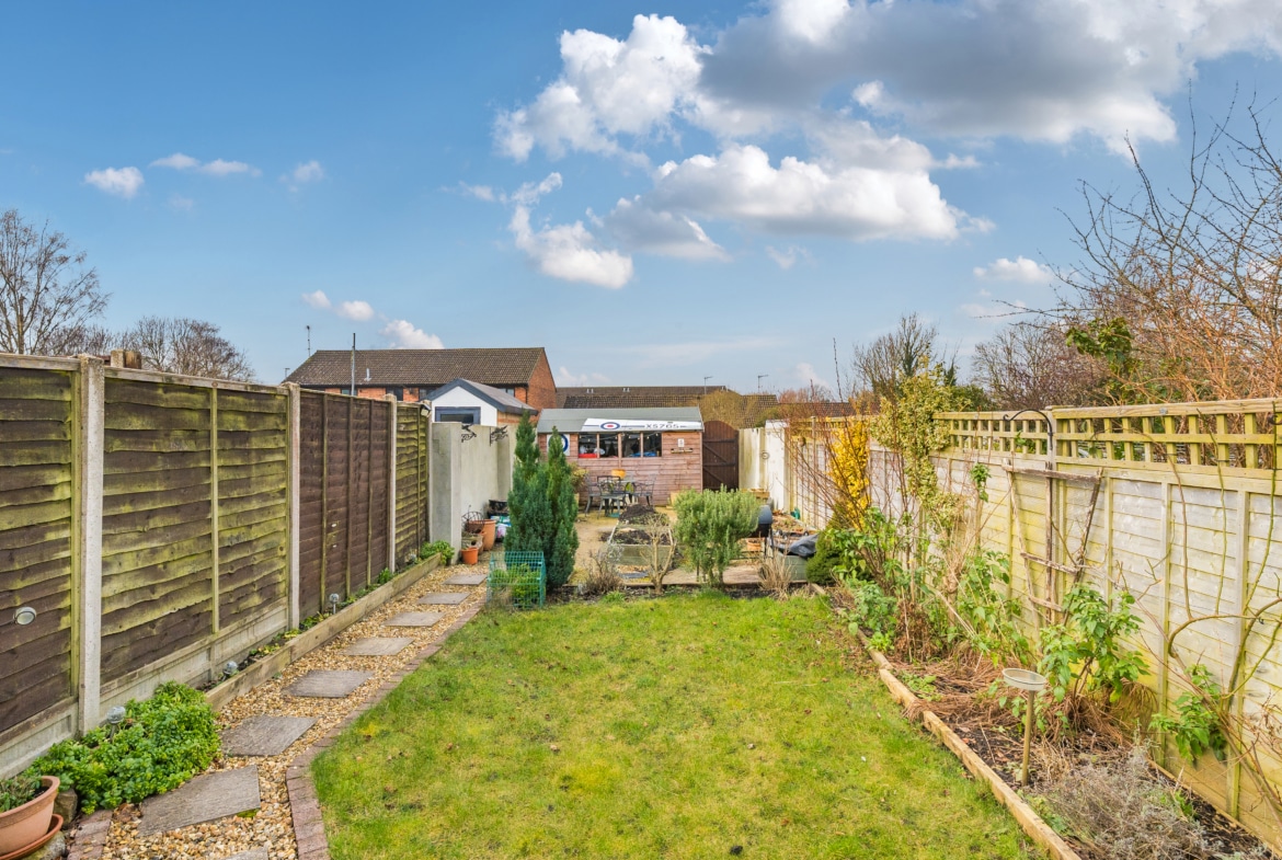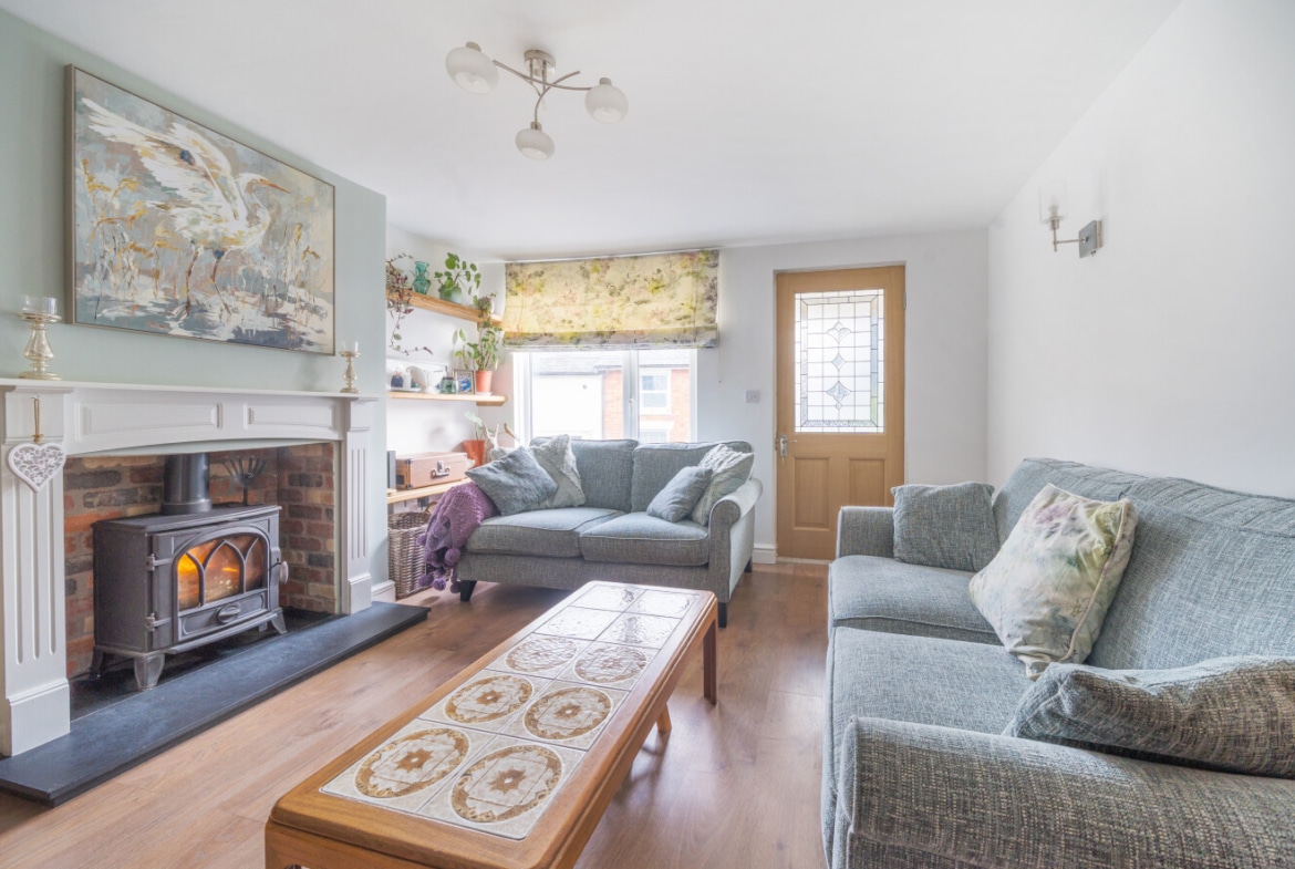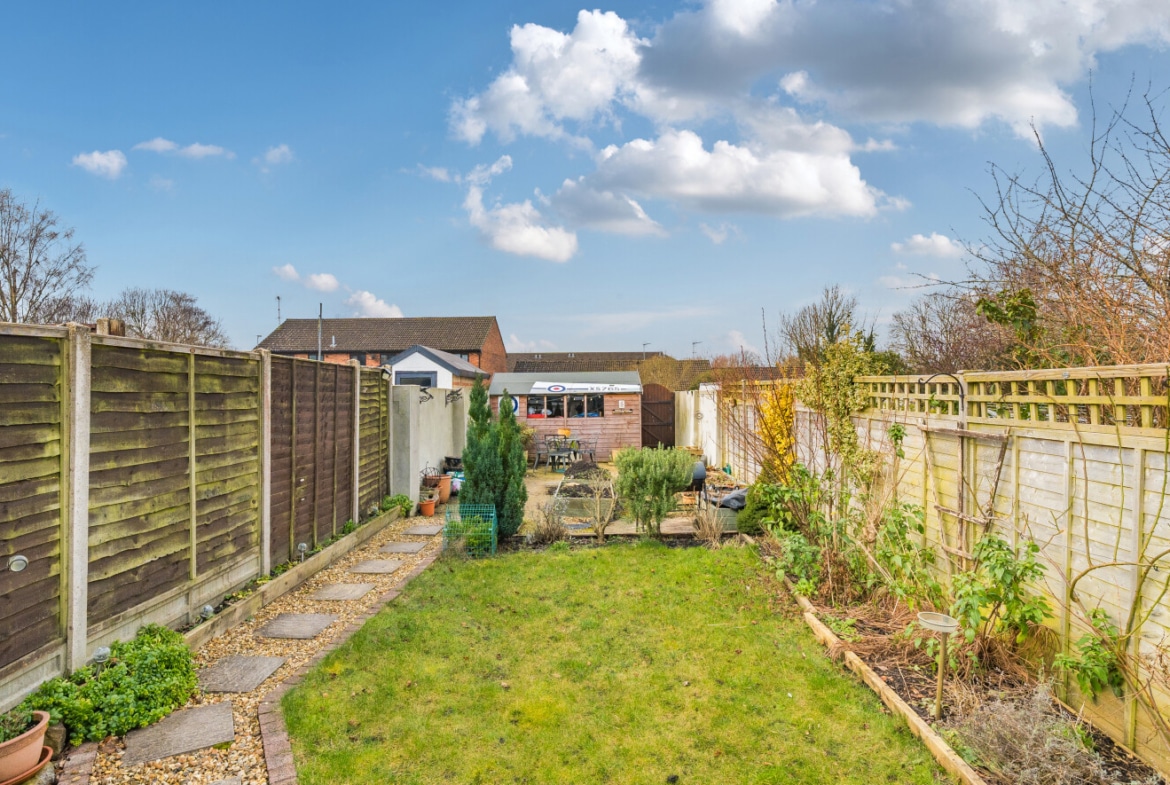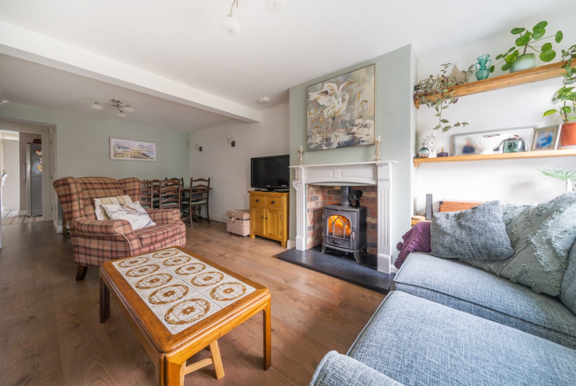 The well presented accommodation includes: Entrance Porch, 20′ Living Room with log burner, Cloakroom, separate Utility Room and the lovely refitted Kitchen/Breakfast Room is light, spacious with integrated appliances and PVCu double doors opening into the Rear Garden. With the two double Bedrooms, both with built-in wardrobes and a refitted Family Bathroom, is located on the first floor.