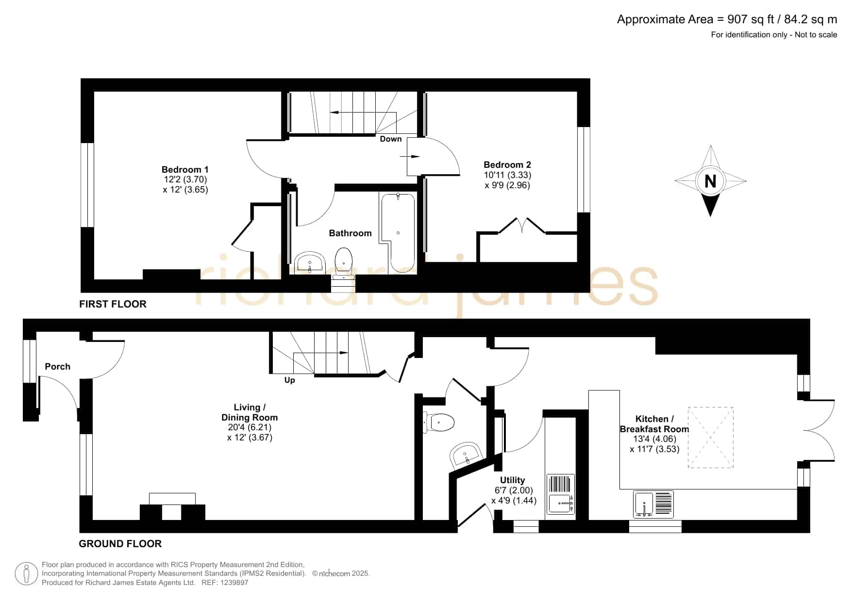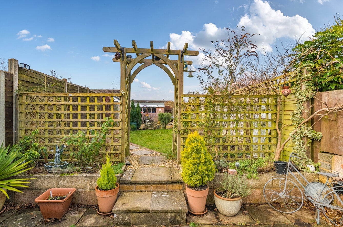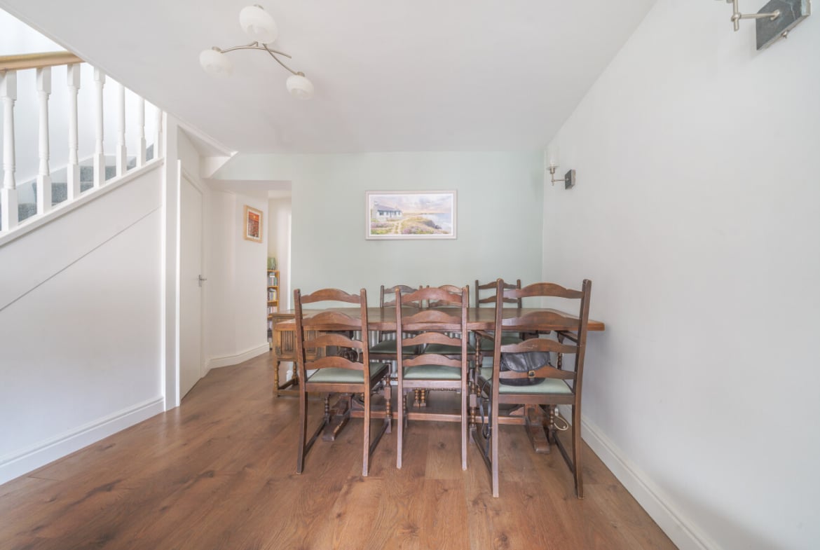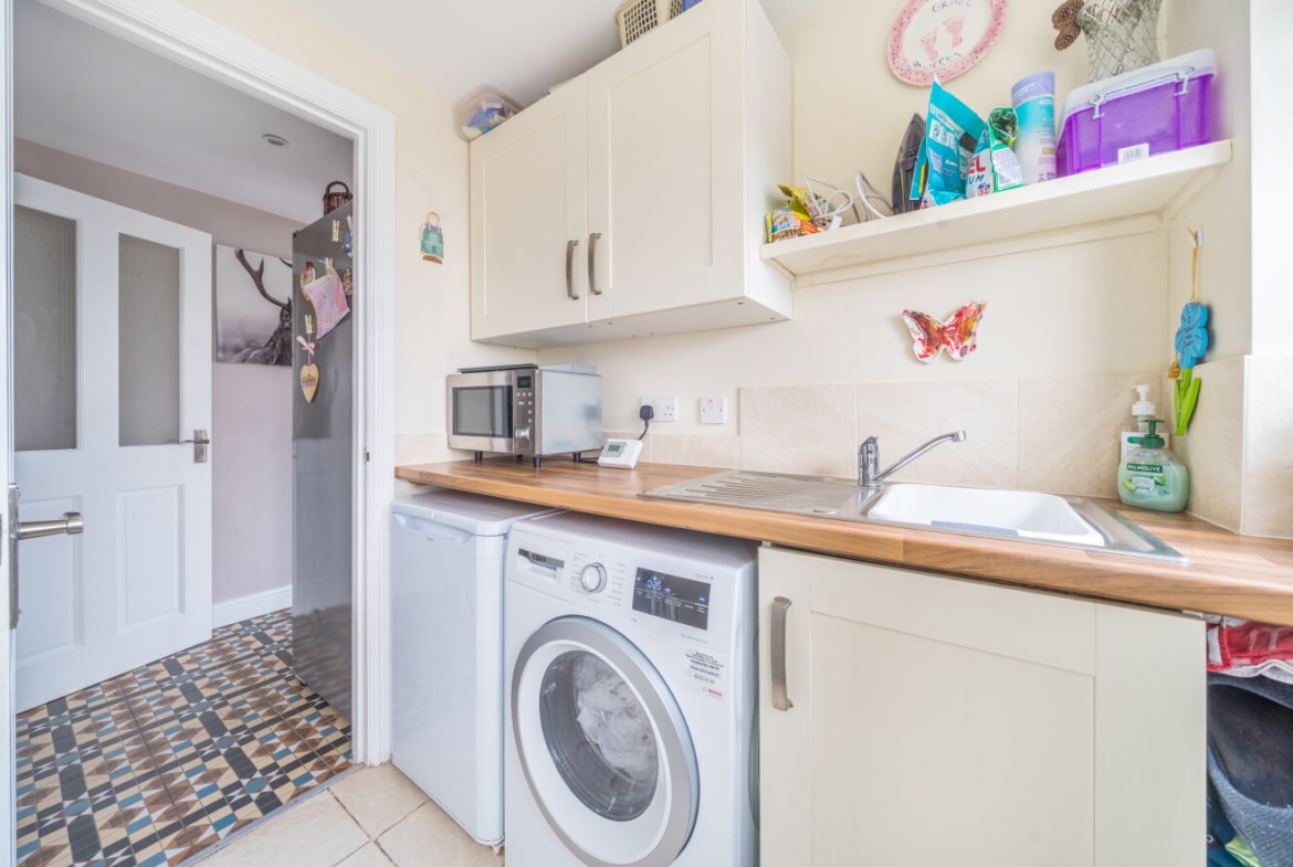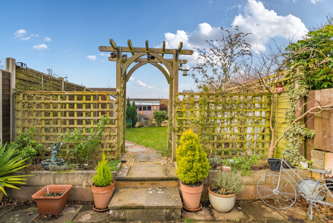 The well presented accommodation includes: Entrance Porch, 20′ Living Room with log burner, Cloakroom, separate Utility Room and the lovely refitted Kitchen/Breakfast Room is light, spacious with integrated appliances and PVCu double doors opening into the Rear Garden. With the two double Bedrooms, both with built-in wardrobes and a refitted Family Bathroom, is located on the first floor.