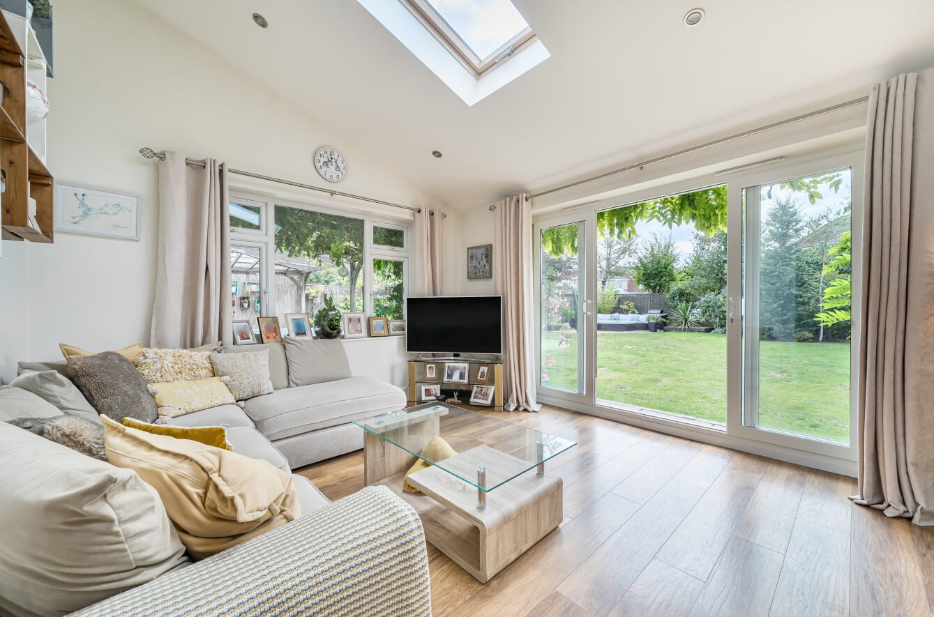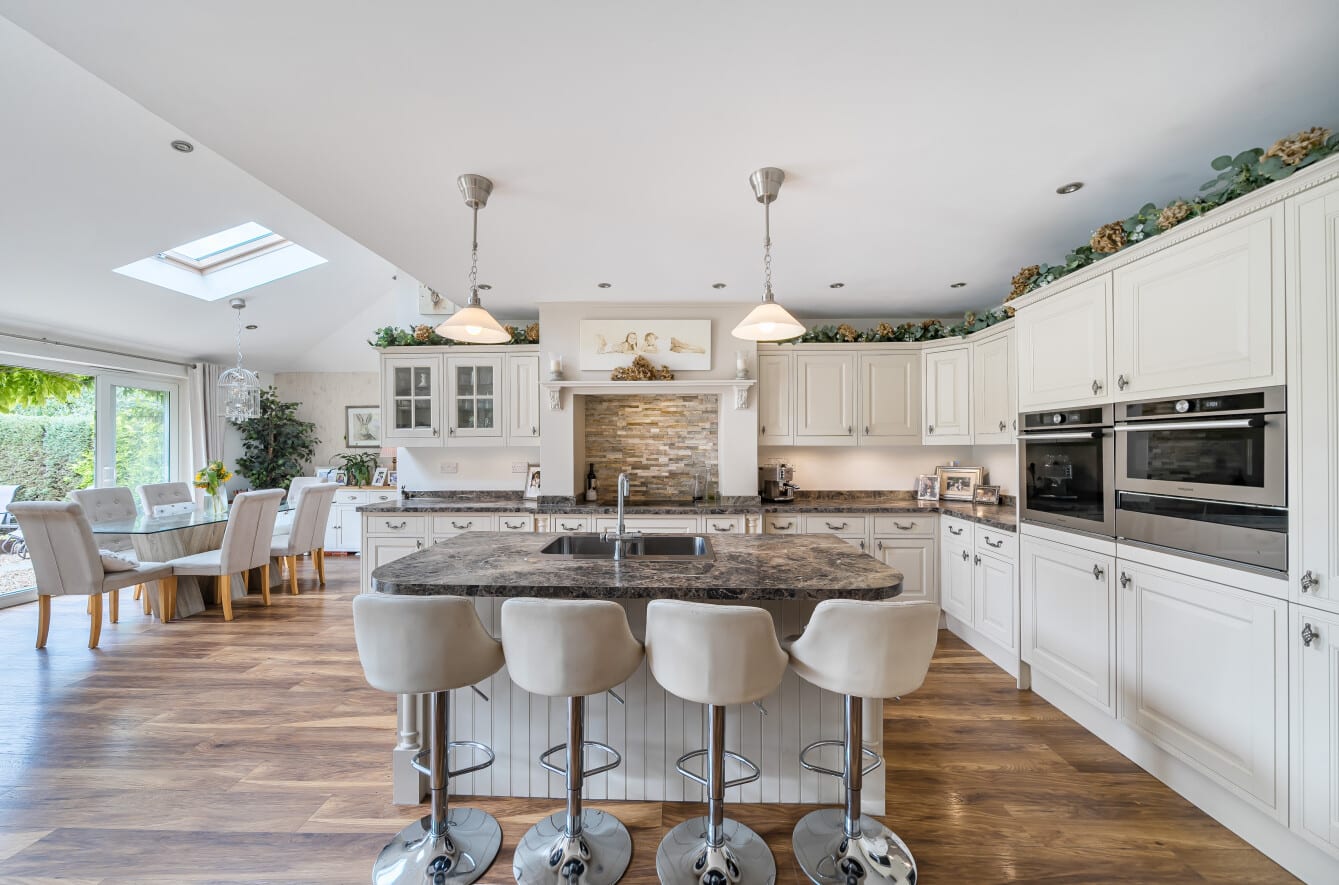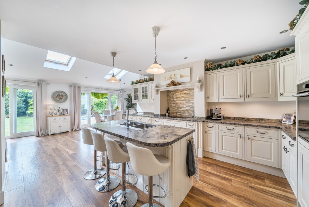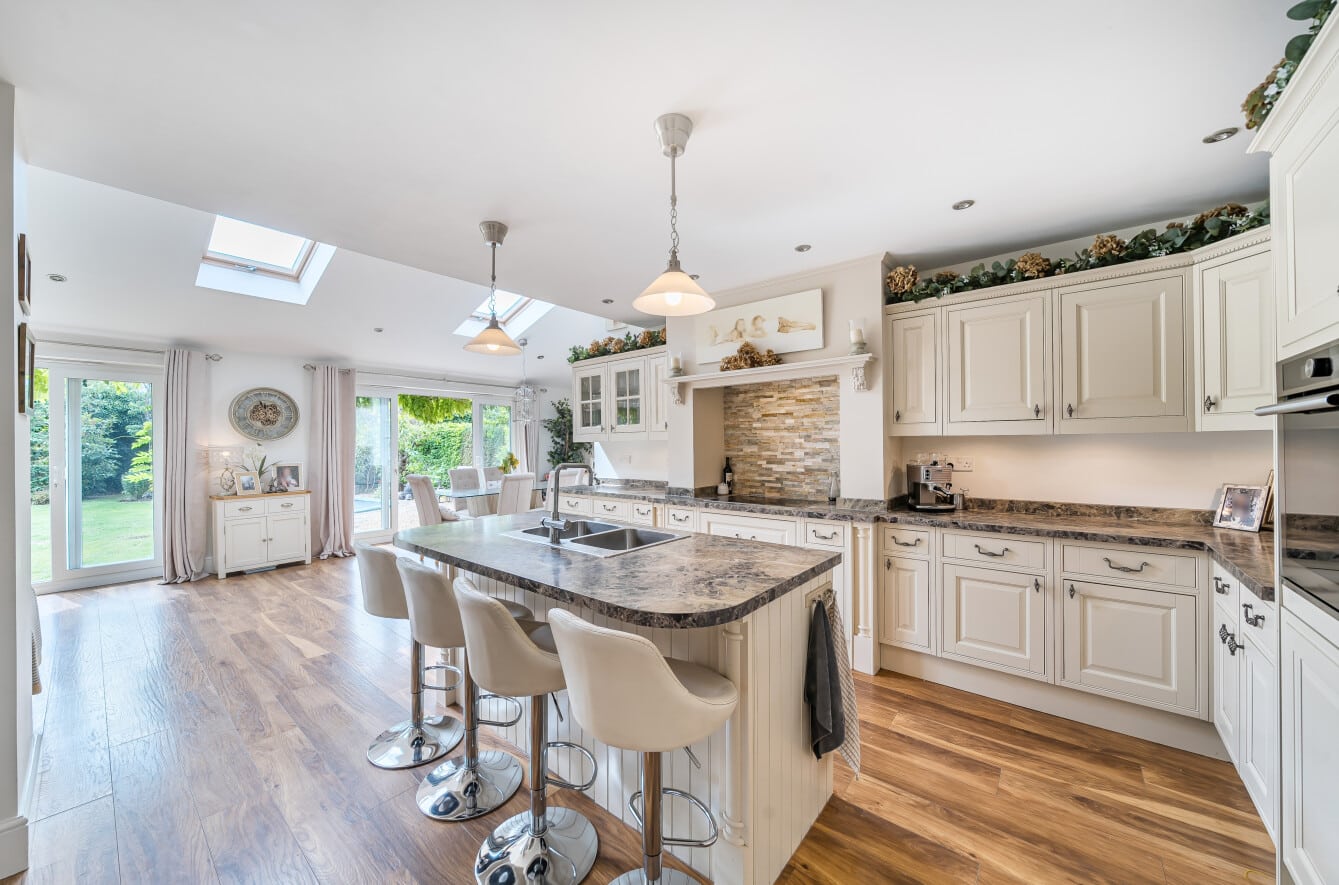 On the right-hand side, the heart of the home is an impressive open-plan kitchen/dining/lounge area. With a central island, Velux windows, Vaulted ceilings, multiple sets of doors to the garden, and abundant worktop space, this area is flooded with natural light and offers a grand yet welcoming feel. A discreet utility room, downstairs shower room, and internal access to the garage add practicality to the layout.