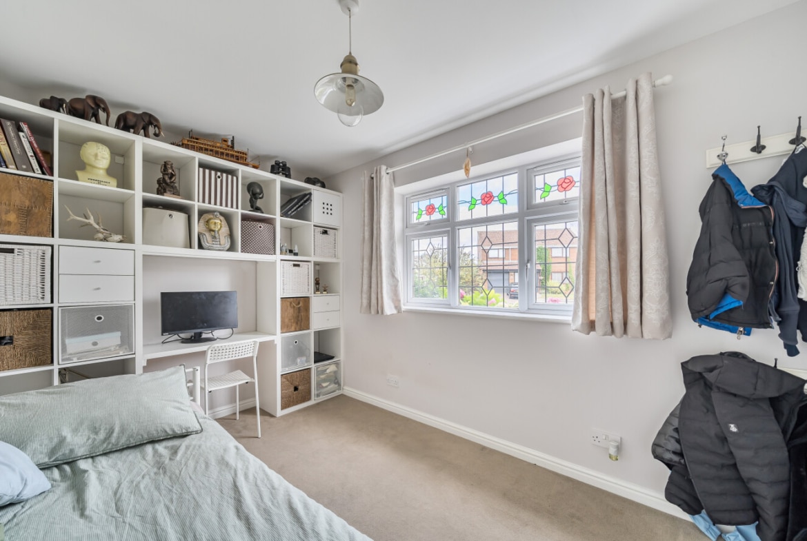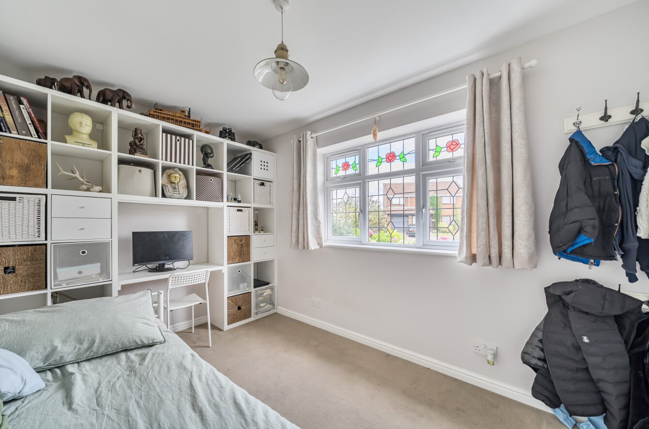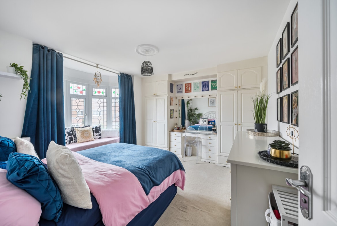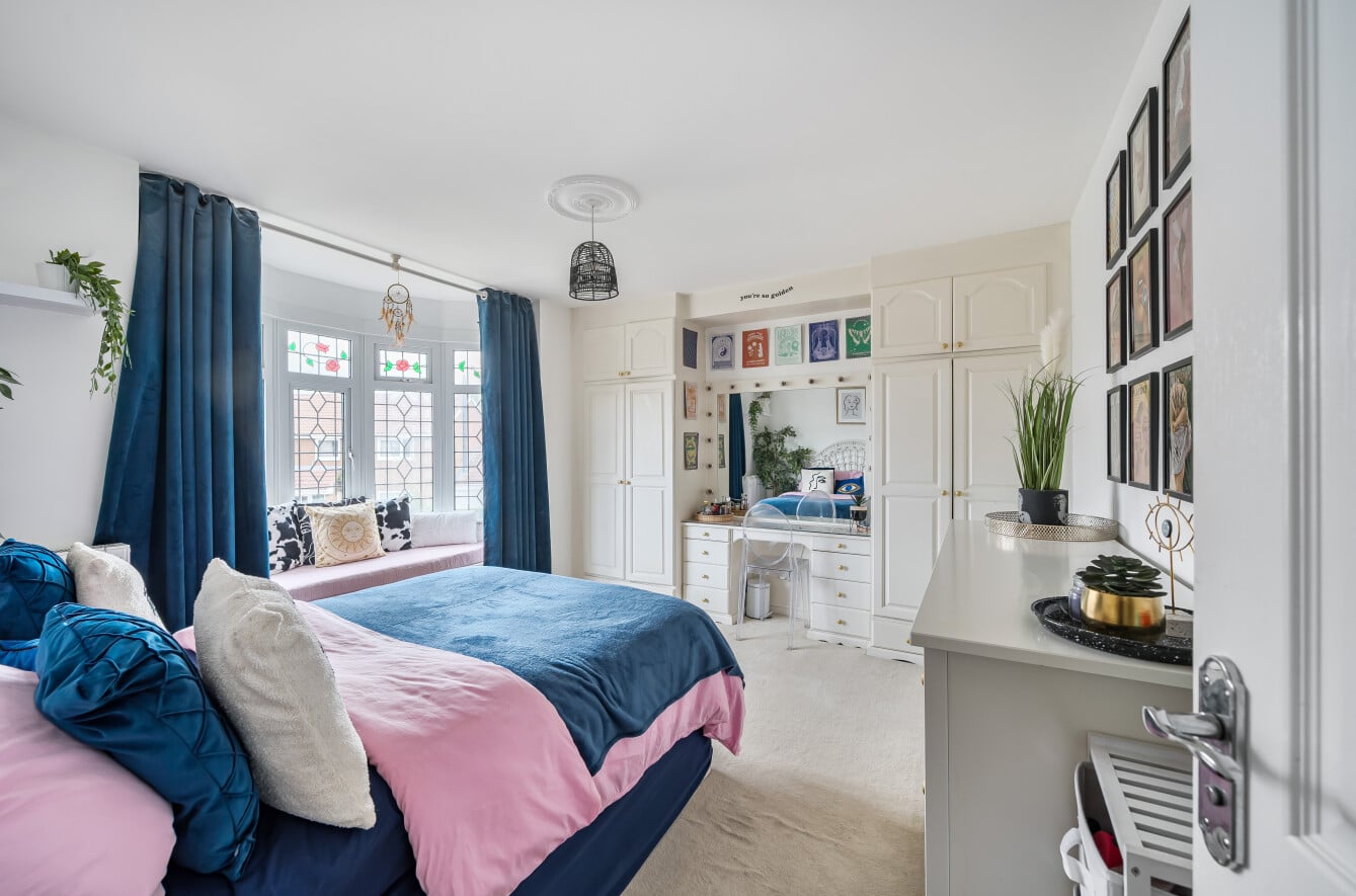 The extension has created an exceptional upstairs footprint, allowing for five generous bedrooms. The principal bedroom offers garden views, built-in wardrobes, and a stylish en-suite. A second large bay-fronted bedroom overlooks the front, while the third double enjoys views of the garden. The fifth bedroom features a charming, characterful window, and the fourth bedroom—currently set up as two separate areas with a stud wall—can easily be returned to a single, spacious room. The luxurious family bathroom boasts a roll-top bath and a separate shower.
