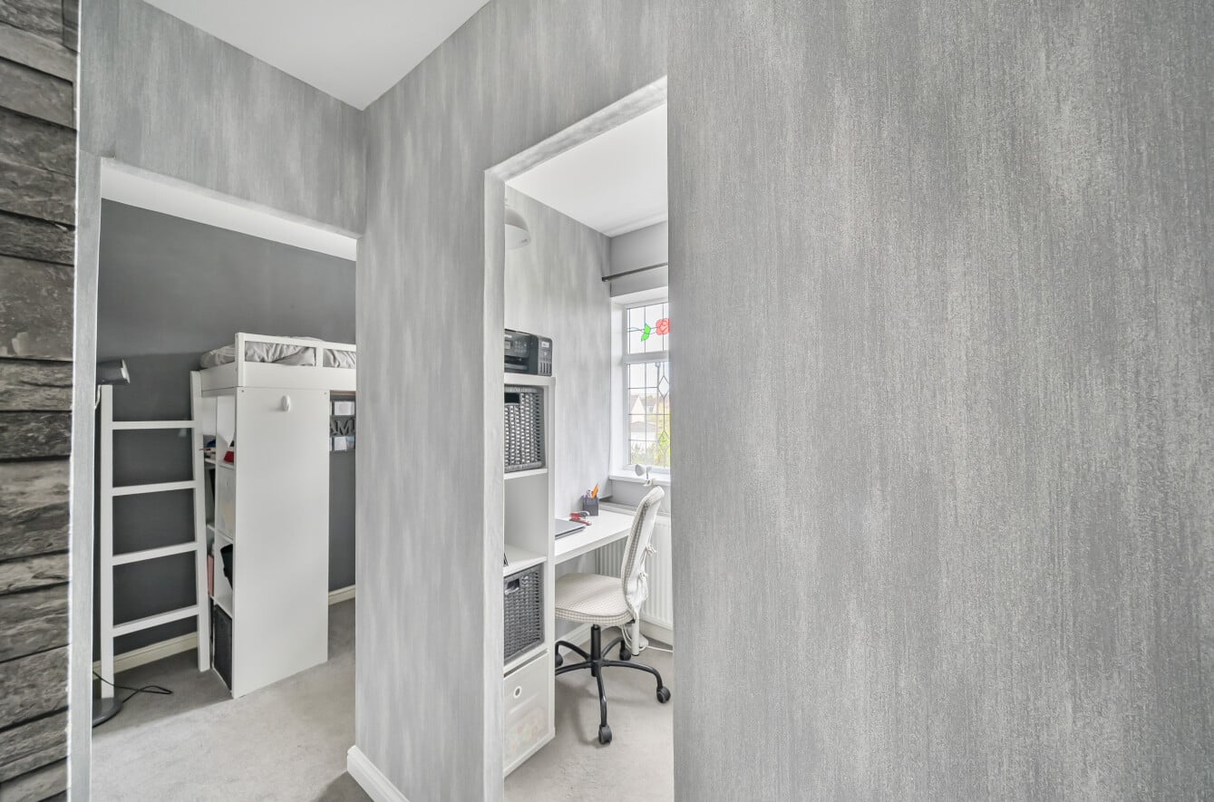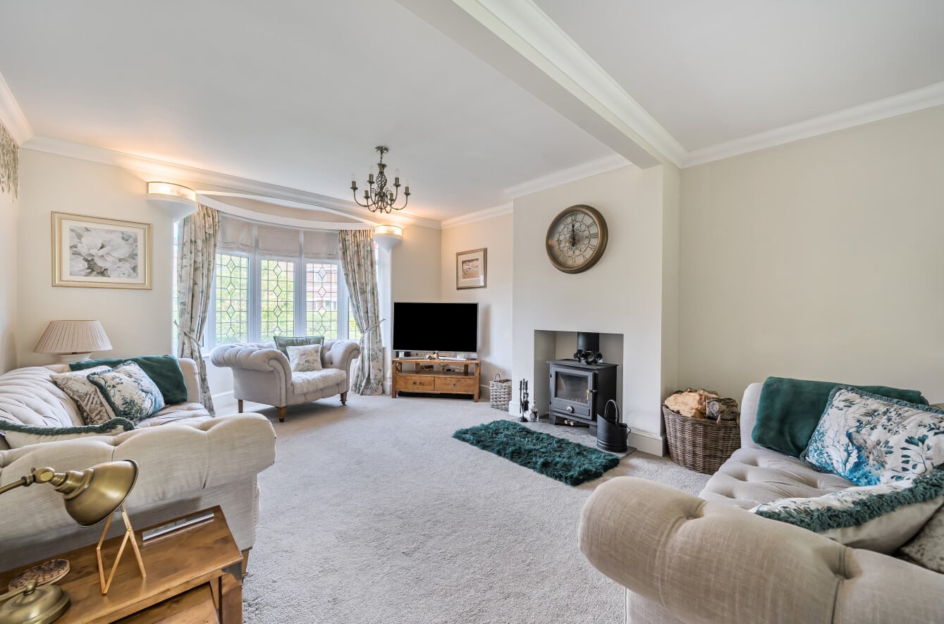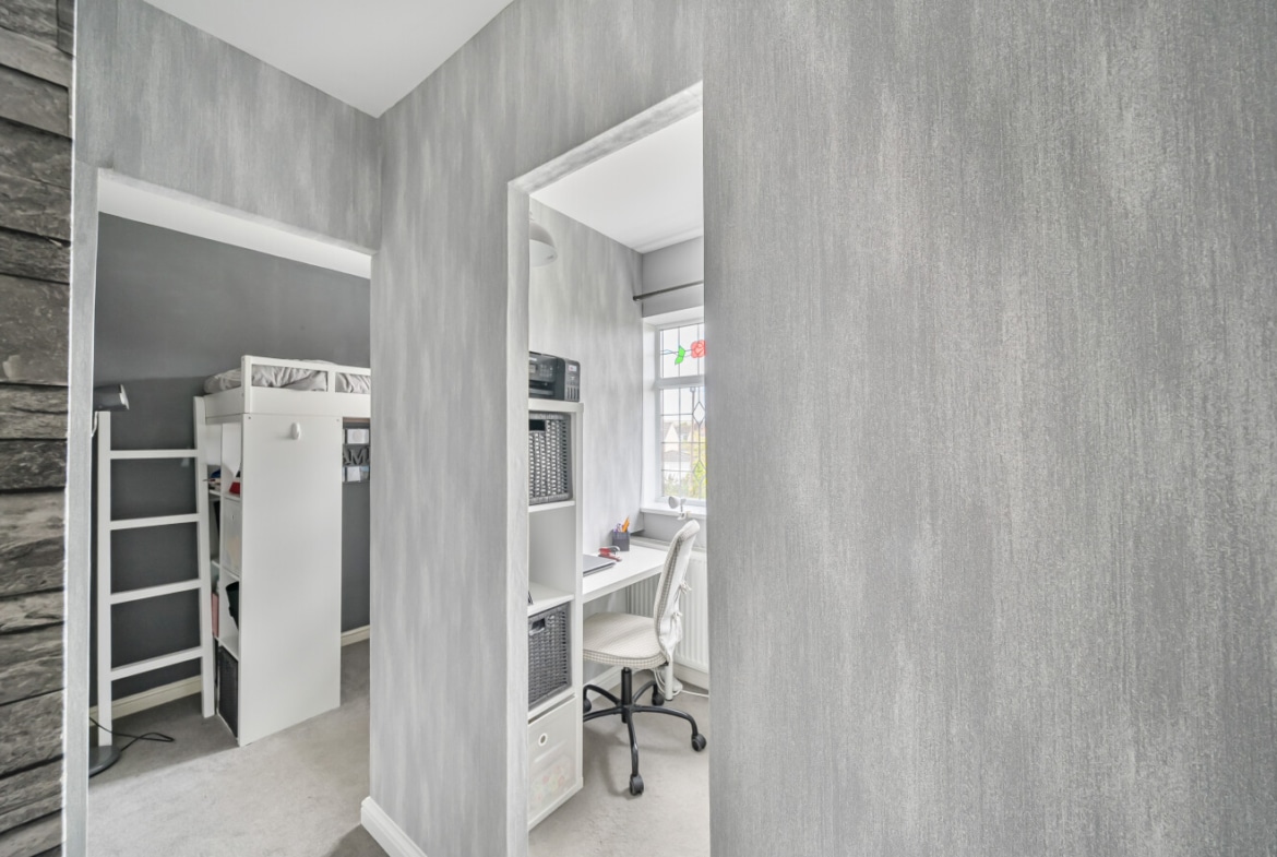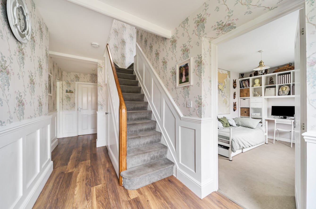 The welcoming hallway leads to a spacious study on the right, which has also been used as a bedroom in the past. At the end of the hall is a tastefully tiled downstairs WC. To the left, a large bay-fronted living room stretches the full length of the house, complete with a feature log burner and sliding doors opening into the garden—perfect for both cosy evenings and social gatherings.