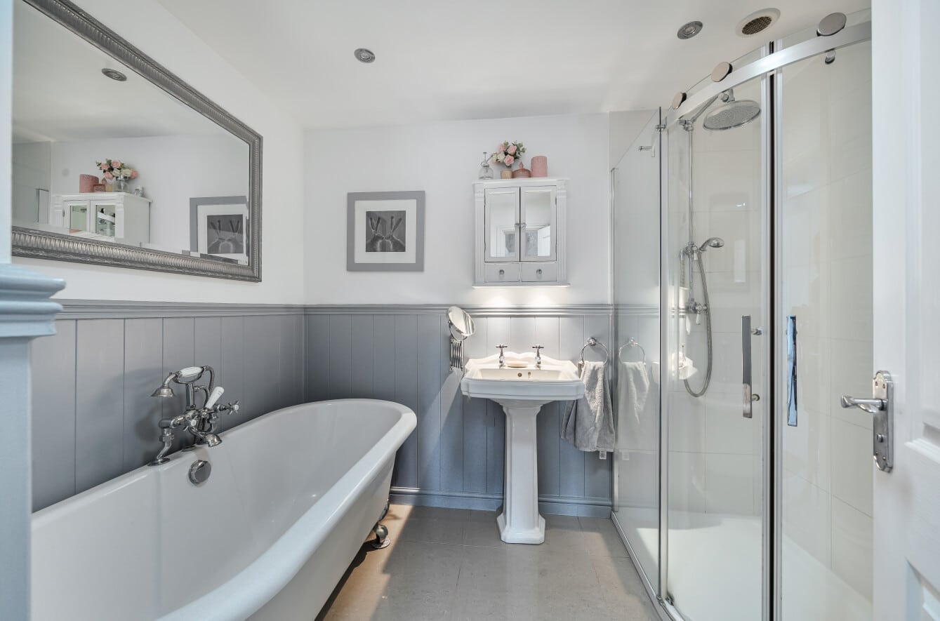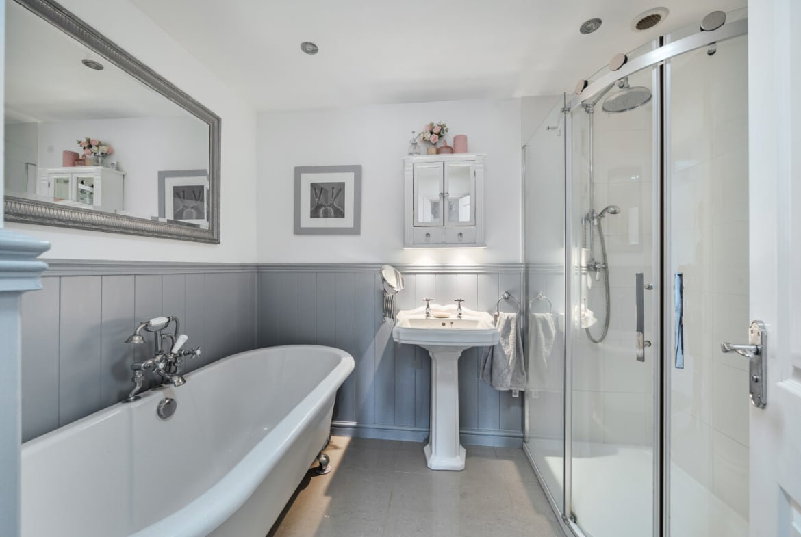 Upstairs boasts five spacious bedrooms, including a grand principal with en-suite, bay-fronted doubles, a quirky character room, and a versatile fourth bedroom. Luxurious family bathroom with roll-top bath and separate shower.