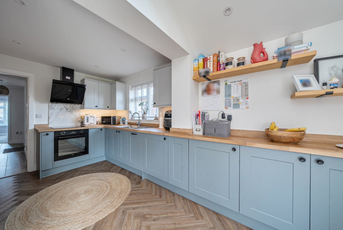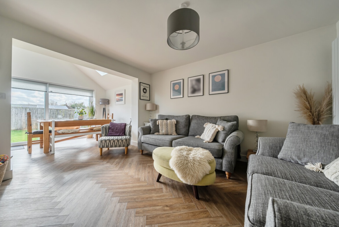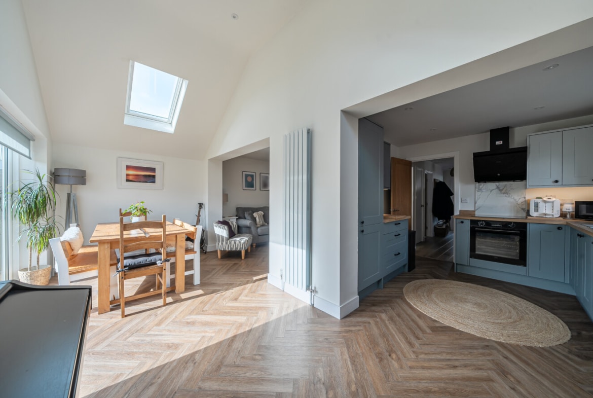 From the moment you step inside, the transformation is clear. A welcoming entrance hall leads through to a stunning open-plan kitchen/dining space, thoughtfully redesigned to form the true heart of the home. The contemporary shaker-style kitchen is complemented by solid wood worktops, integrated appliances and sleek finishes, flowing seamlessly into a bright dining area beneath vaulted ceilings and skylights. Large sliding doors open directly onto the rear garden, allowing natural light to pour in and creating an effortless connection between indoor and outdoor living – perfect for entertaining or relaxed family evenings.