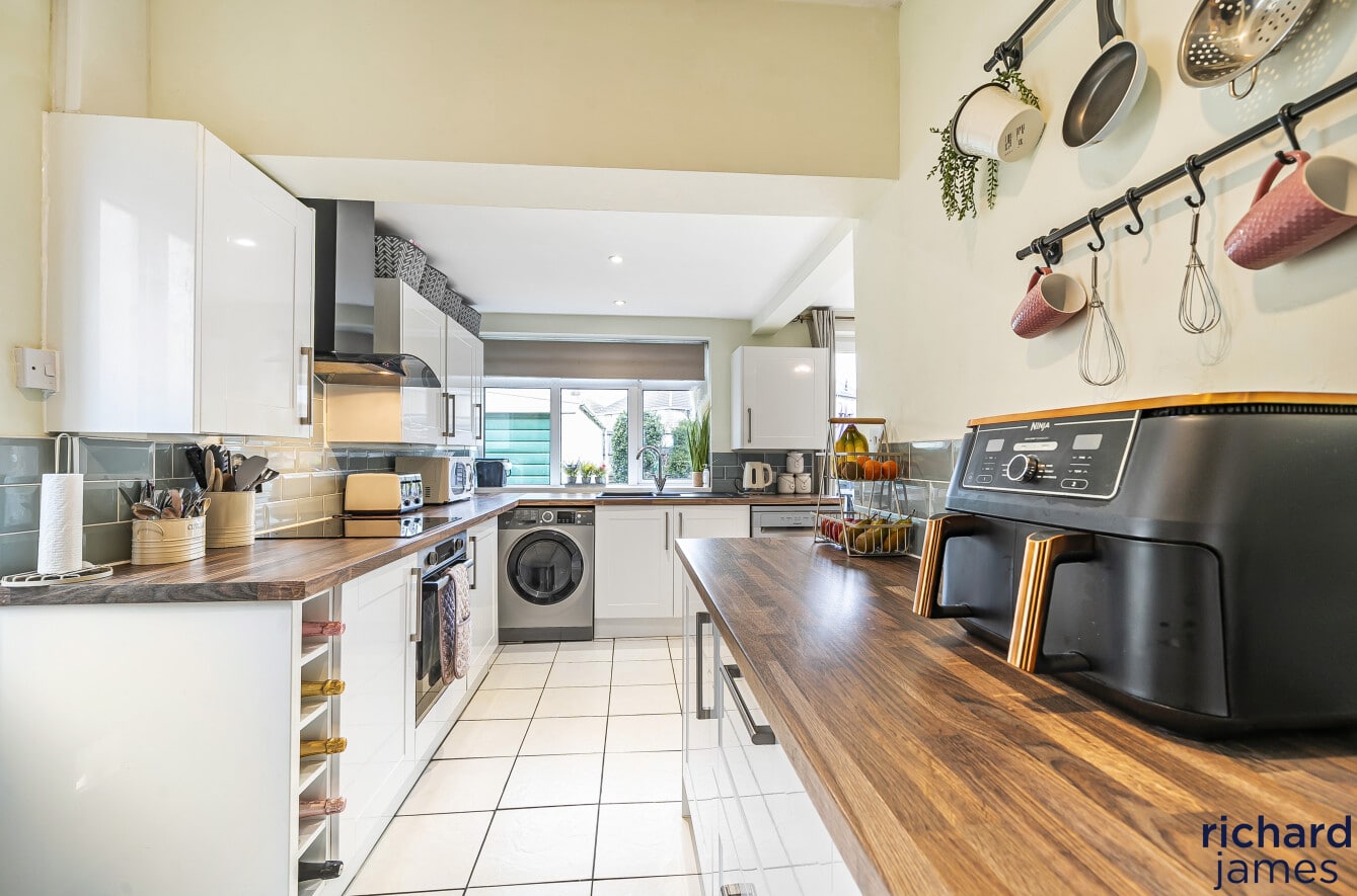 Upon entering, you’re welcomed by a convenient entrance porch that leads into the spacious main living area at the front of the house. Bright and inviting, this room sets the tone for the rest of the home. From here, you move into the modern kitchen, which has been finished to a high standard. With ample storage, generous worktop space, and a layout designed for functionality, the kitchen is a true centerpiece of the home.
