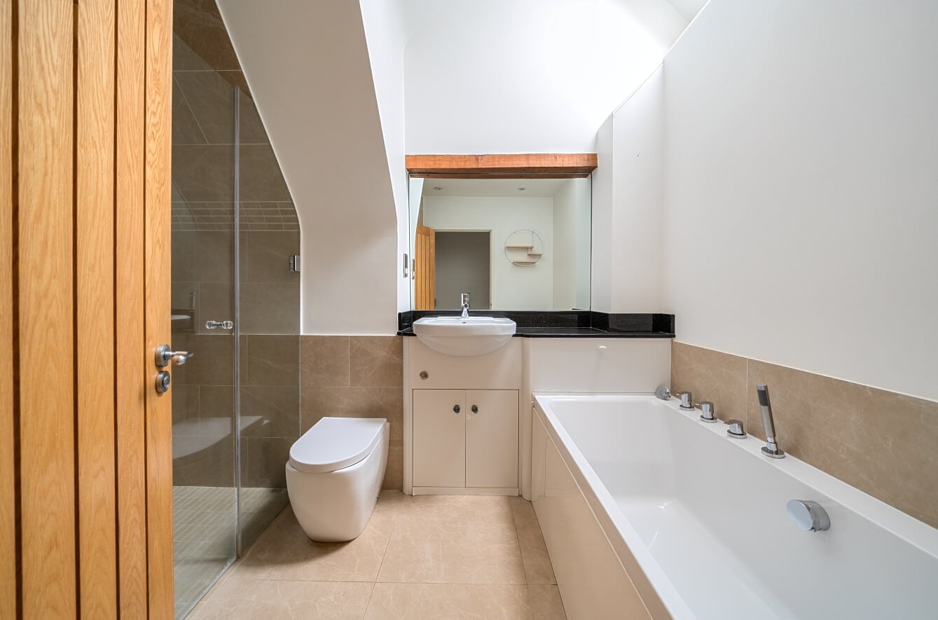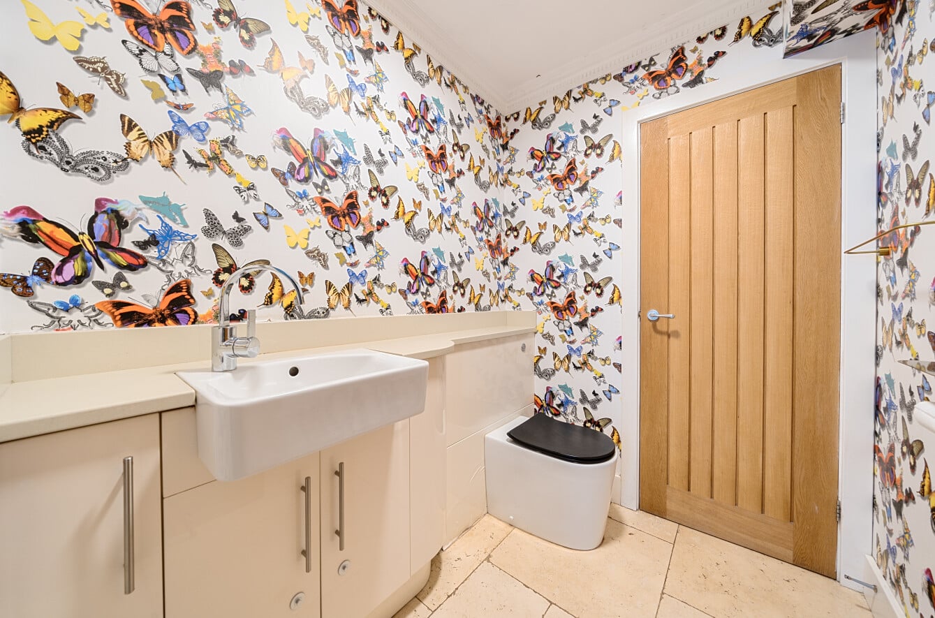 The main entrance is to the rear and under the Storm Porch, you are welcomed by the latch lock panelled door which leads into the Hall, giving access to one of the Reception Rooms which sits to the rear of the property, enjoying views over the garden and towards the Downs beyond. With the added feature of an open fireplace with a natural stone hearth, mantle and surround and oak flooring, with steps leading into the second Reception with Italian sandstone flooring with underfloor heating and bi-fold doors which lead out onto the sun terrace. In addition to the ground floor, there is also a Cloakroom, Study and spacious Kitchen/Breakfast Room, fitted with a bespoke farmhouse style Kitchen with a comprehensive range of units with solid oak work surfaces over, with integrated dishwasher and glazed double doors opening into the front garden and attractive reclaimed York flagstone flooring. The Utility Room is fitted with a range of floor and wall cupboards, with solid oak work surfaces over and an inset butler sink with mixer tap.