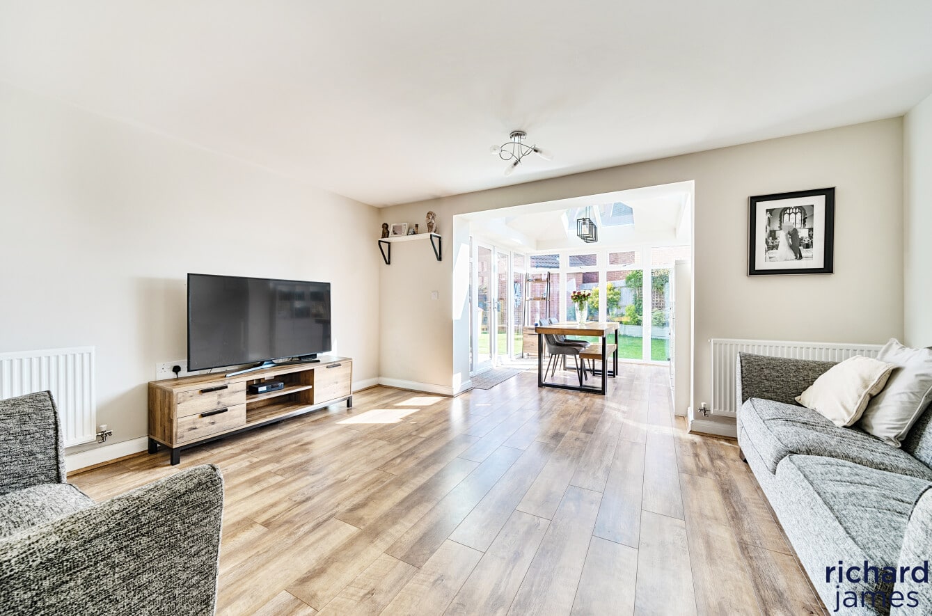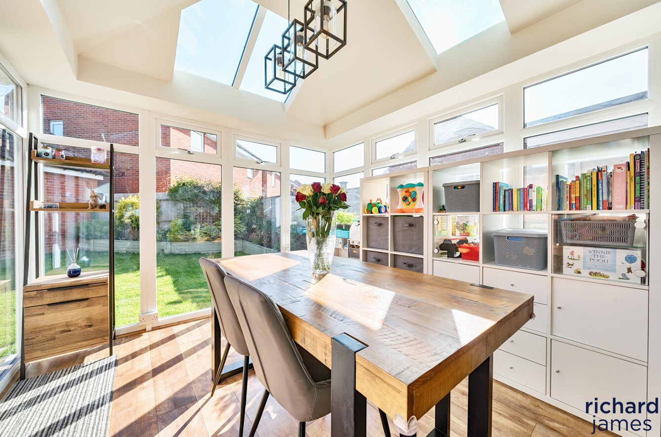 The ground floor welcomes you with a bright entrance hallway, leading to a convenient downstairs WC. The contemporary kitchen and dining area provides the perfect space for everyday meals or entertaining guests. The large living room, extended at the rear and currently used as a dining area, is a versatile and inviting space, complete with a generous storage cupboard to keep things tidy.