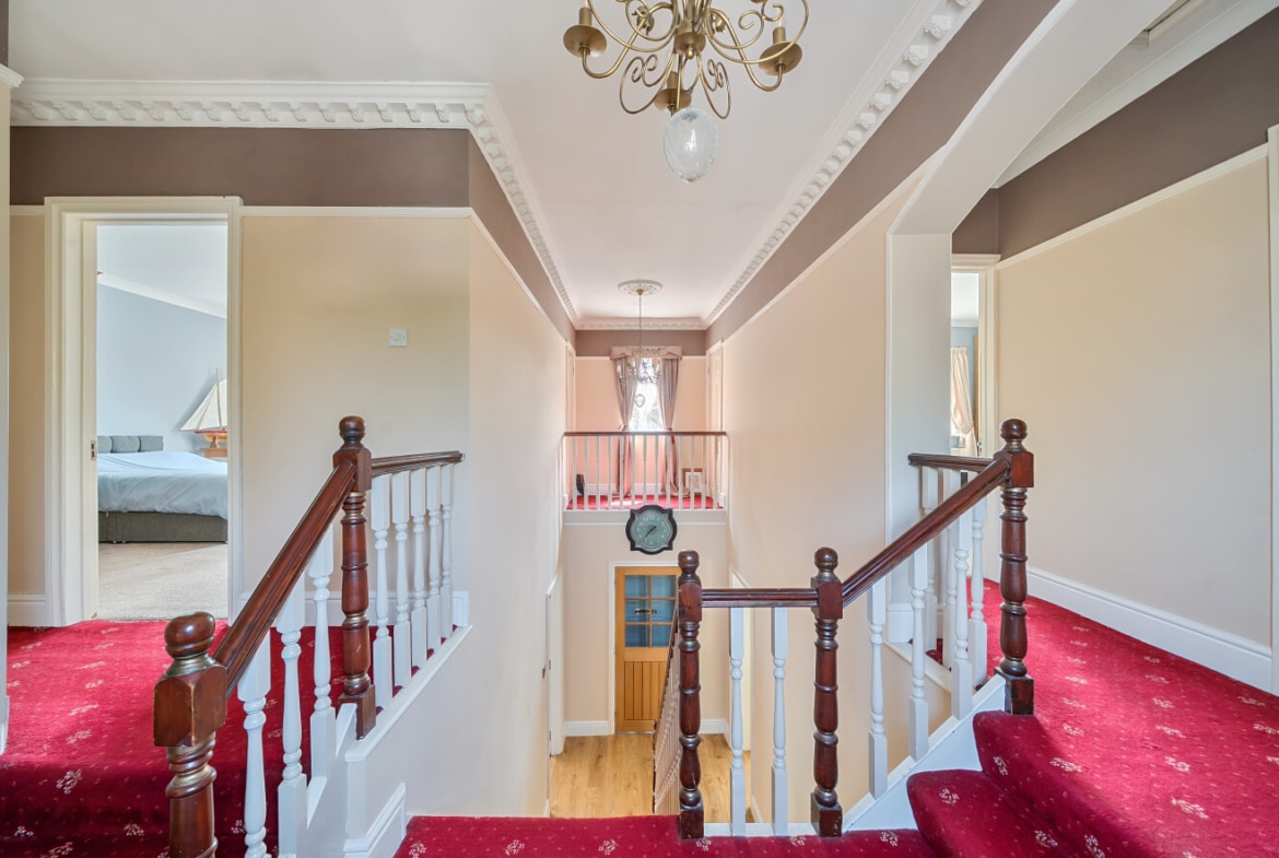 The first floor is arranged around the galleried landing, which enhances the sense of openness and light. There are four generous bedrooms, each well-proportioned and thoughtfully laid out. The principal suite includes a large four-piece en-suite bathroom, while the remaining bedrooms are served by an equally spacious family bathroom, also fitted as a four-piece suite.
