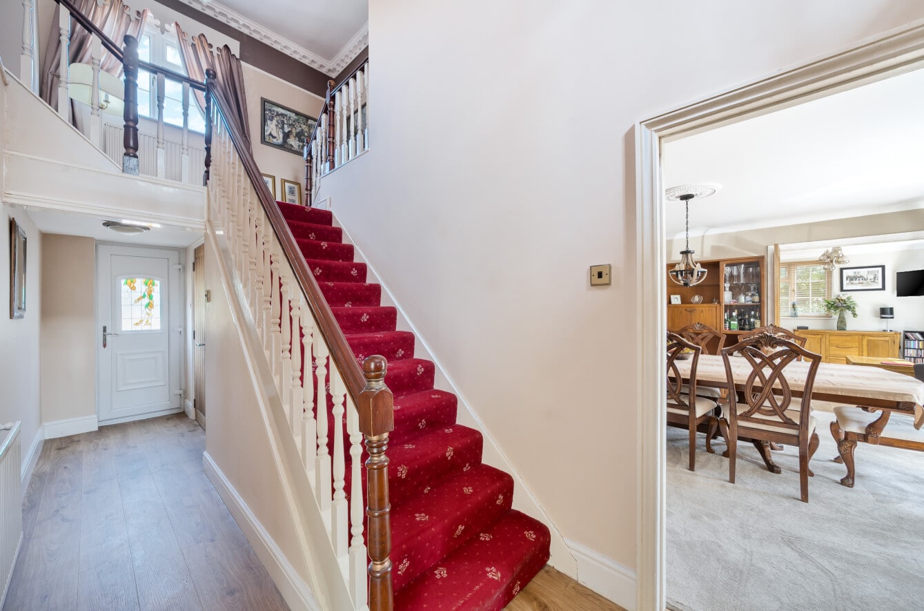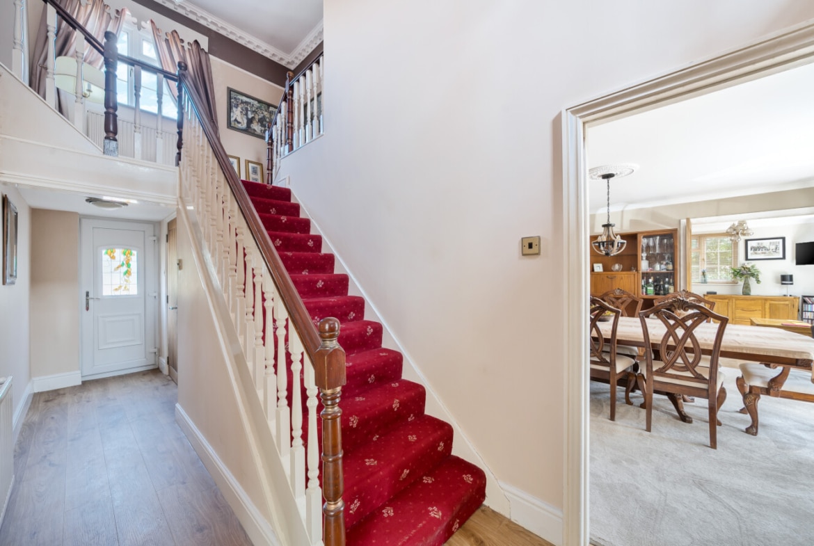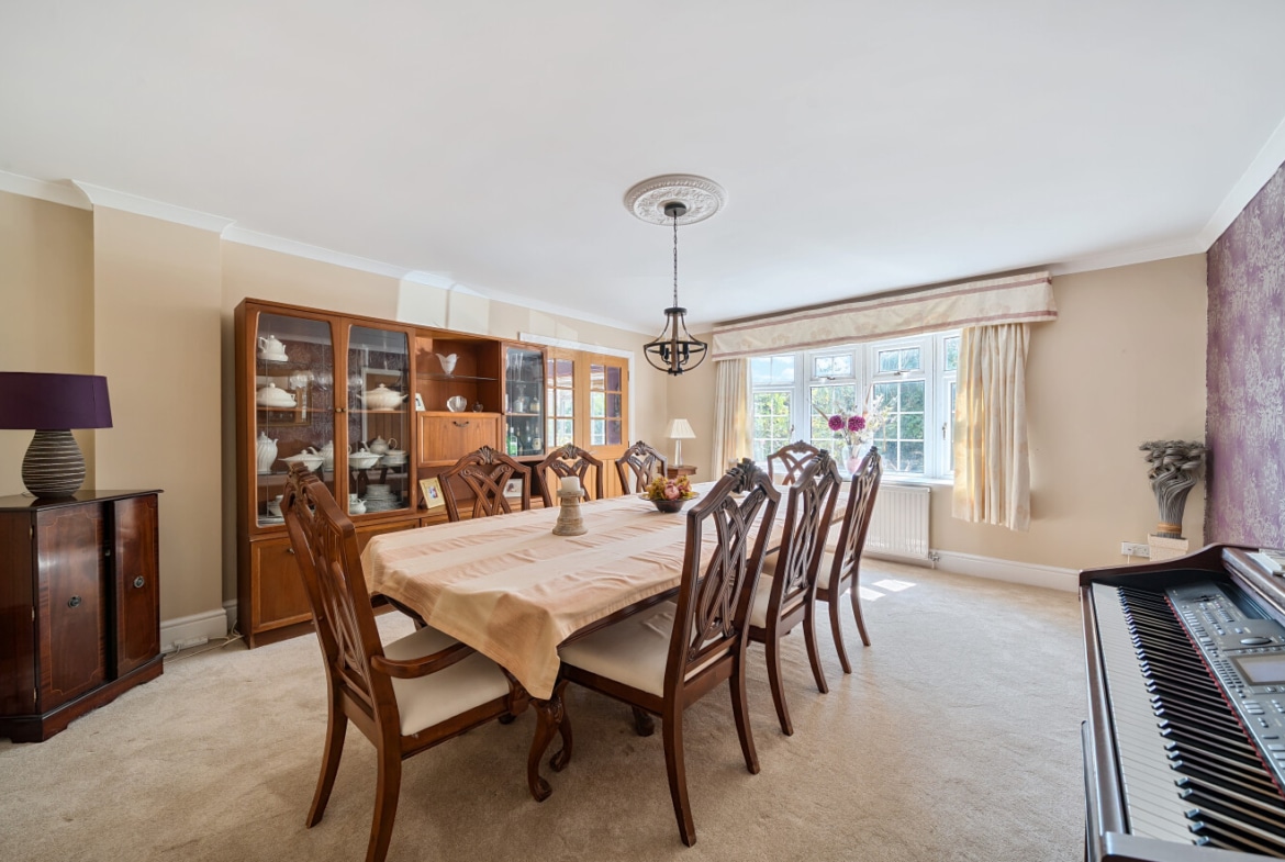 On entering, the scale of the house is immediately apparent. A spacious hallway, with its elegant galleried landing and internal balcony, creates a wonderful first impression and sets the tone for the rest of the property. The principal reception room is a large dual-aspect living room, centred around a handsome wood-burning fireplace with a limestone surround, creating a warm and inviting focal point. The dining room is equally impressive, substantial in size and easily able to host gatherings of fourteen or more, making it perfect for entertaining on a grand scale.