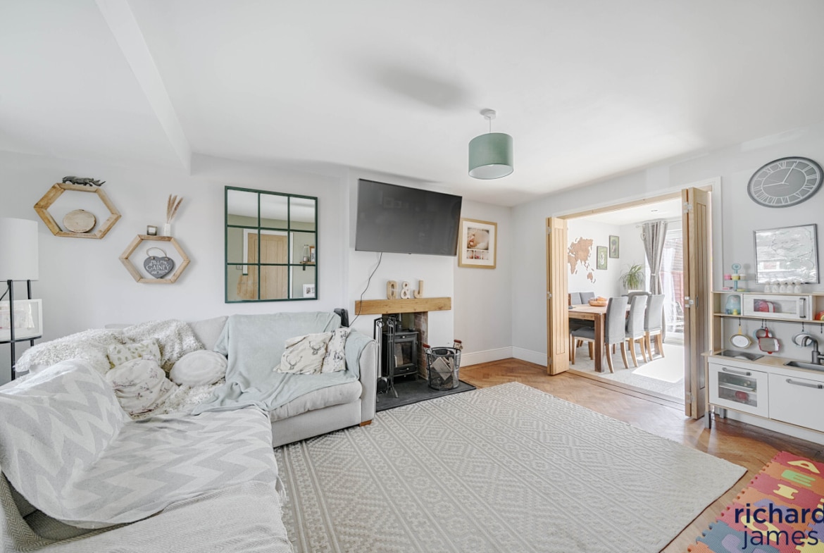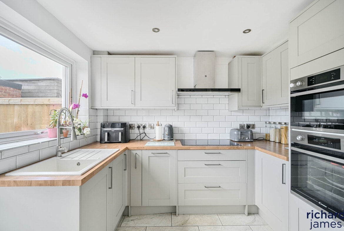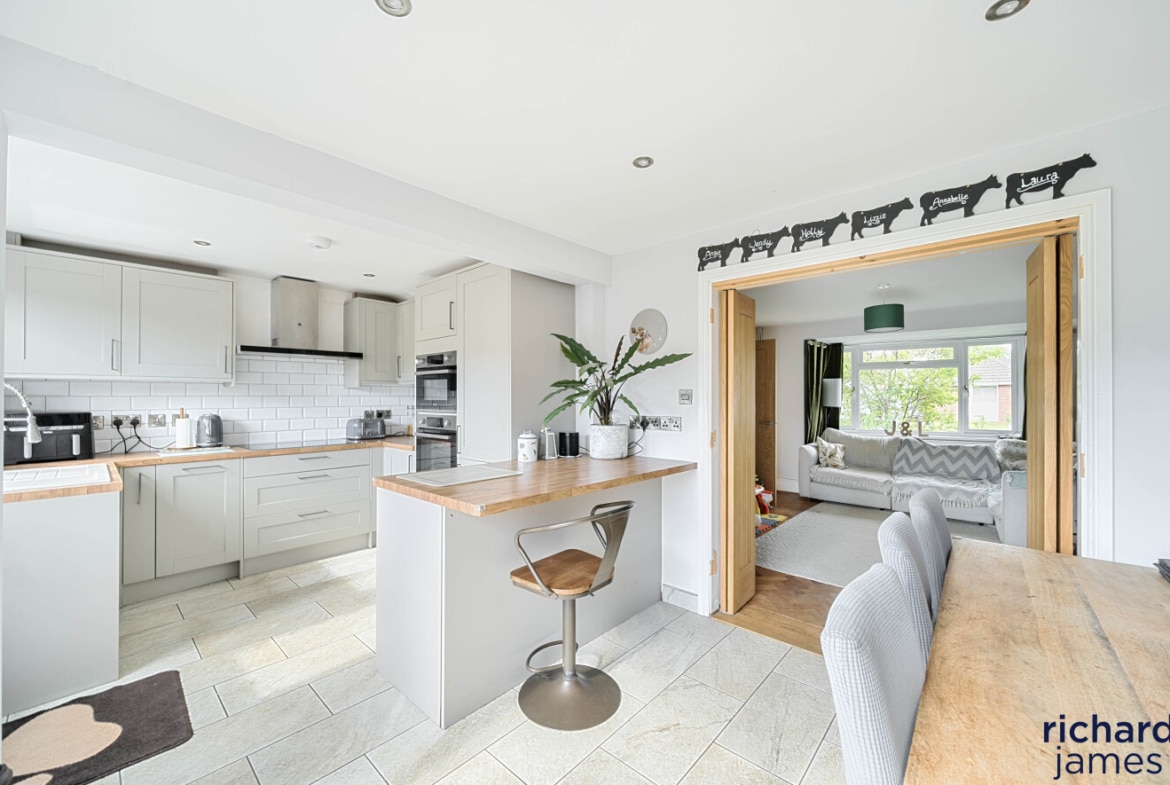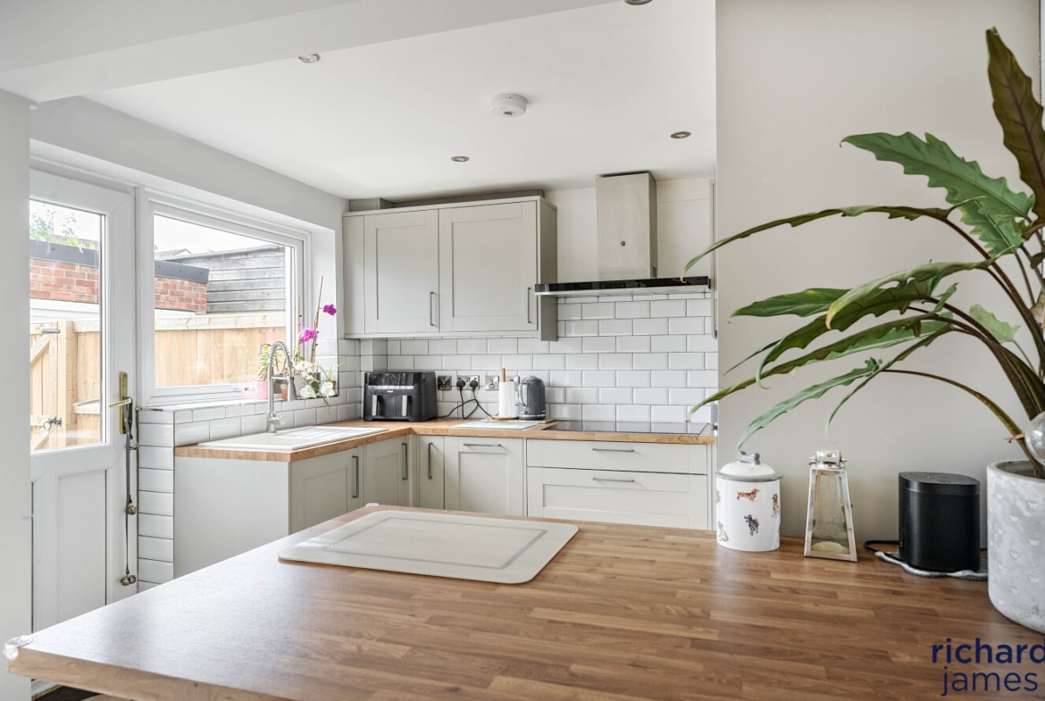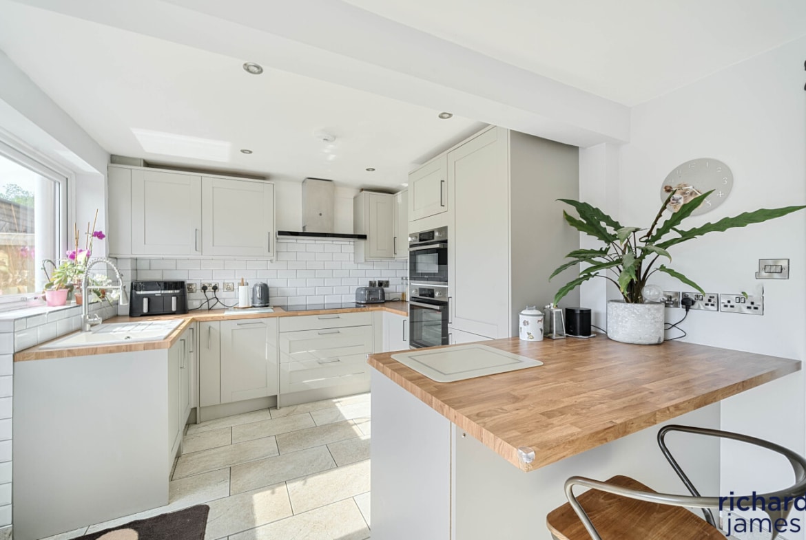 The ground floor features a welcoming living room with a charming log burner, creating a warm and cosy space to relax. To the rear, the dining area opens out onto the spacious south-east facing garden through patio doors, providing the perfect setting for entertaining or enjoying a quiet morning coffee in the sunshine. The heart of the home is the impressive kitchen, beautifully fitted with integrated appliances, shaker-style units, solid wood worktops and a breakfast bar for casual dining. The space is bright and contemporary, with clean lines and a fresh, timeless finish.