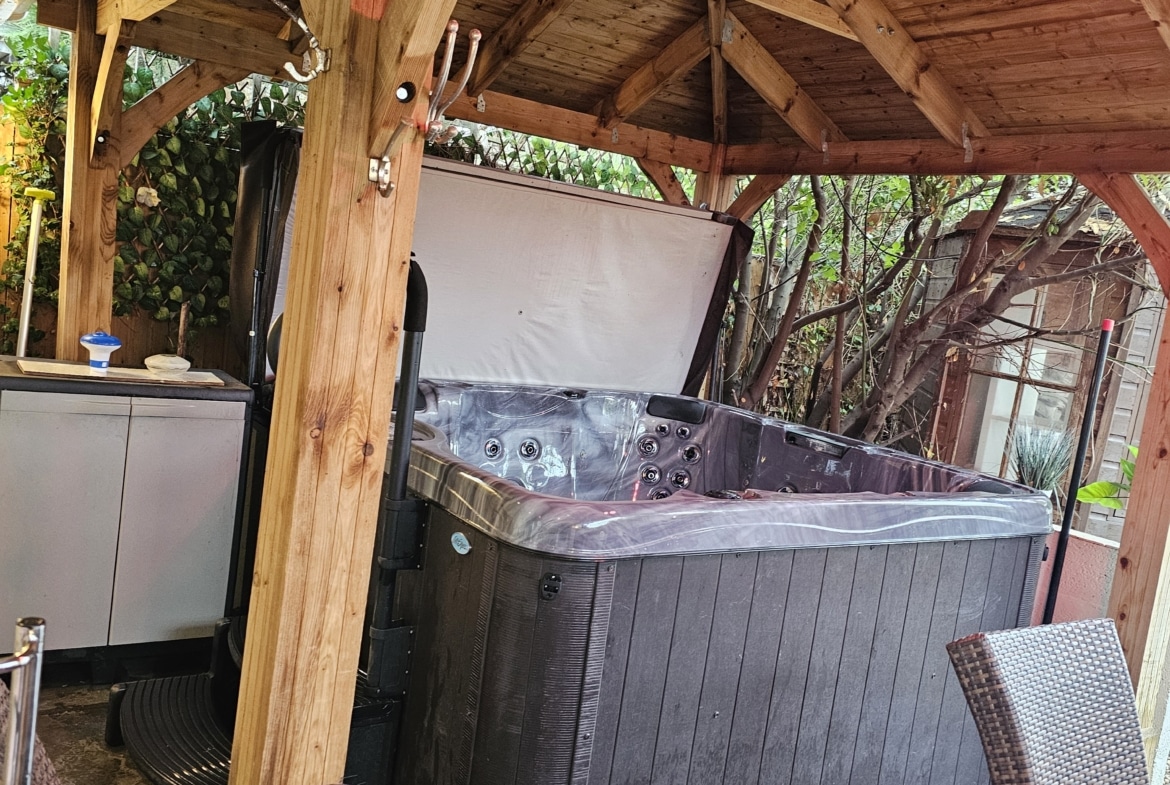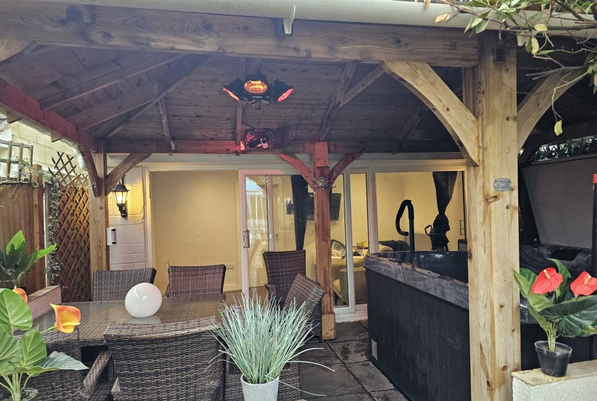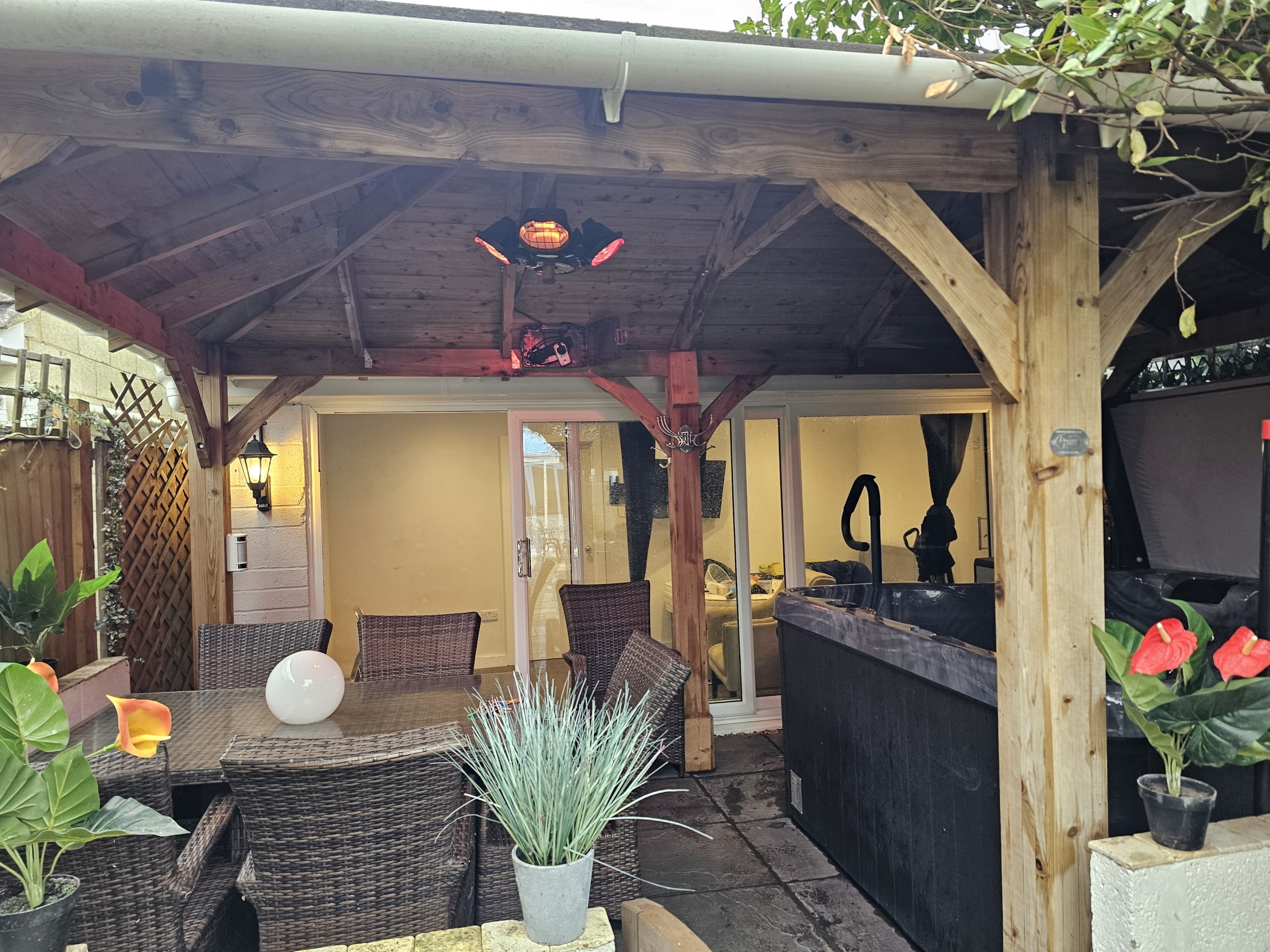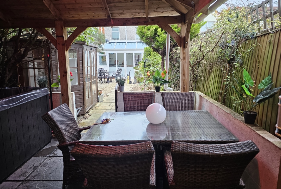 This rear garden on this property is also pretty special, with a stone chipped eating and barbecue area with a pathway leading to the shed and large pergola which houses another superb entertaining and barbecue space aswell as the hot tub.