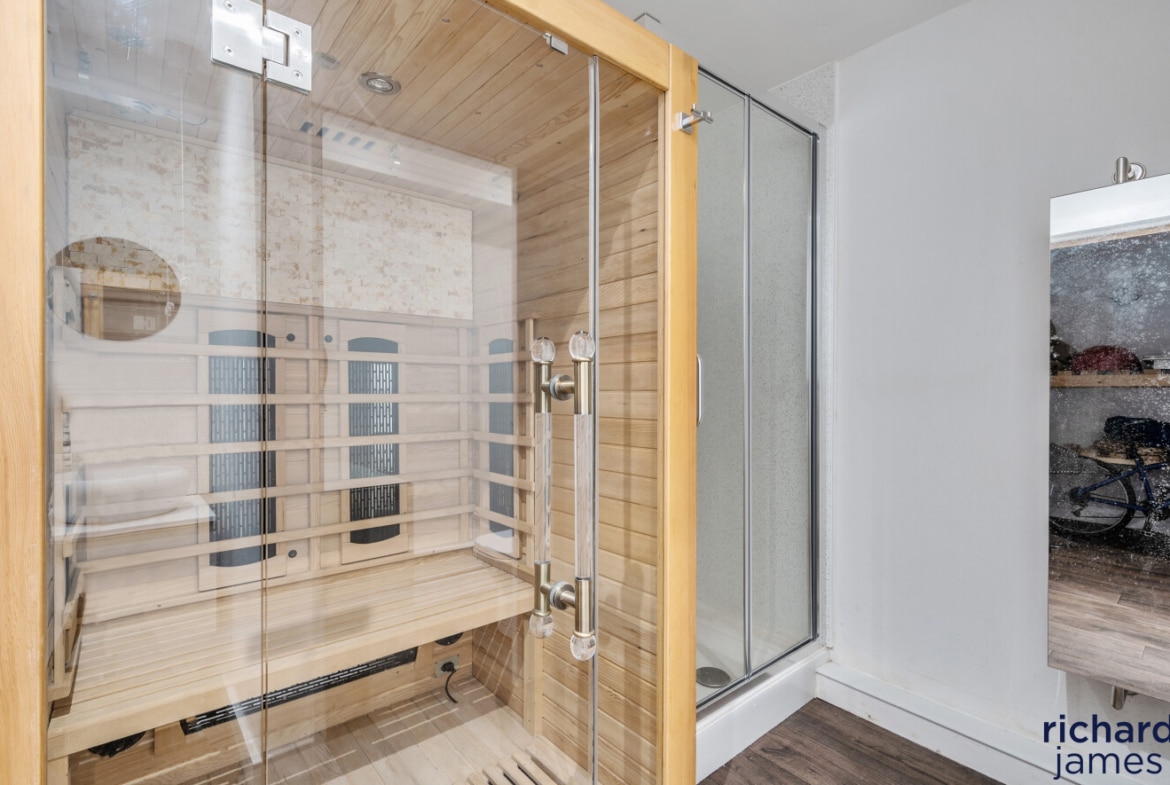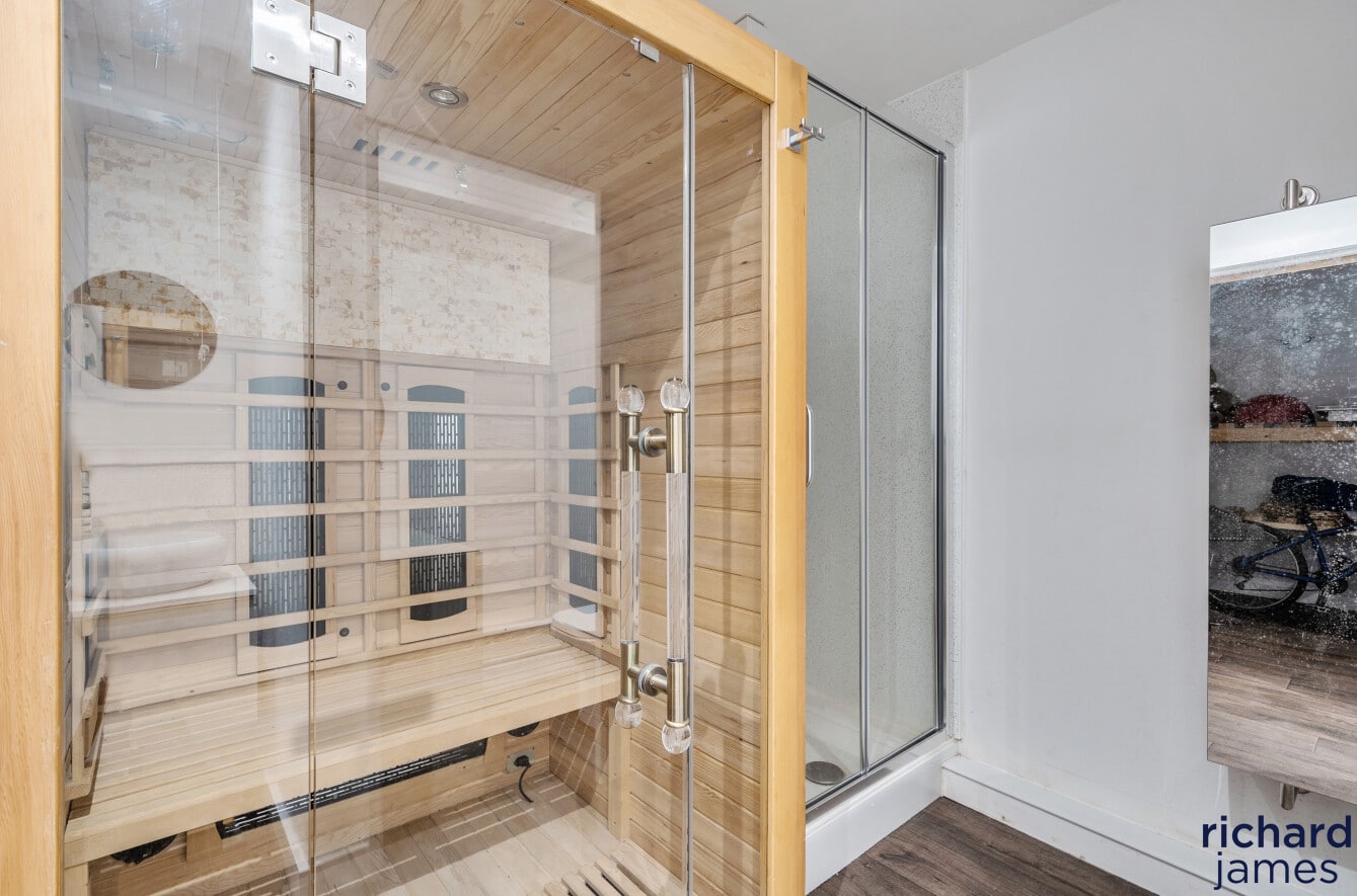 There is also a detached annexe at the rear of this garden, like most out-buildings this annexe serves well as a bar, office or gym. Unlike most outbuildings this space is also perfect for a business or living quarters as there is power, lighting, separate rooms, a shower room and even a sauna!