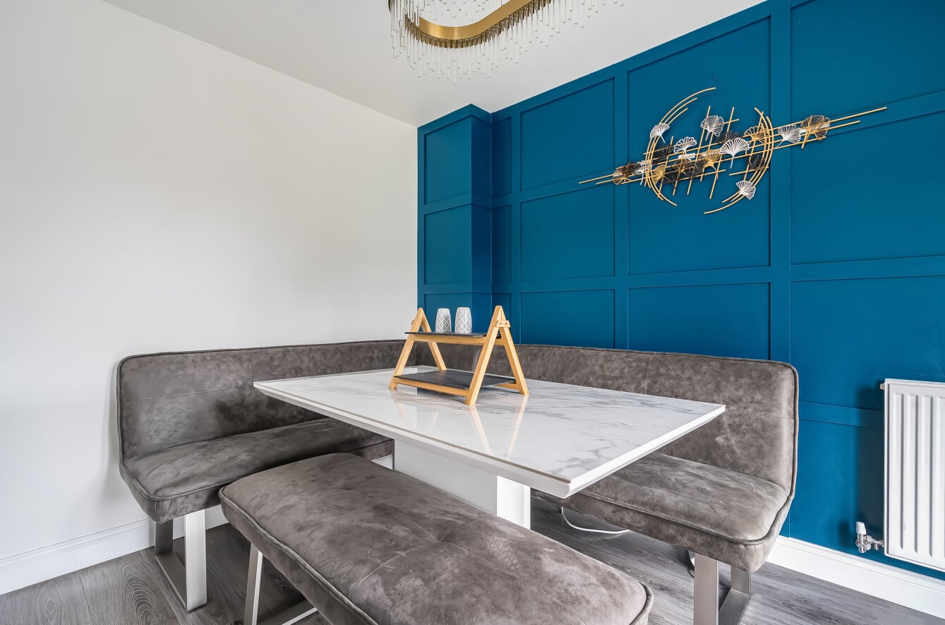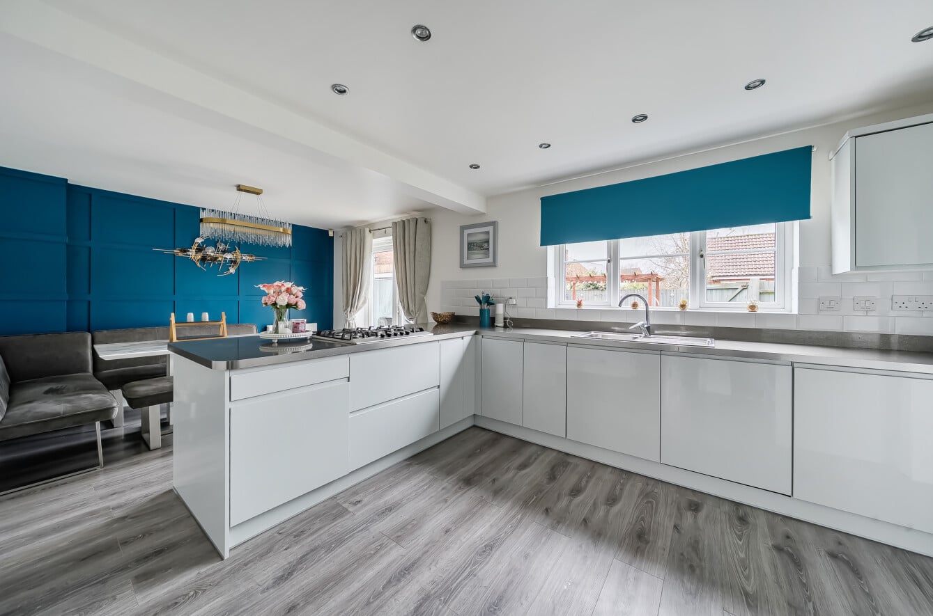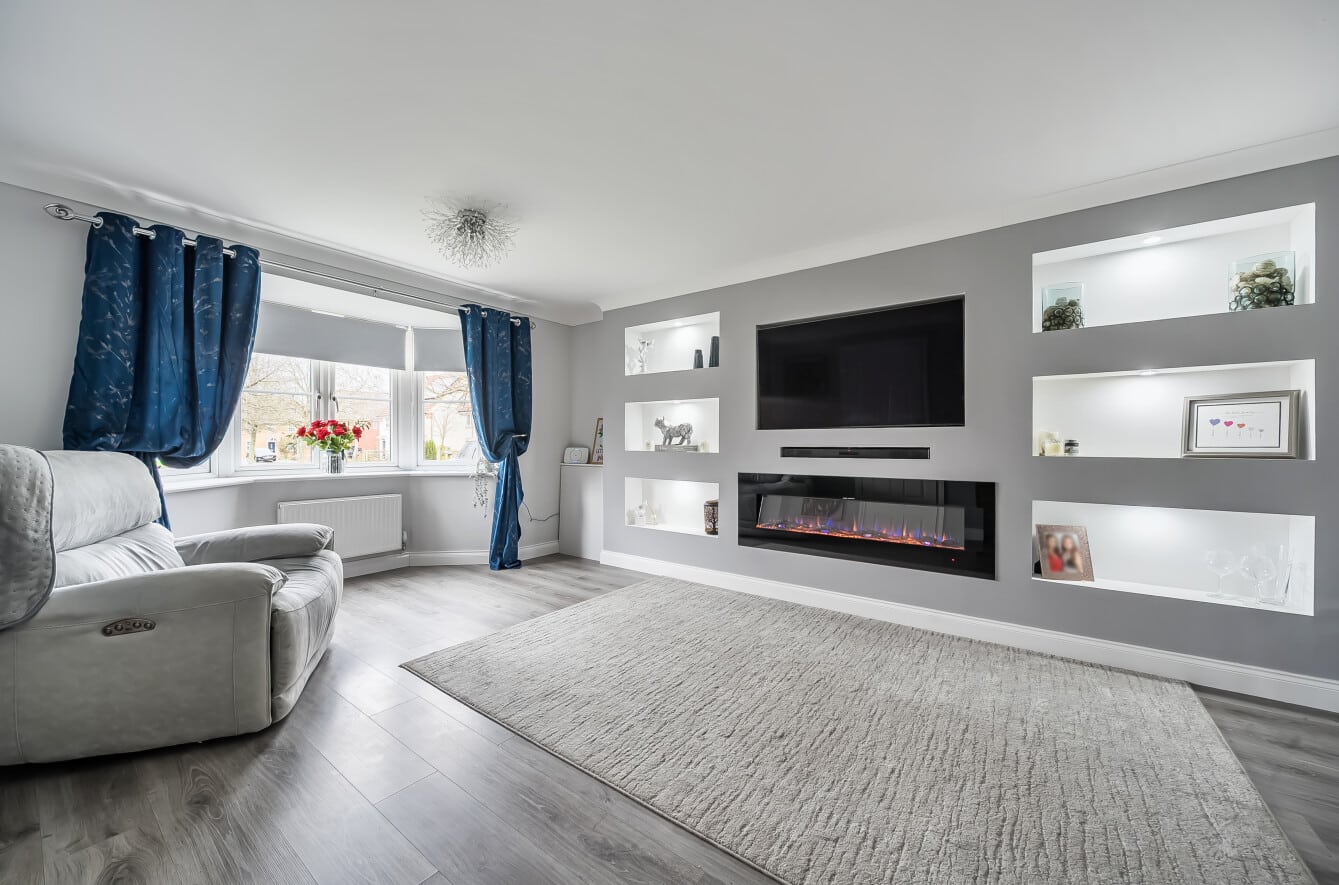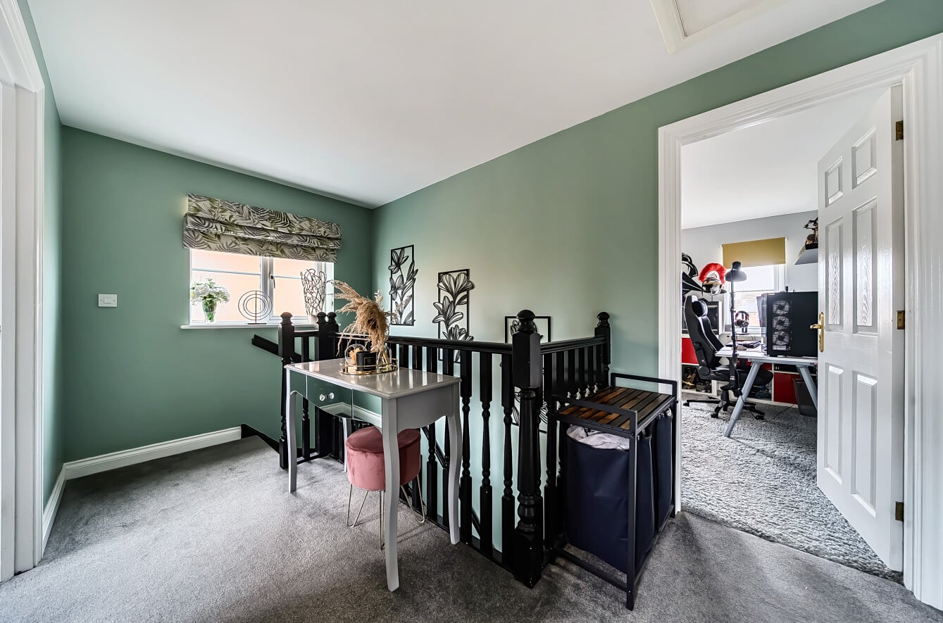 The ground floor is both practical and versatile. A bay-fronted reception room provides a comfortable and light-filled sitting room with a recently fit media wall, while to the rear the open plan kitchen/dining room forms the natural heart of the home — an ideal space for everyday family life and entertaining, with ample room for dining and gathering. A separate reception room offers flexibility as a playroom, home office or additional living room, further complemented by a utility room and downstairs cloakroom.