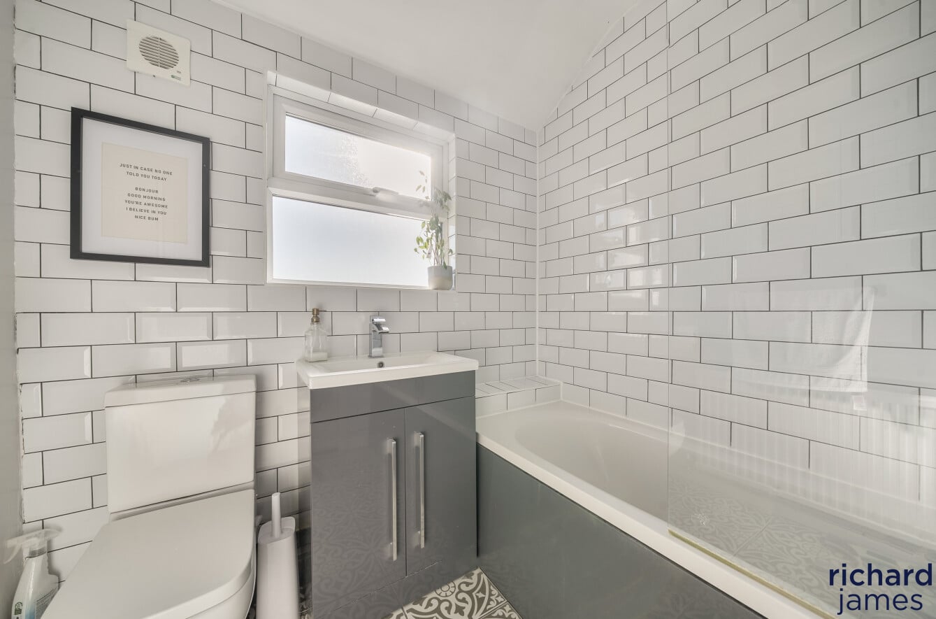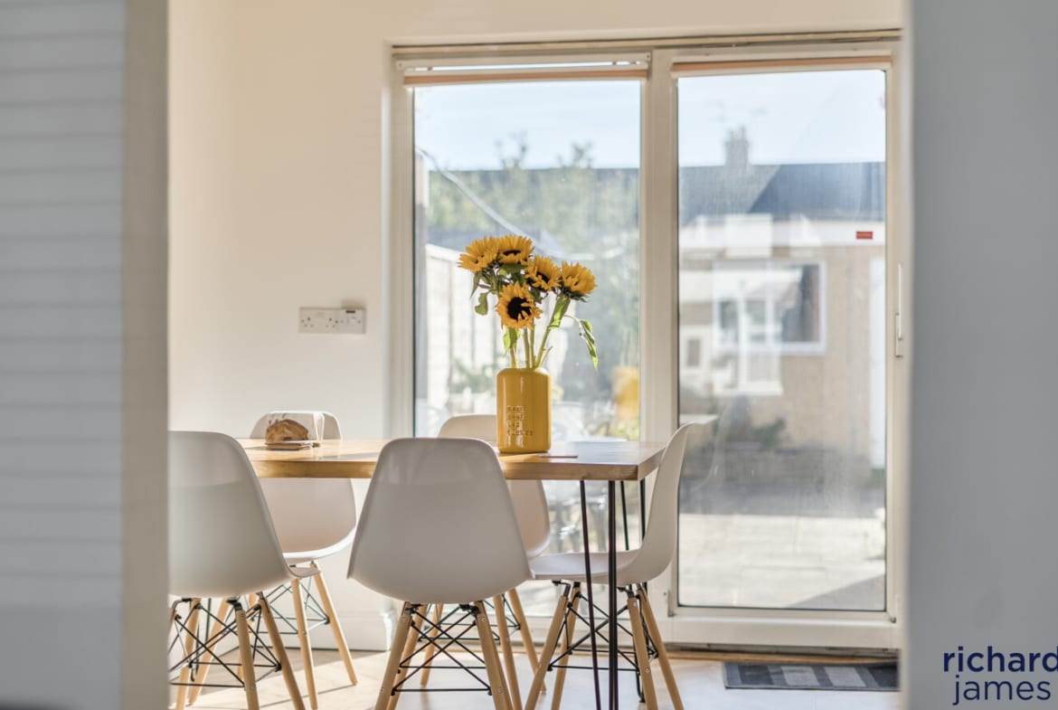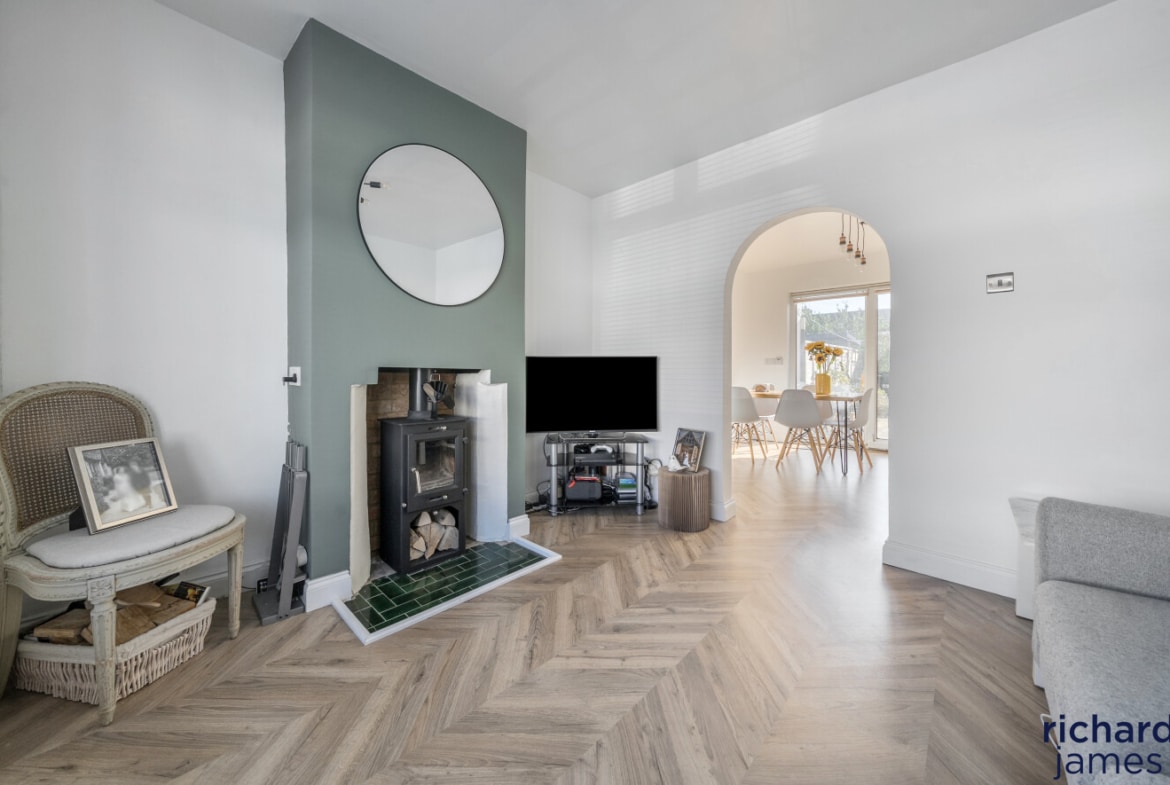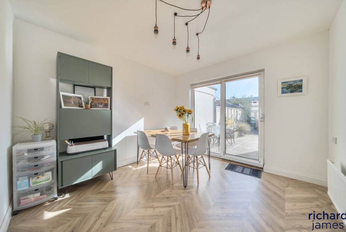 The ground floor living accommodation comprises; Entrance hall, W.C, a bay fronted living room with wood burner, the dining room with sliding doors to the rear garden and a modern kitchen.