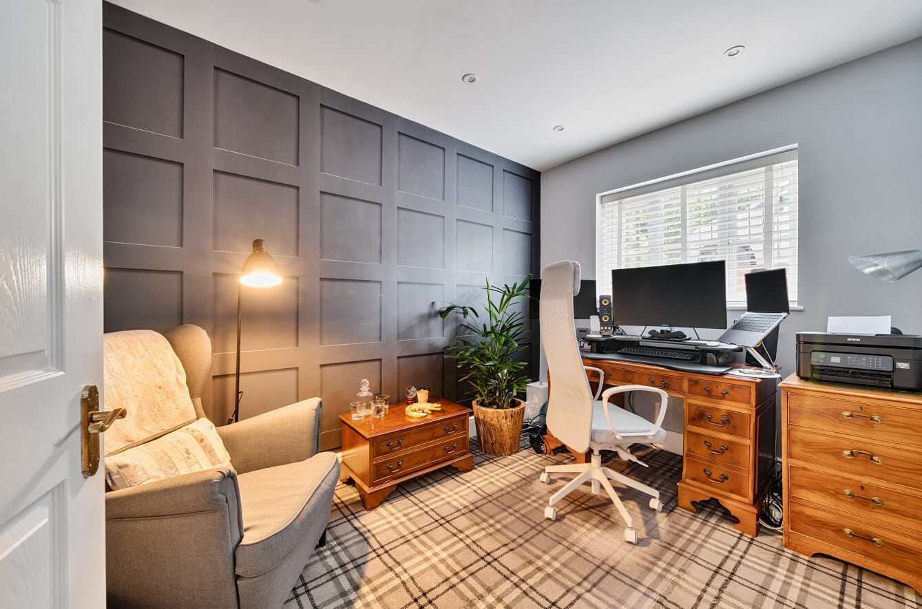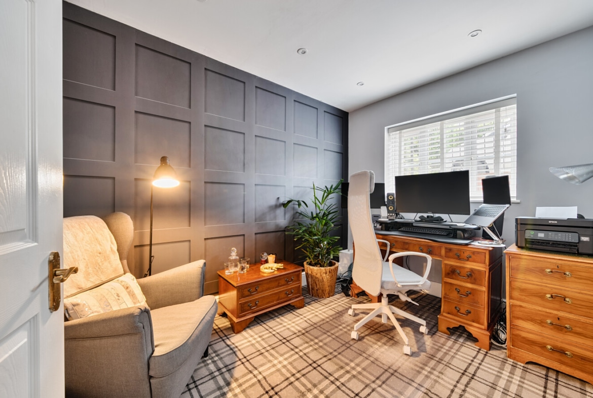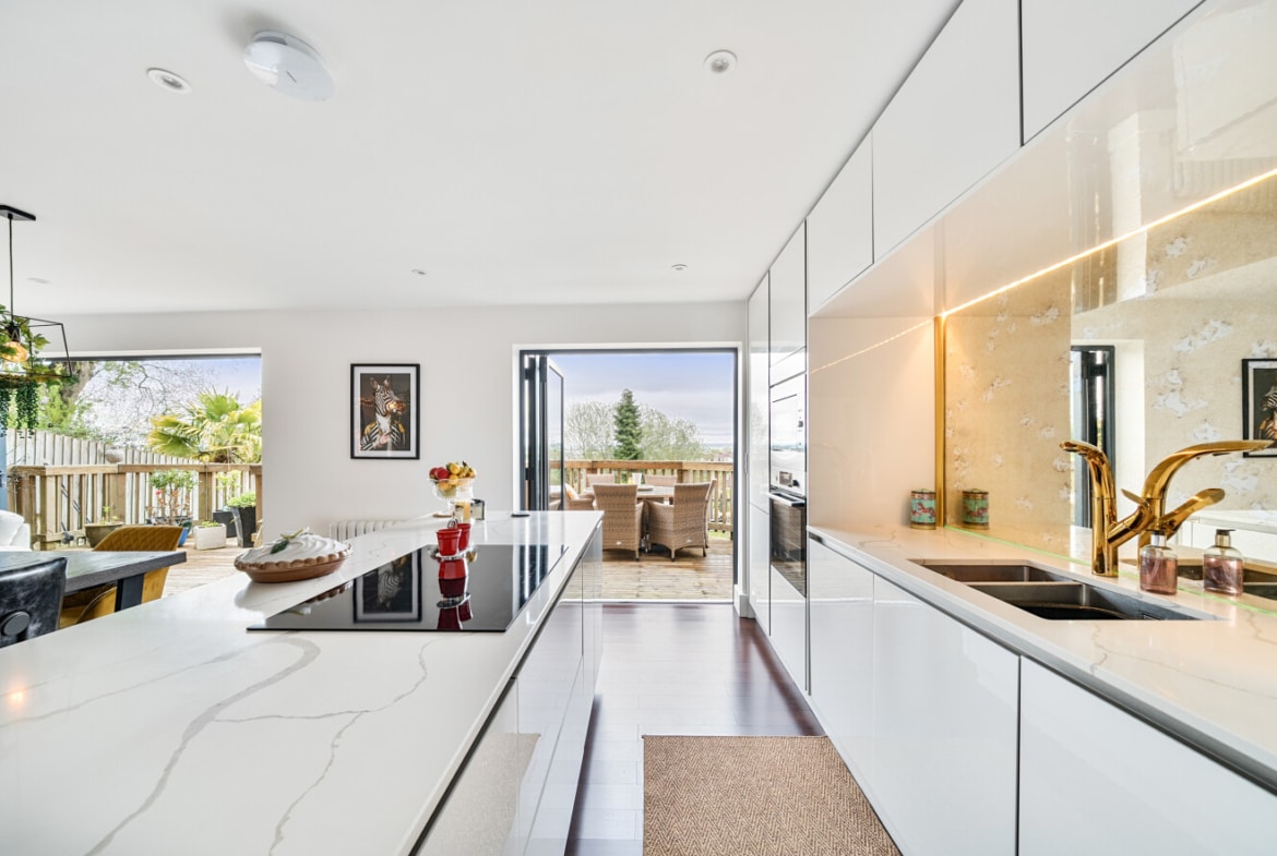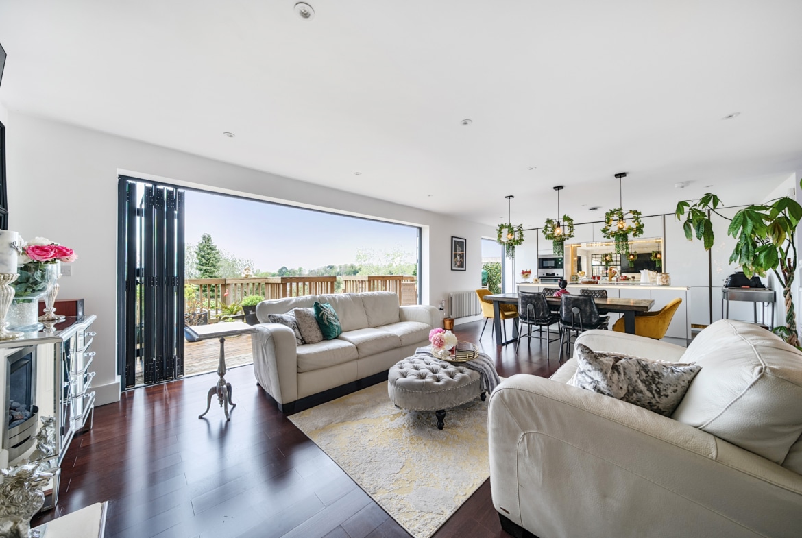 This well appointed home, has been much improved by the current owners to provide spacious open plan living, as well as suited to those working from home. Offering over 2000sqft of living space which comprises; Entrance Hall, which opens into a spacious Reception Room with vaulted ceiling, generous Study and Coffee Room, with staircase leading upto the impressive Bedroom One with picture window offering panoramic views, as well as Ensuite Shower Room and walk-in wardrobe. To the middle floors, you’ll find three further double Bedrooms, one which enjoys an additional Ensuite Shower Room. As well as, a lovely Snug, useful Utility Room and large Family Bathroom, with four piece suite. With stairs leading down to the ground floor, here is where you will find the heart of the home, the superb 30′ Kitchen/Family/Dining Room, which includes a modern refitted Kitchen, with integrated appliances and island, large triple glazed bi-folding doors open into landscaped Rear offering far reaching views.