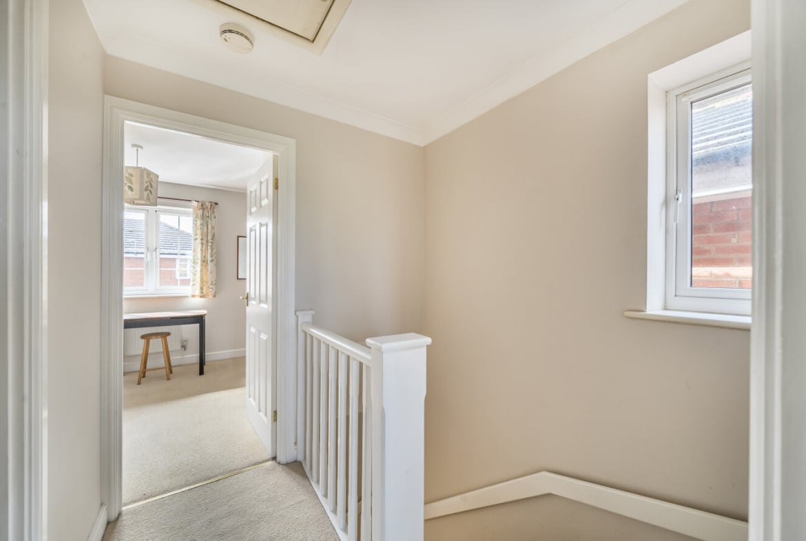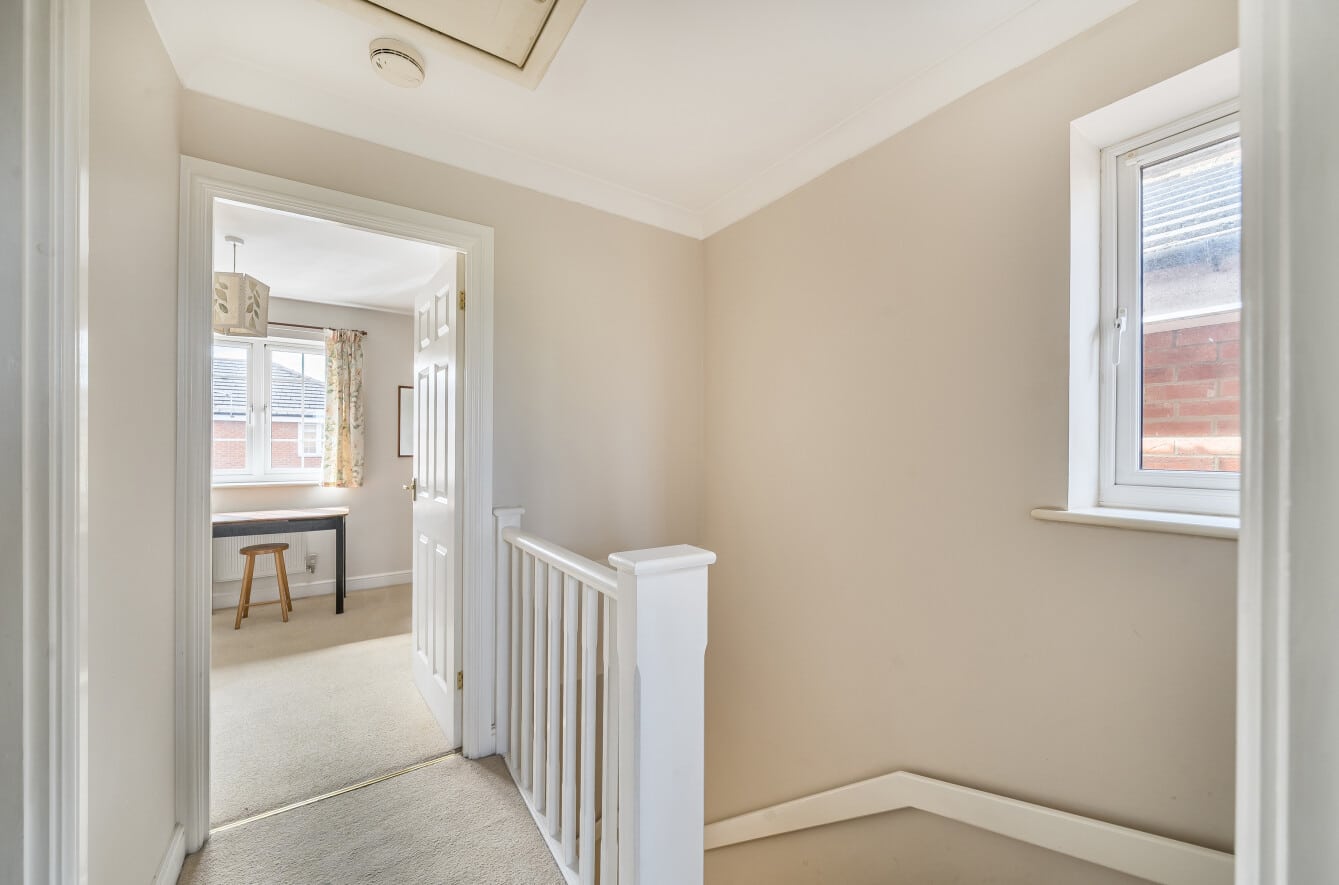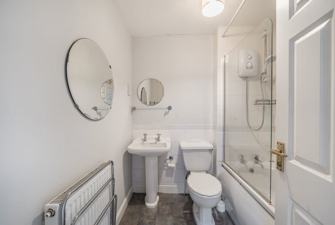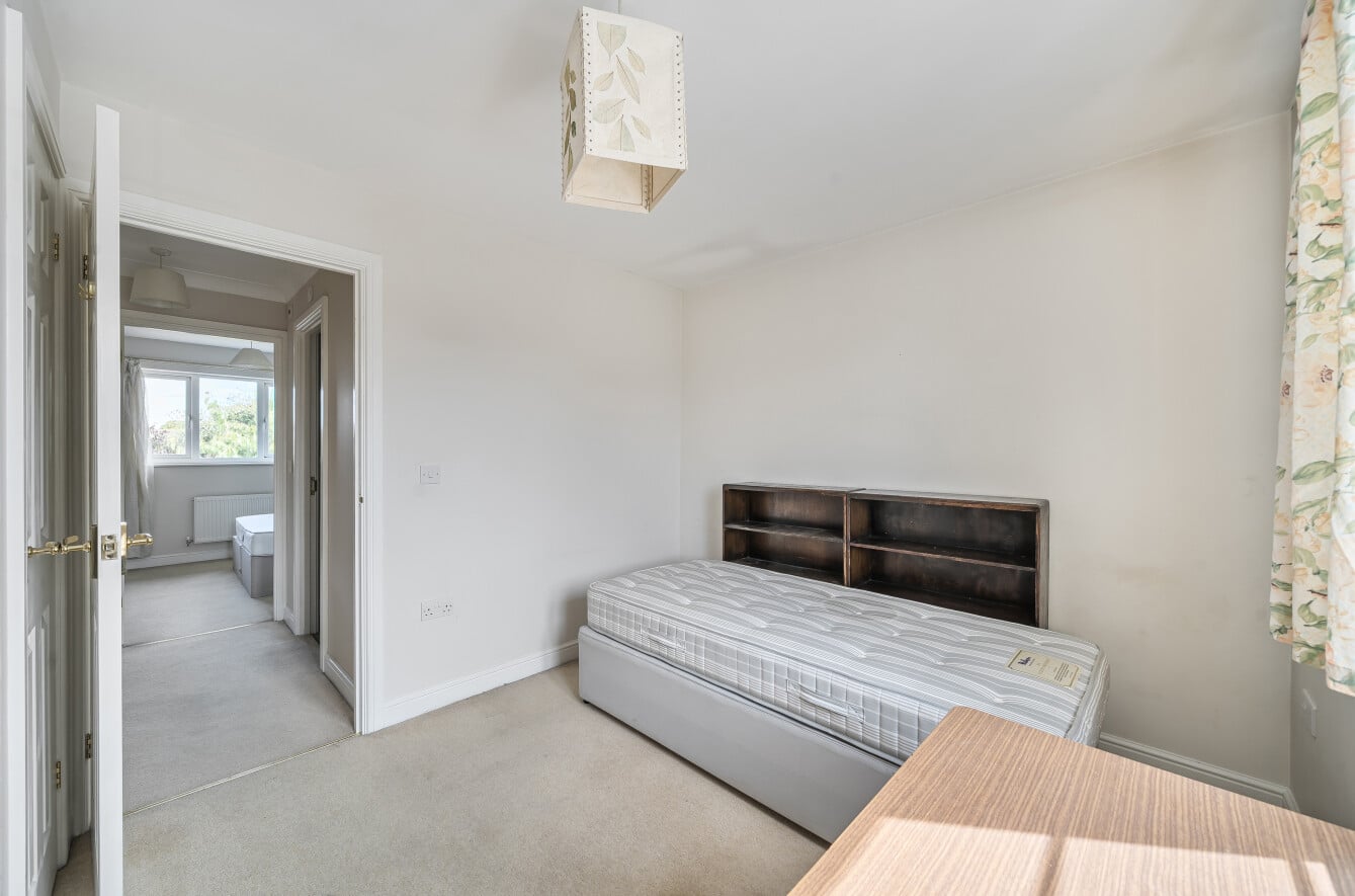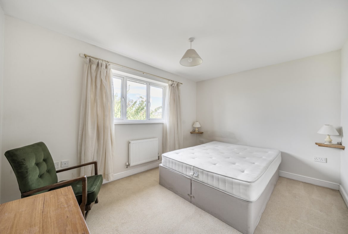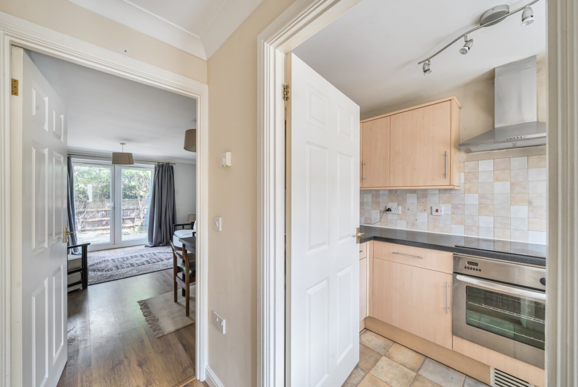 The private rear garden backs onto a school field, offering a pleasant outlook and plenty of privacy. A garage, situated beneath a coach house, provides extra storage and convenience, with additional side access to the garden.