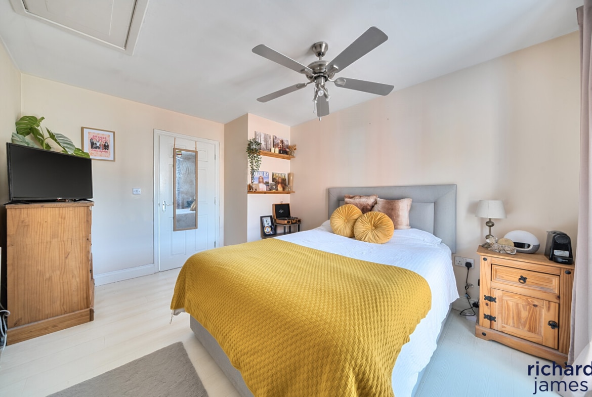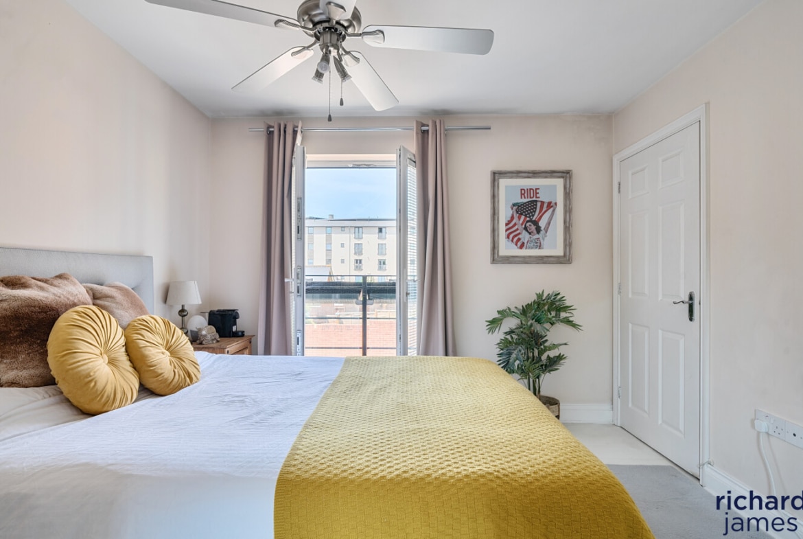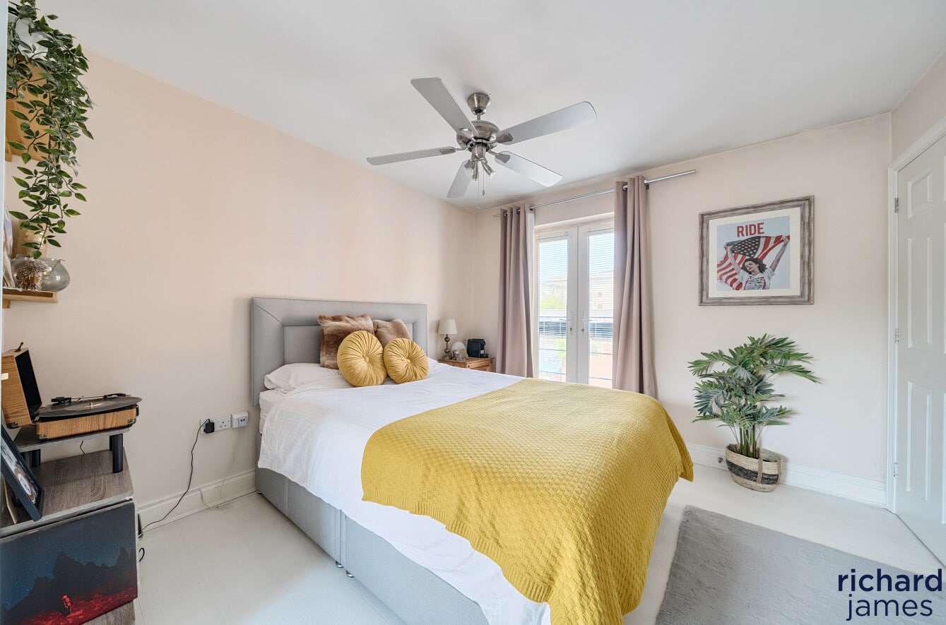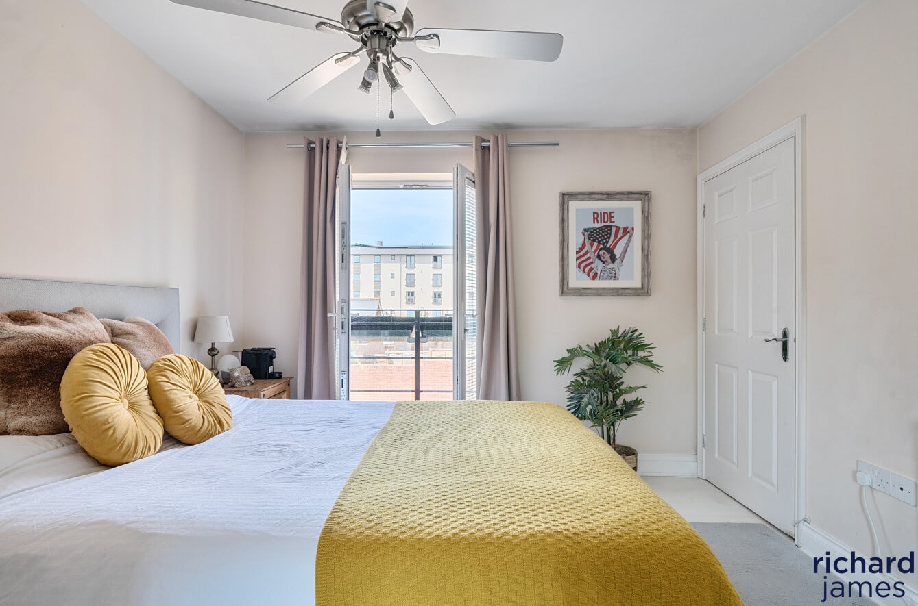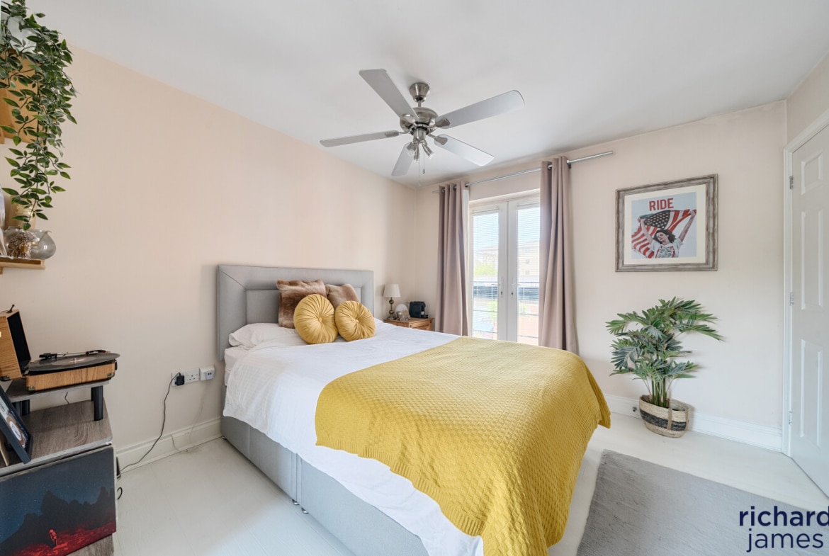 The well-proportioned double bedroom features a built-in wardrobe and double glazed French doors with a Juliette balcony, adding charm and a sense of openness. A contemporary bathroom with a white three-piece suite completes the layout.