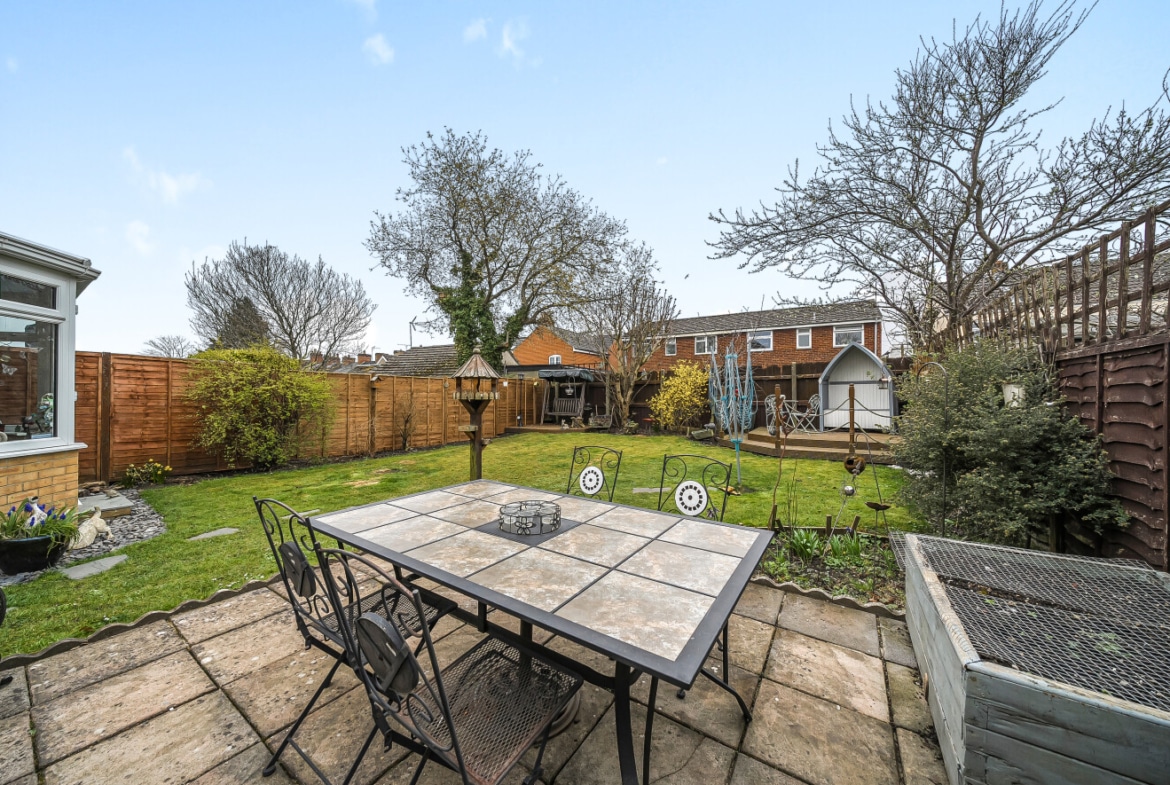 Externally, the property boasts a generous garden with lawn and seating areas, perfect for outdoor enjoyment. Side access leads to a separate garage, while the driveway provides ample parking for multiple vehicles.