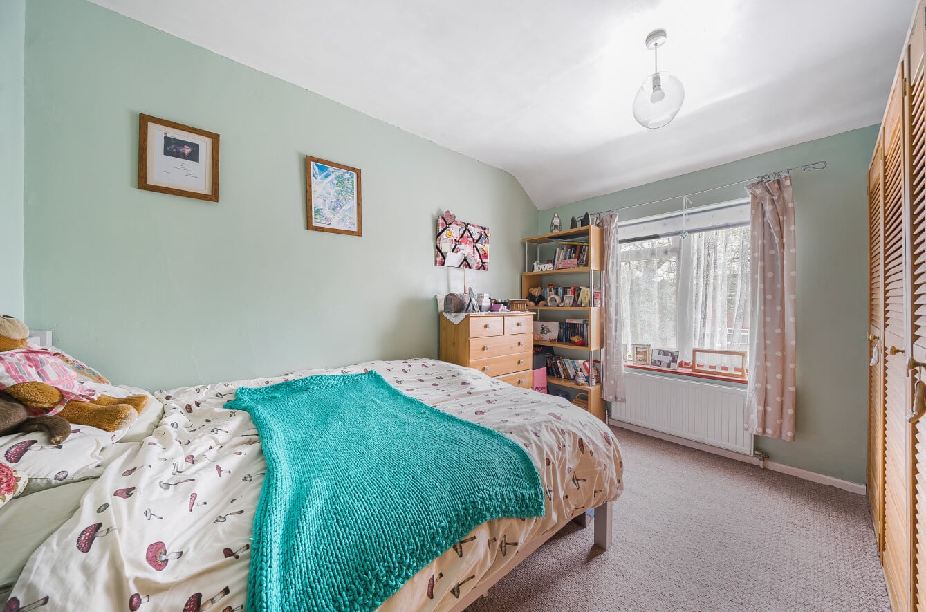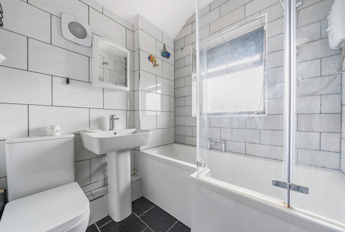 Upstairs, there are three bedrooms, including two doubles and a single, offering flexibility for families or home working. The modern bathroom is beautifully finished with sleek white tiles and features an overhead shower above the bath.