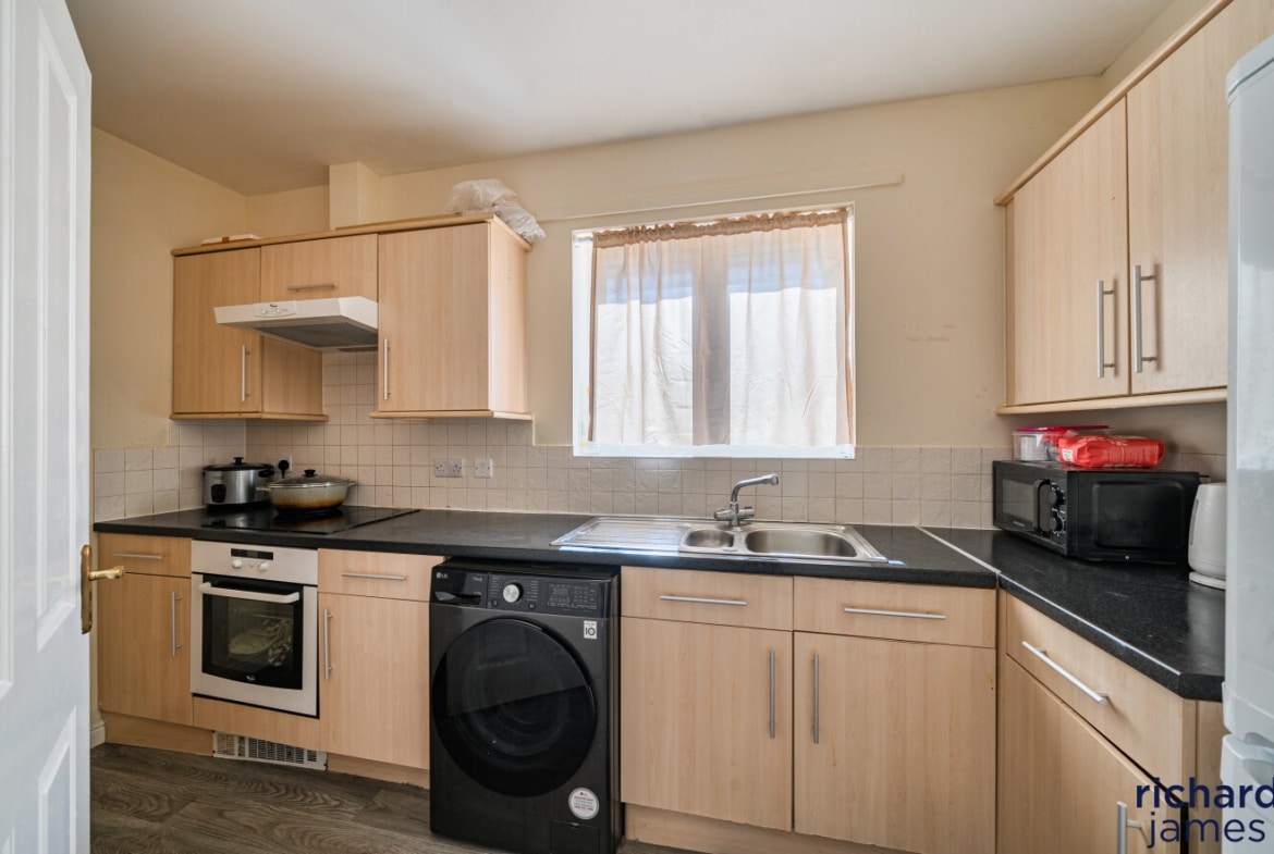 The kitchen is neatly appointed with ample room for freestanding appliances and provides a functional space for everyday cooking.