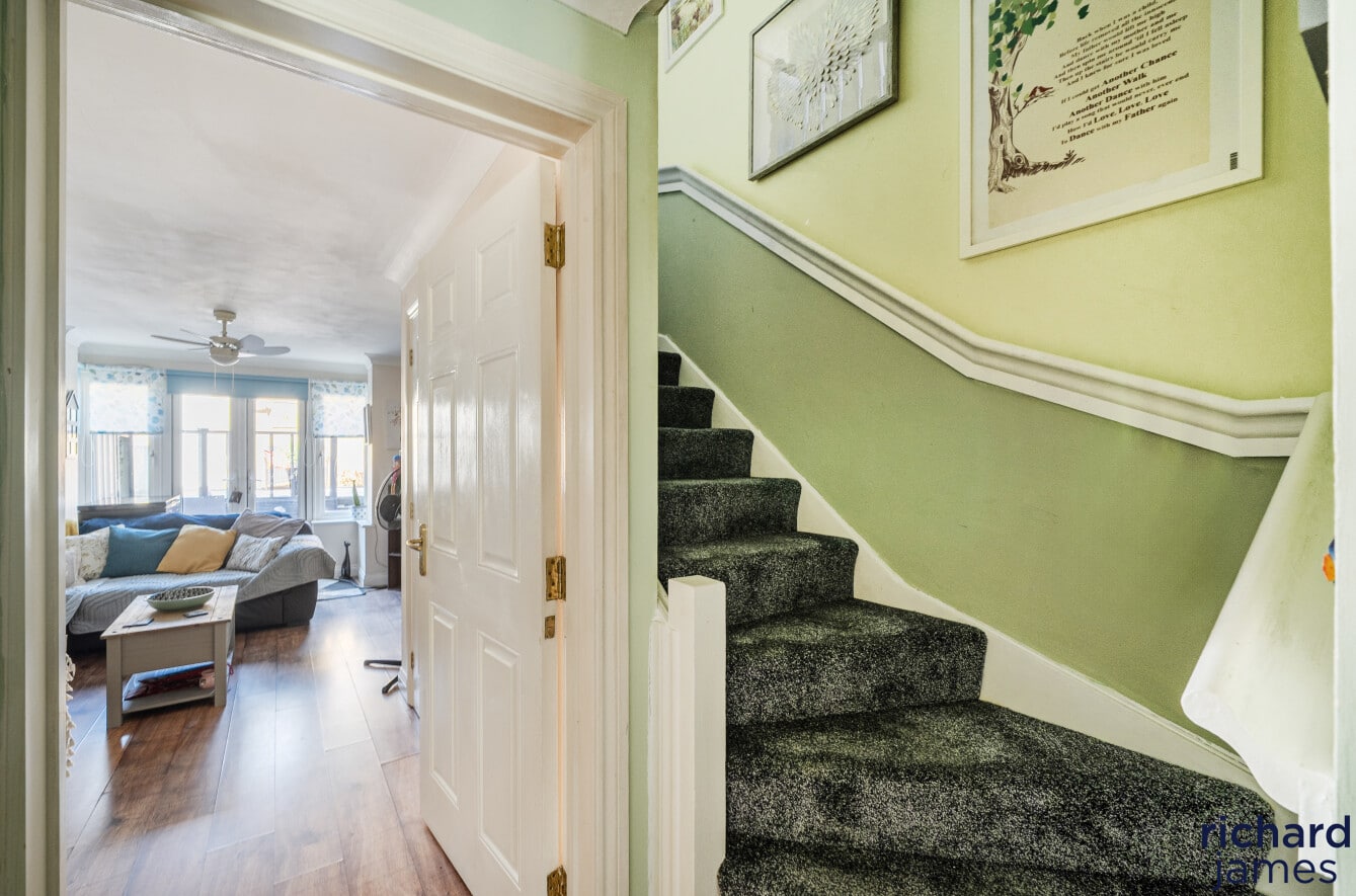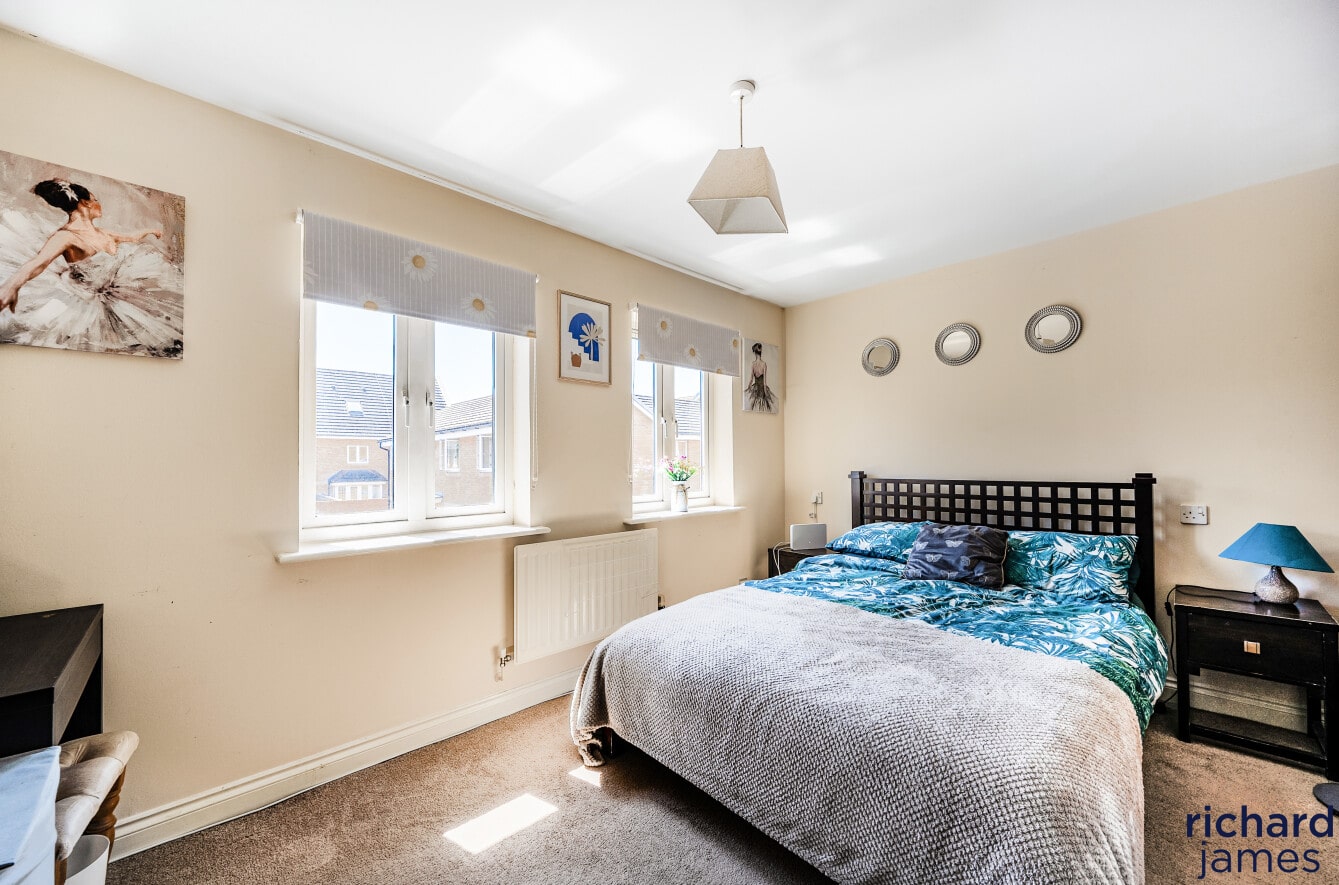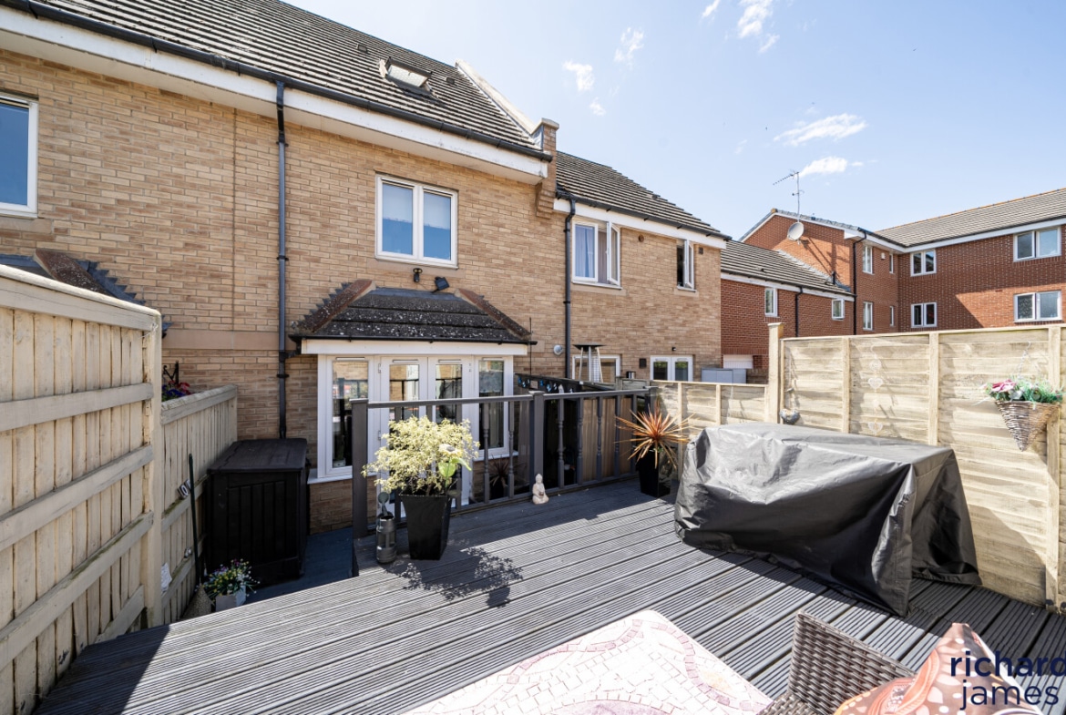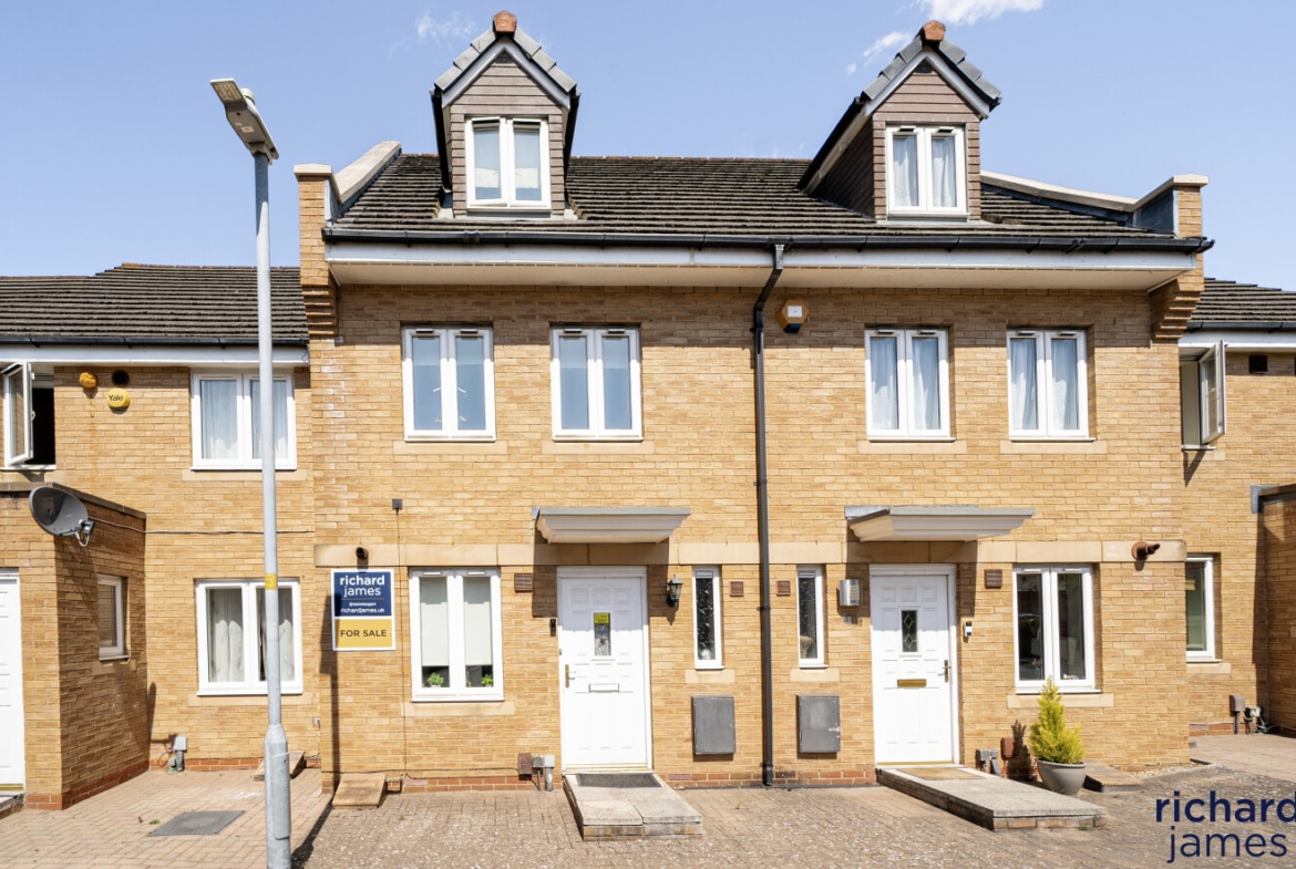 Nestled at the end of a cul-de-sac, this impressive three-storey townhouse offers an inviting blend of modern comfort and practicality. The ground floor is thoughtfully designed to maximise family living, boasting a generously sized living room where French doors elegantly lead to a well-tended garden, blurring the line between indoor and outdoor spaces. An ample number of storage cupboards complement a convenient downstairs WC, ensuring a clutter-free and organised living environment for you and your family.