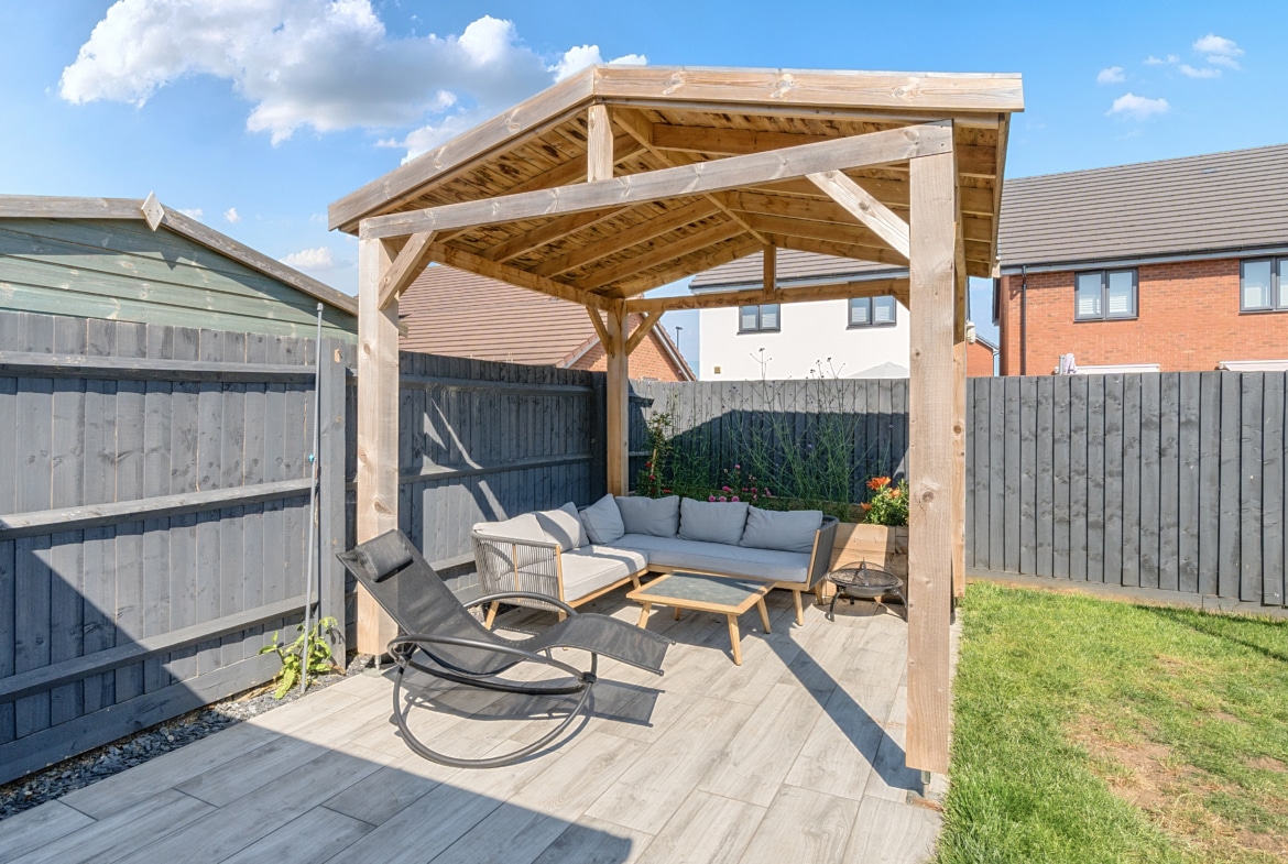 Externally, the property continues to impress. The rear garden has been landscaped and features a new patio area, covered seating space, and access to the part-converted garage. To the side, a private driveway provides off-road parking for multiple vehicles.