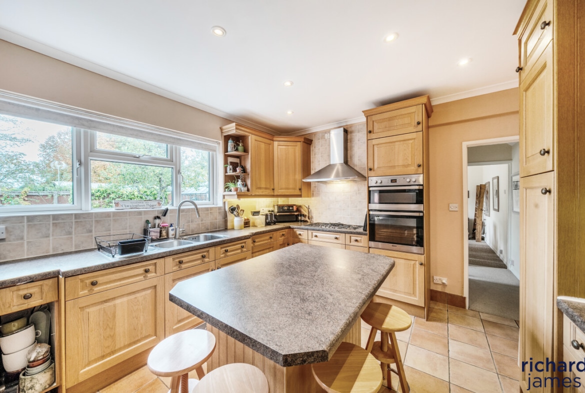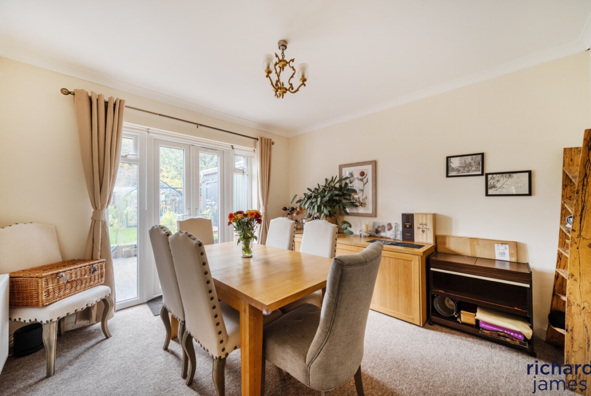This detached chalet-style home offers spacious and versatile accommodation in a peaceful and private setting. The ground floor provides flexible living space, featuring a welcoming dual-aspect living room that fills with natural light, a separate dining room perfect for family meals or entertaining, and a well-appointed kitchen/breakfast room offering plenty of space for informal dining. In addition, there is a third reception room which could easily serve as a study, playroom, or fifth bedroom—ideal for guests or multi-generational living.