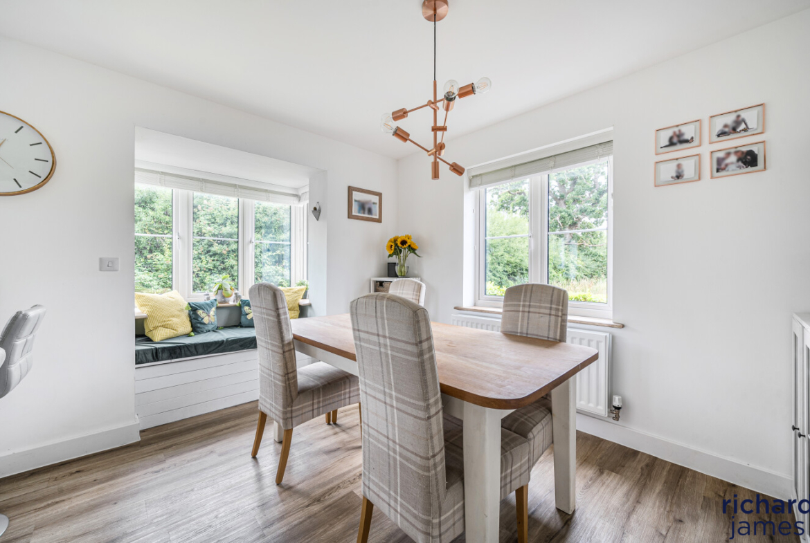 Step inside via a generous entrance hallway that instantly sets a welcoming tone. The spacious living room spans the full depth of the home — flooded with natural light from dual-aspect windows and French doors that open onto the east-facing garden. This elegant space easily accommodates a range of furnishings and creates a seamless indoor-outdoor flow for summer gatherings.