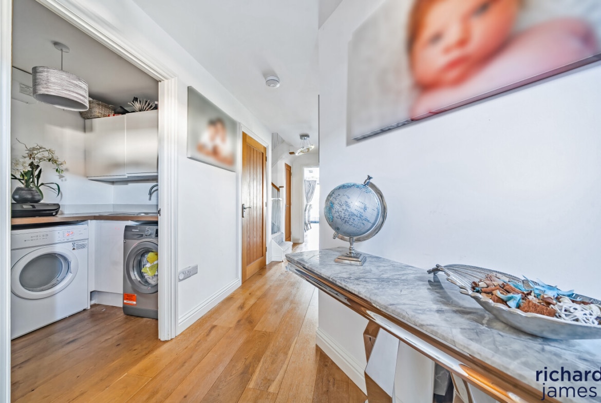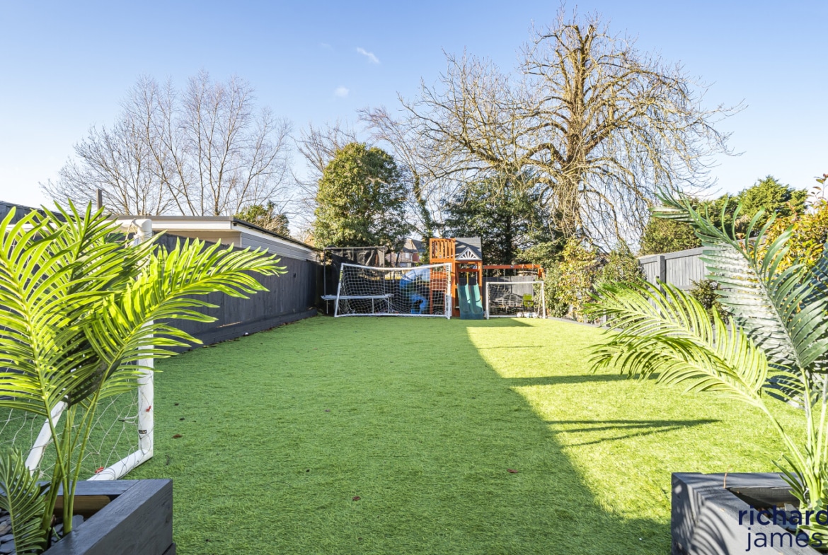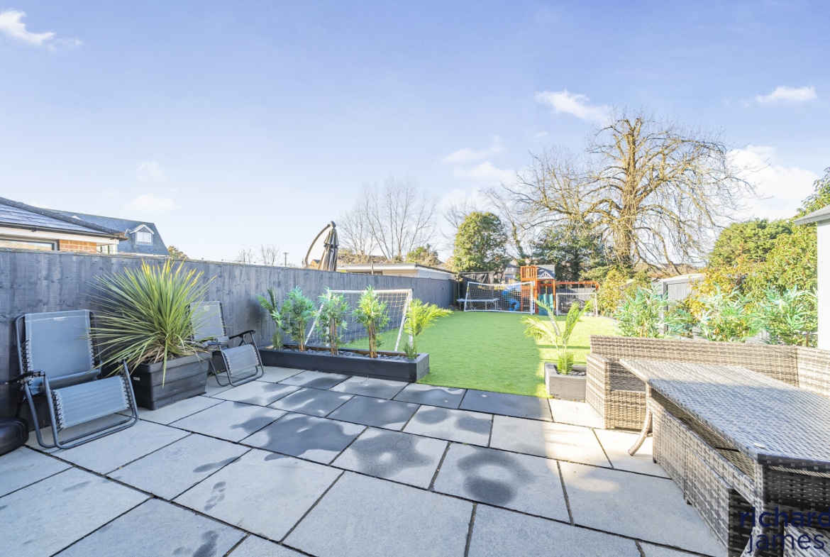 To the rear is an enclosed landscaped rear garden with a large patio seating and barbecue area leading to an artifical lawn which makes for the perfect play space and football pitch. The rear garden also offers gated side access from both sides.