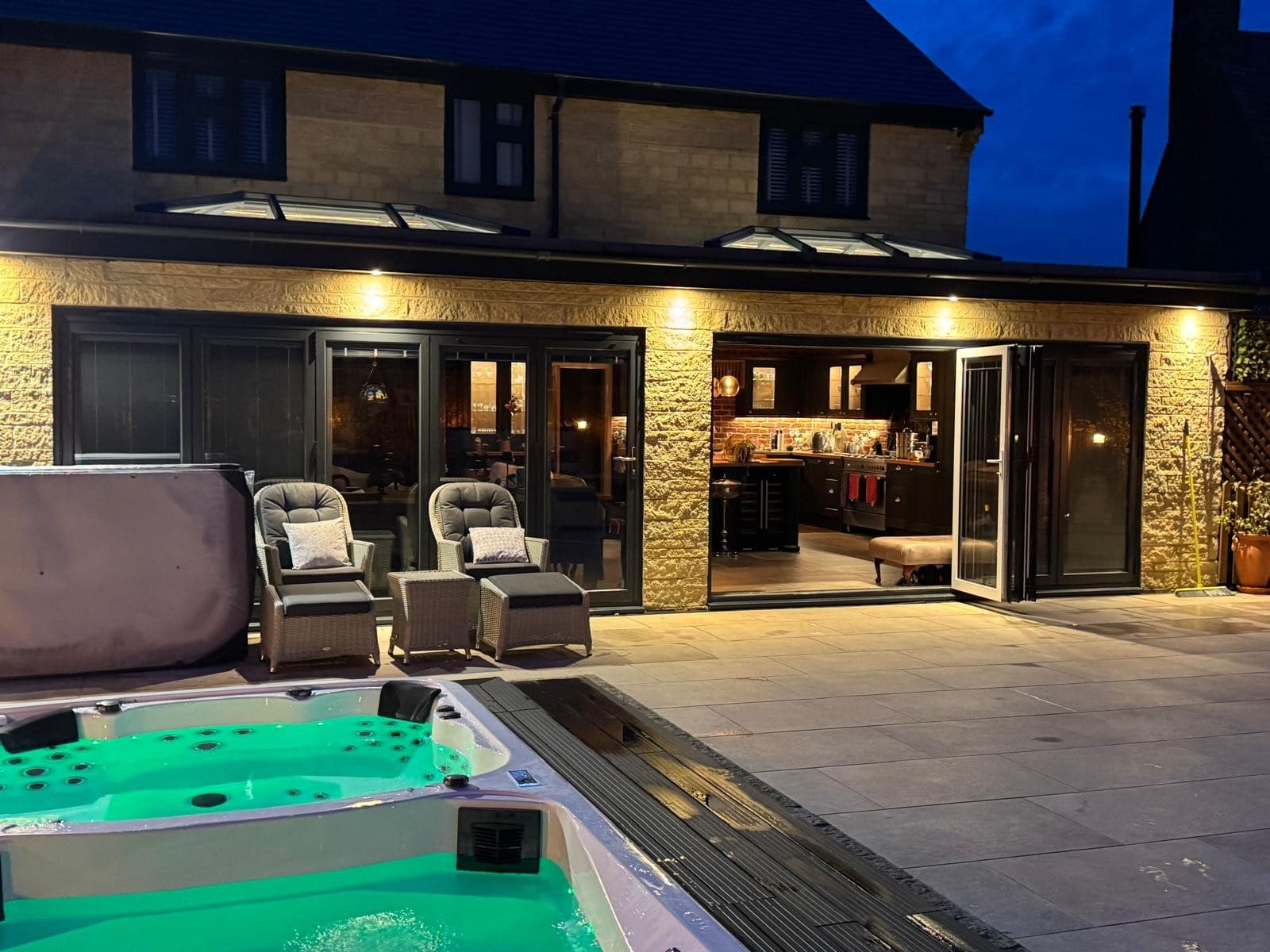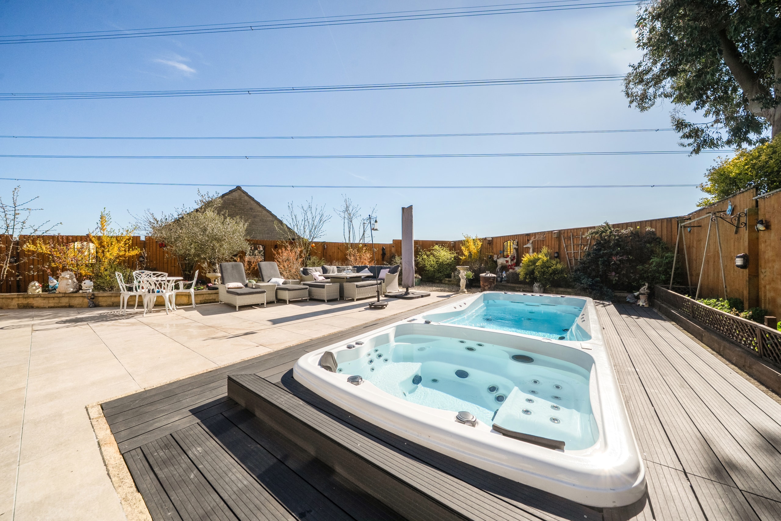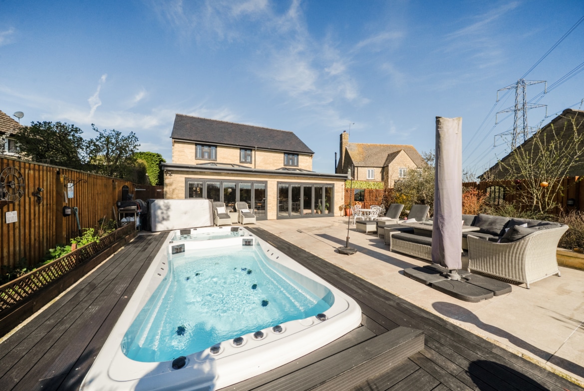 The outdoor space is equally impressive, boasting a unique tidal pool with a hot tub, ideal for year-round relaxation and enjoyment.