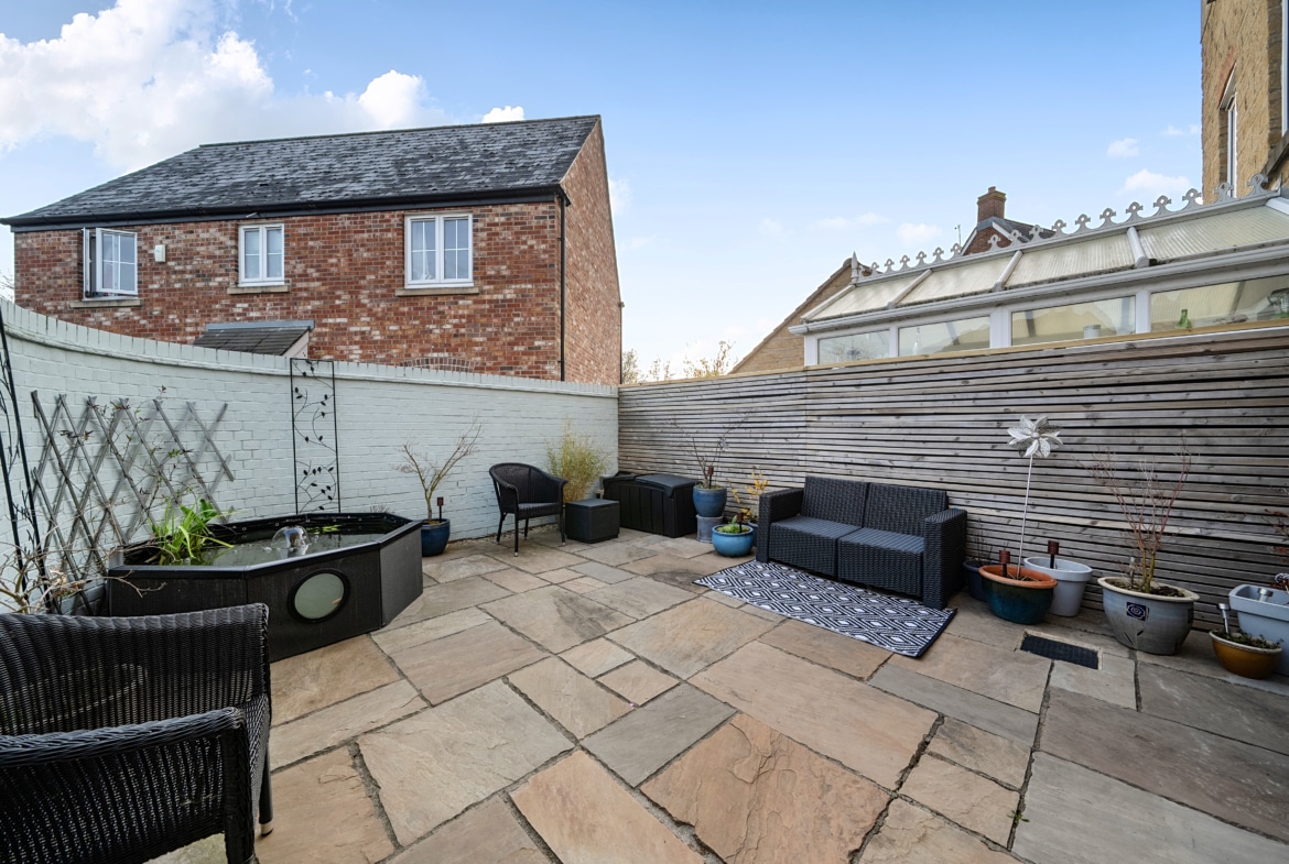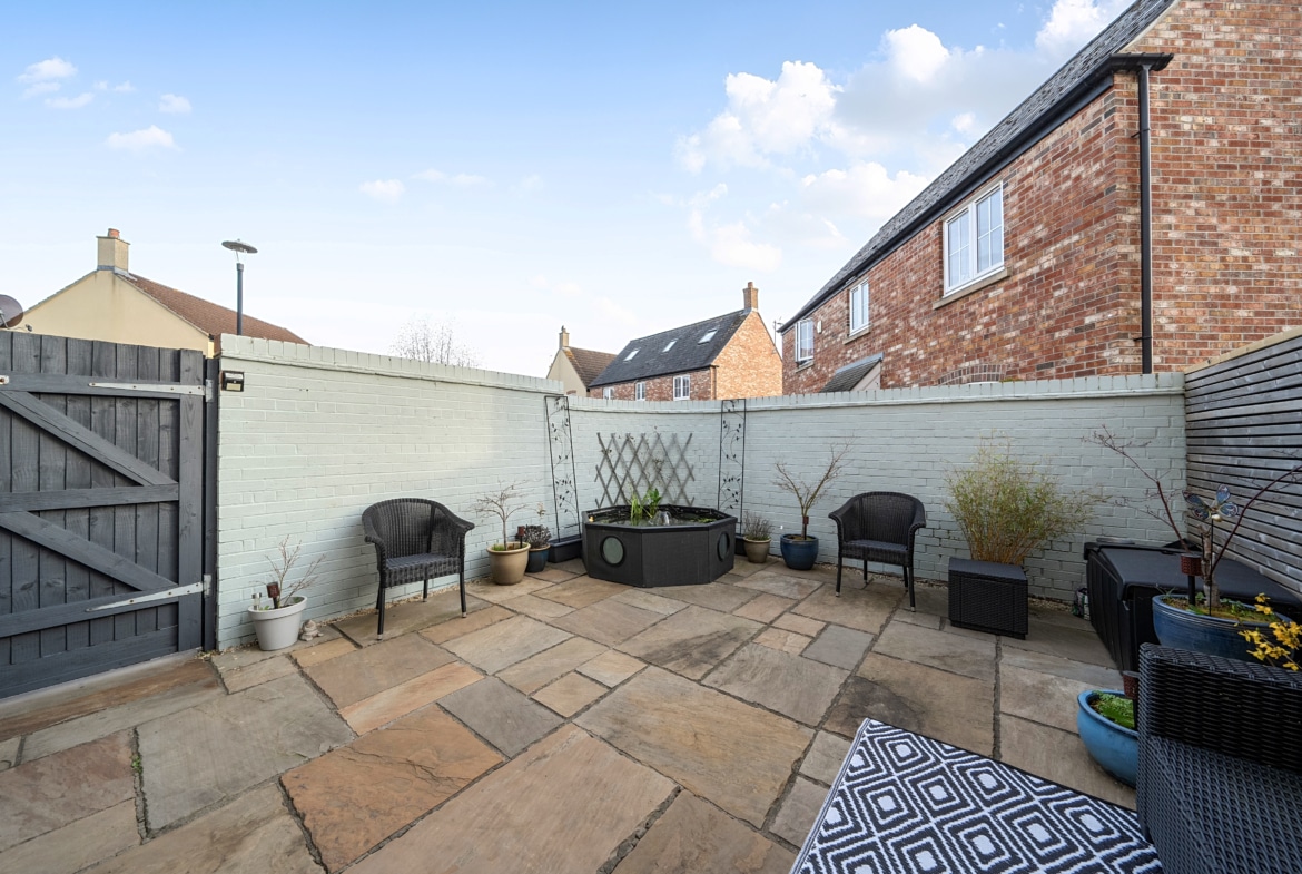 Outside, the rear garden is set out as a courtyard with patio, so it’s easy to maintain and ideal if you don’t want the upkeep of a bigger garden. The property also comes with a garage and driveway parking.