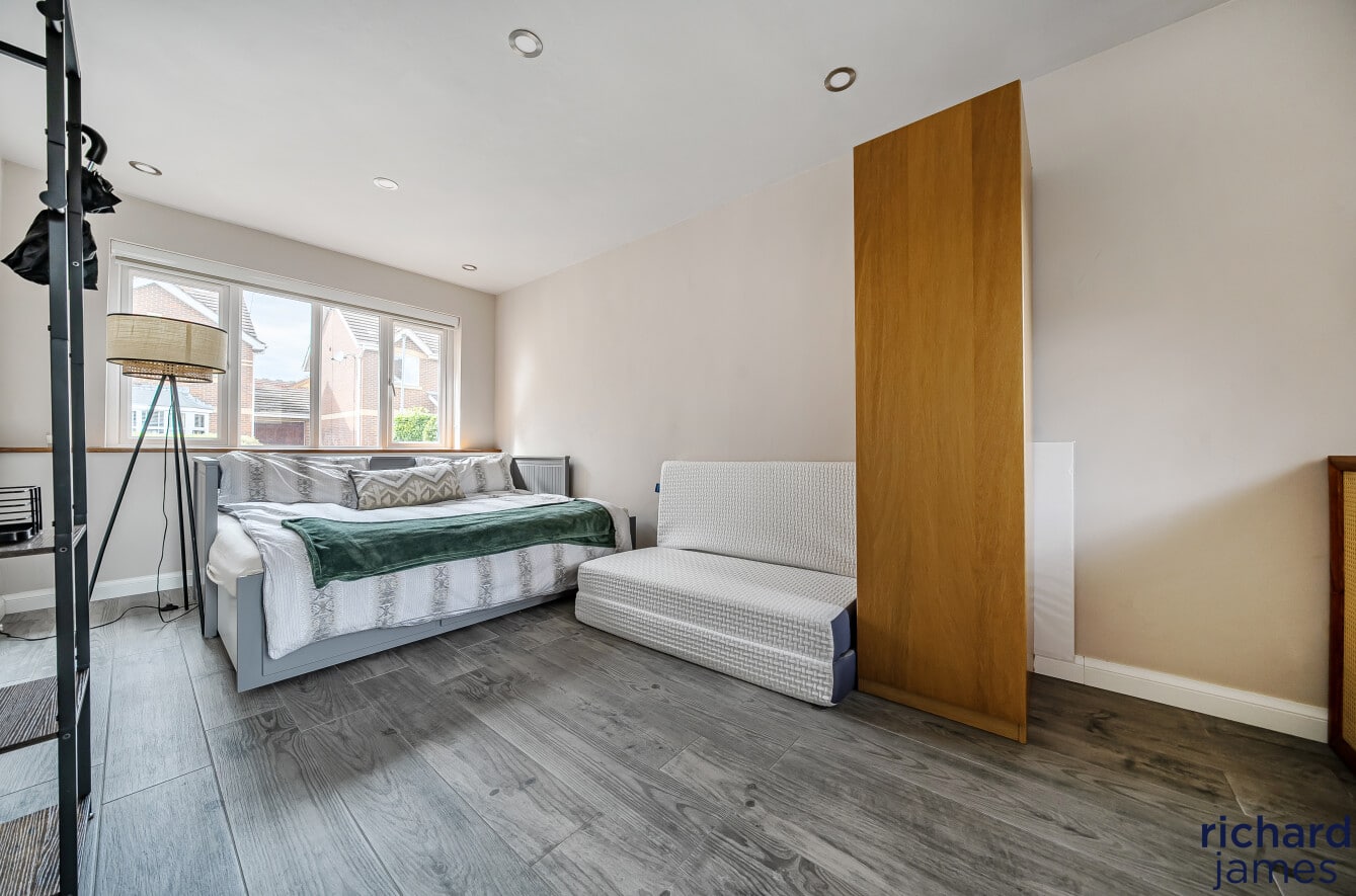 The ground floor begins with an entrance hallway and WC, leading into a bright and welcoming living room with a feature fireplace. From here, the home flows into a versatile area, currently utilised as an office, but equally well suited as a snug, playroom or dining space. The open-plan layout continues into a modern kitchen and dining area, perfect for family life and entertaining. In addition, the garage has been thoughtfully converted to provide a further flexible room, ideal as a bedroom, home office, or additional reception space.