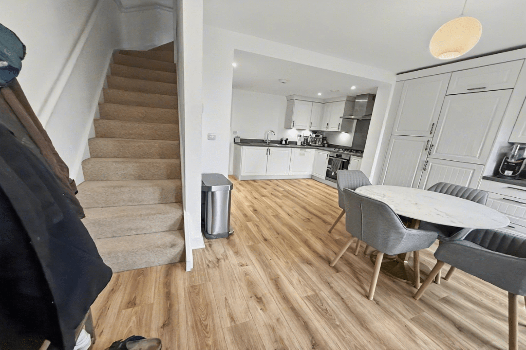 Upon entrance, you are greeted by the large kitchen diner, with intergrated applicances, perfect for entertaining or cooking with the family You also have the downstairs WC tucked away for ease. Leading through, you have a modern living room infused with natural light from the patio doors and windows either side, offering a superb outlook onto the garden space, perfect for furry friends or those who are green fingered!