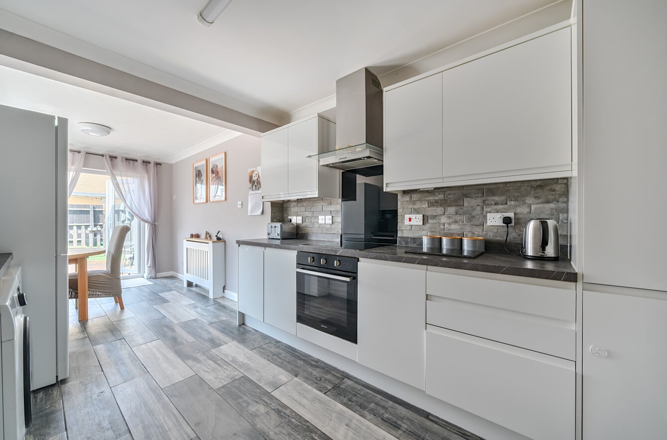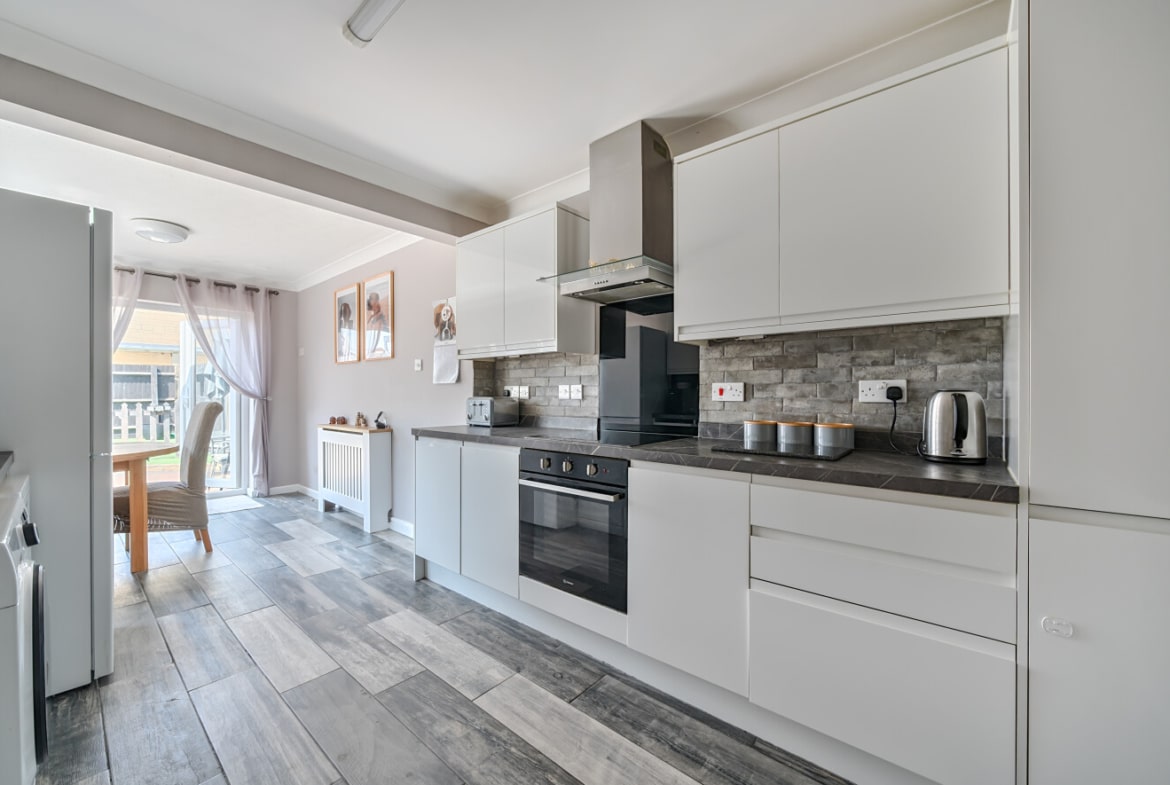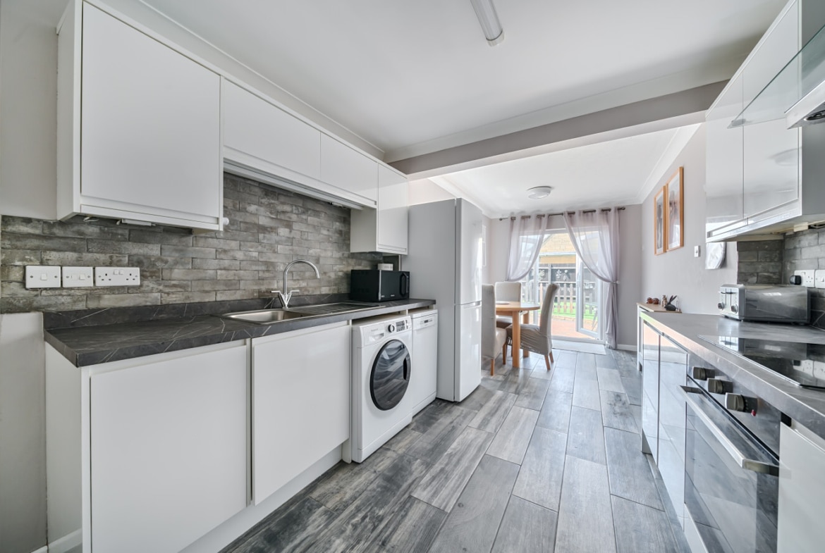 The home offers a generous lounge at the front, filled with natural light, and a spacious modern kitchen/diner at the rear, opening directly into the garden — ideal for entertaining or family meals. The kitchen features ample worktop space and room for a dining table, creating a sociable and functional hub of the home.