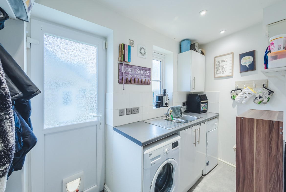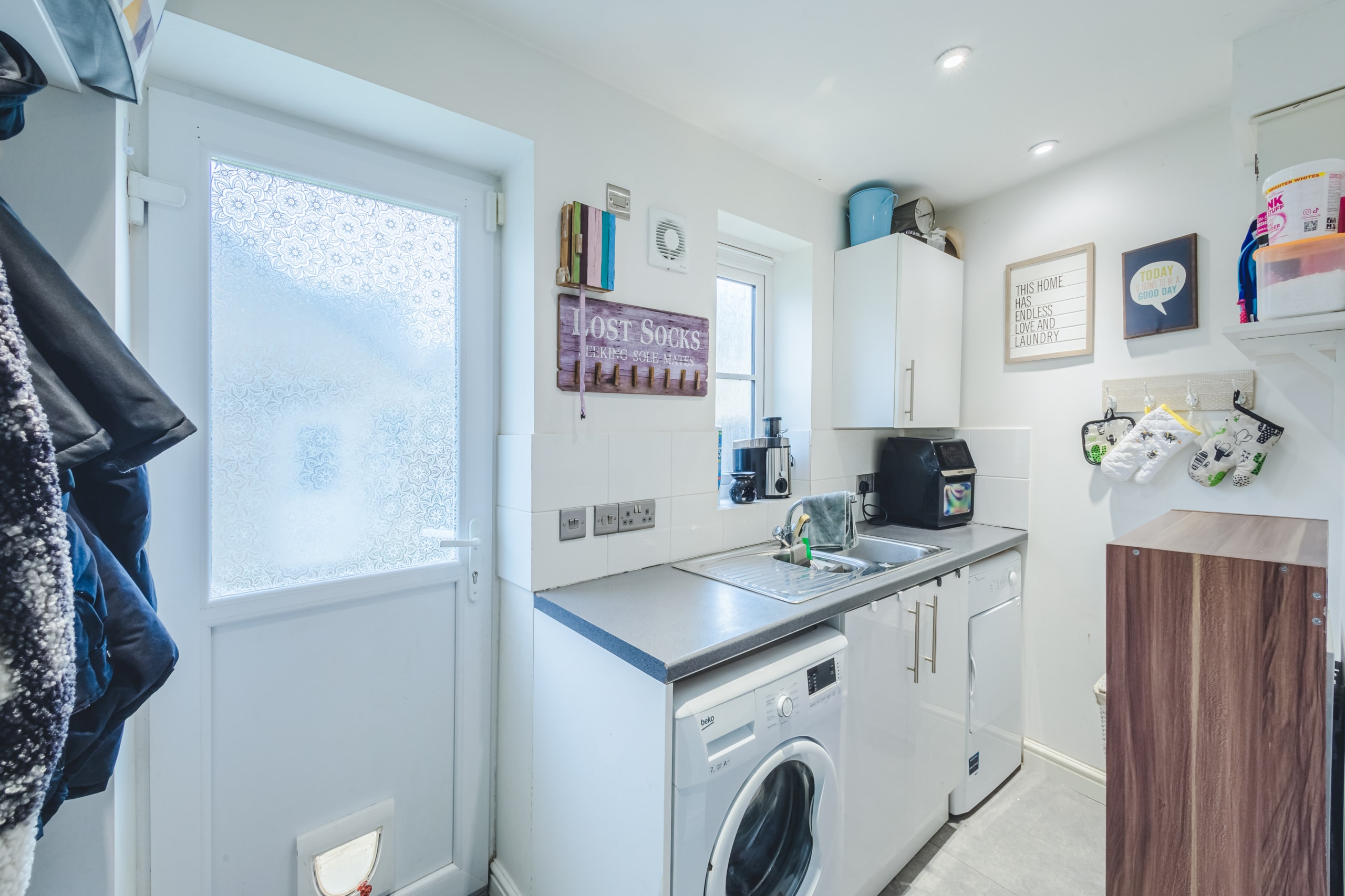 Step into the welcoming entrance hall, leading to a bright and spacious lounge/diner that spans one side of the home. This versatile space features French doors opening to the rear garden, perfect for entertaining or relaxing. On the opposite side, a modern kitchen/breakfast room boasts built-in appliances, ample tall cupboards, and a sleek design. An extended utility room enhances functionality, creating more room for storage and freeing up space in the kitchen. A cloakroom completes the ground floor.