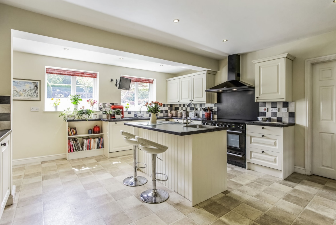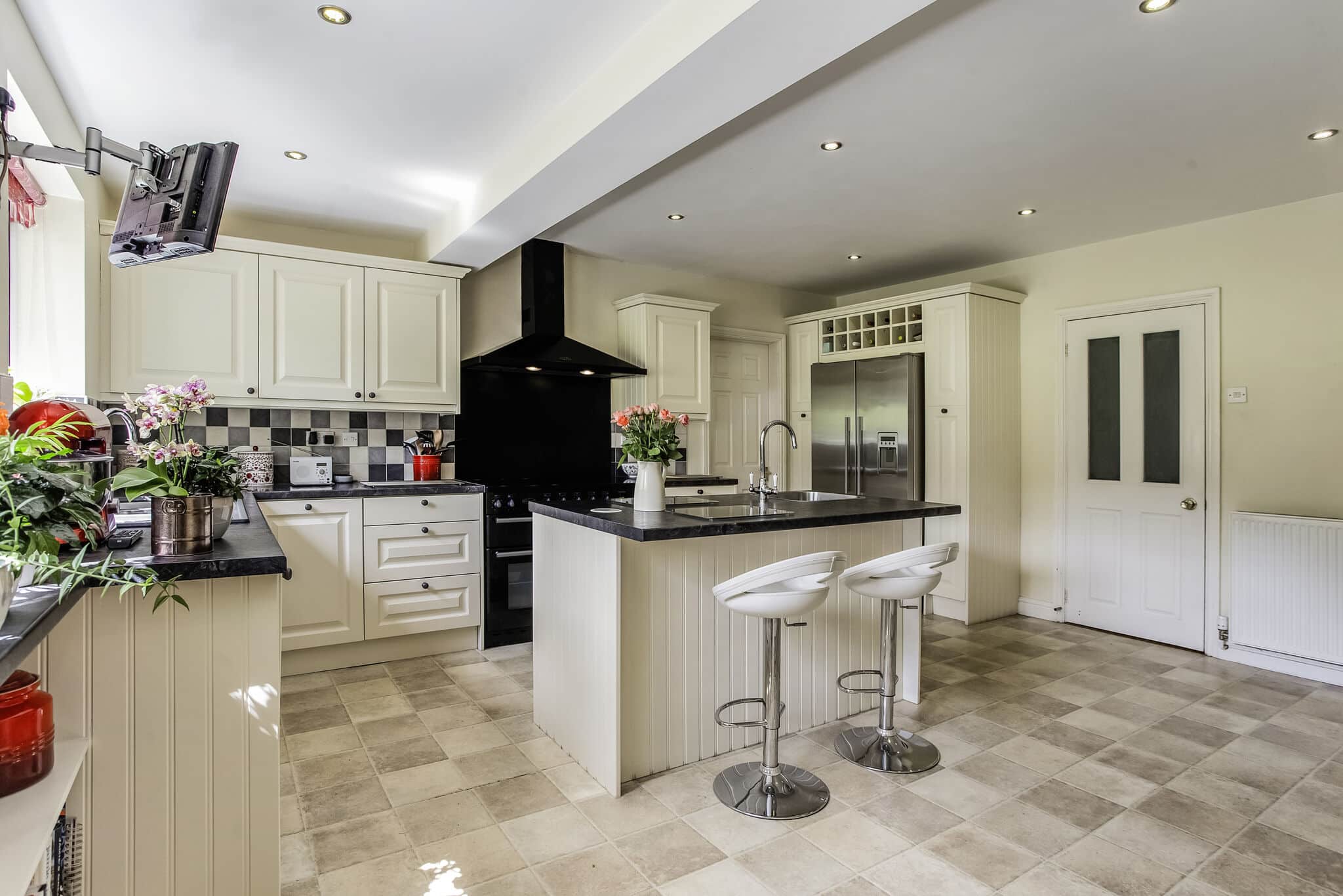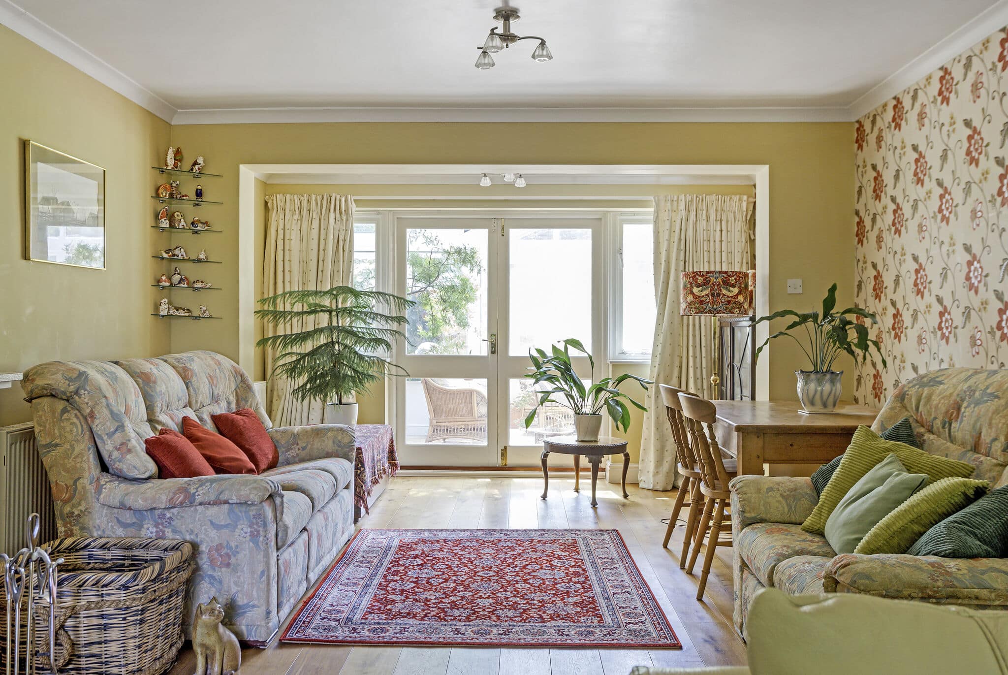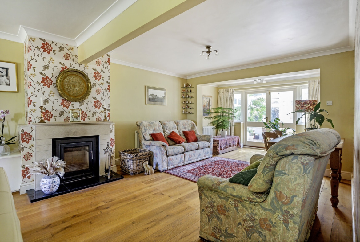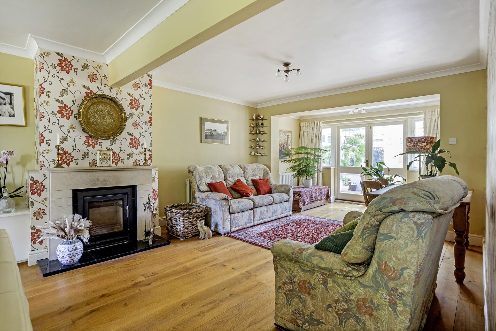 An inviting entrance hall leads to the principal reception rooms. The kitchen/breakfast room is both stylish and practical, featuring a central island, an electric Rangemaster cooker, integrated appliances and generous storage, with pleasant views across the rear gardens.