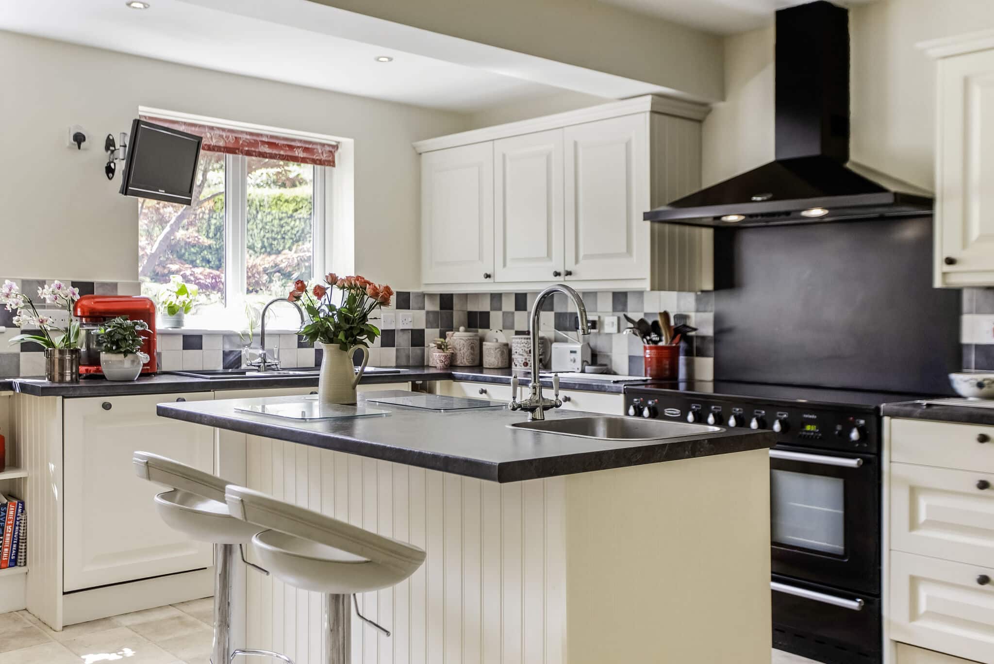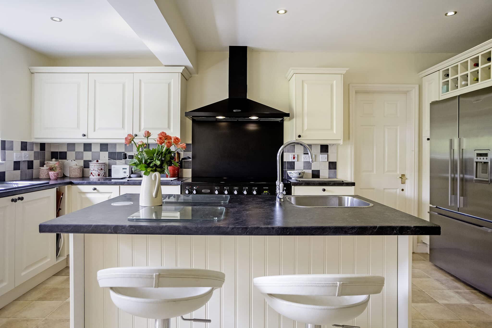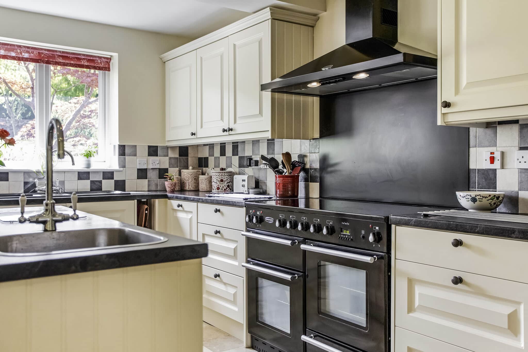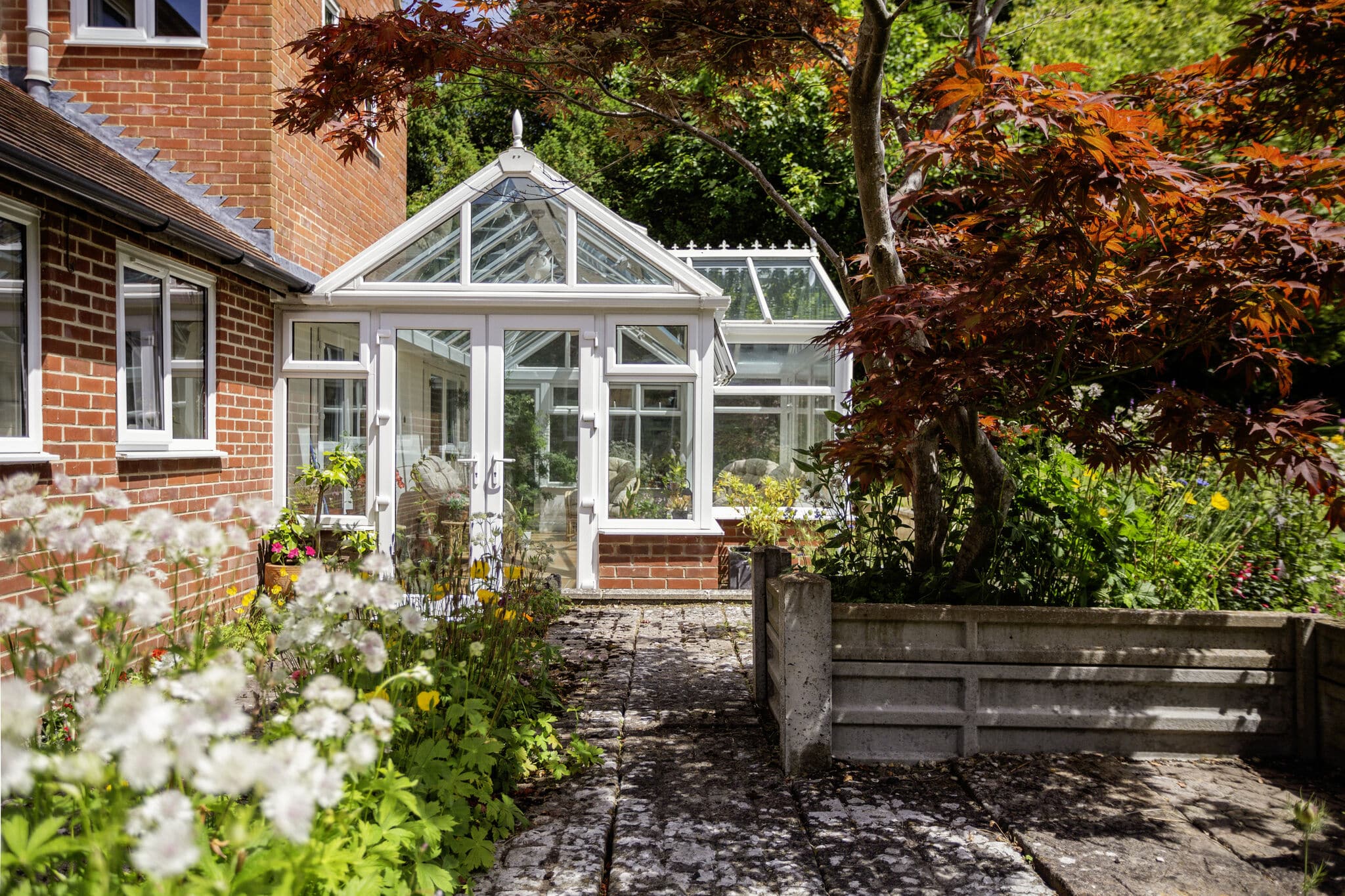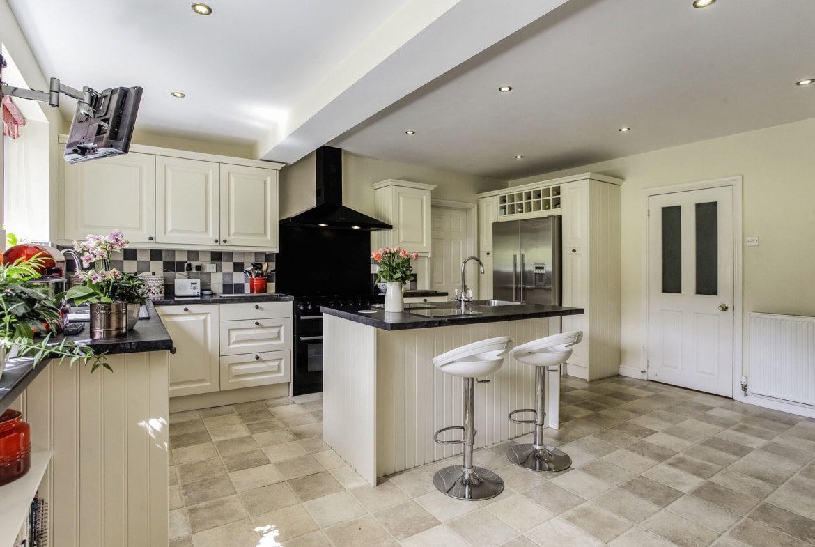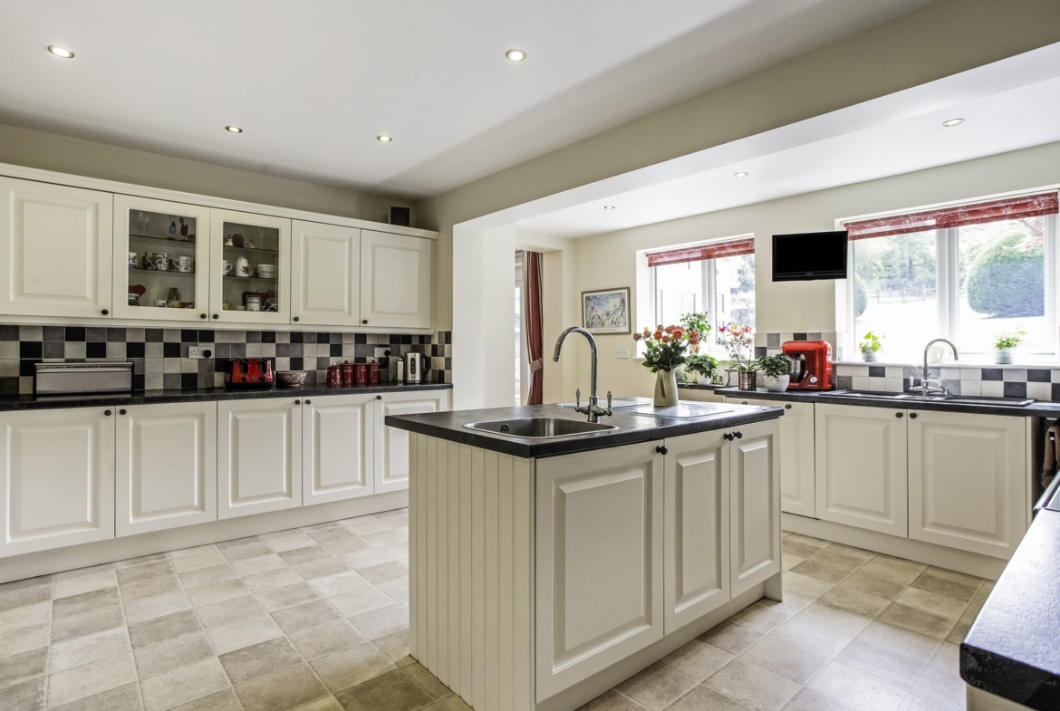 An inviting entrance hall leads to the principal reception rooms. The kitchen/breakfast room is both stylish and practical, featuring a central island, an electric Rangemaster cooker, integrated appliances and generous storage, with pleasant views across the rear gardens.