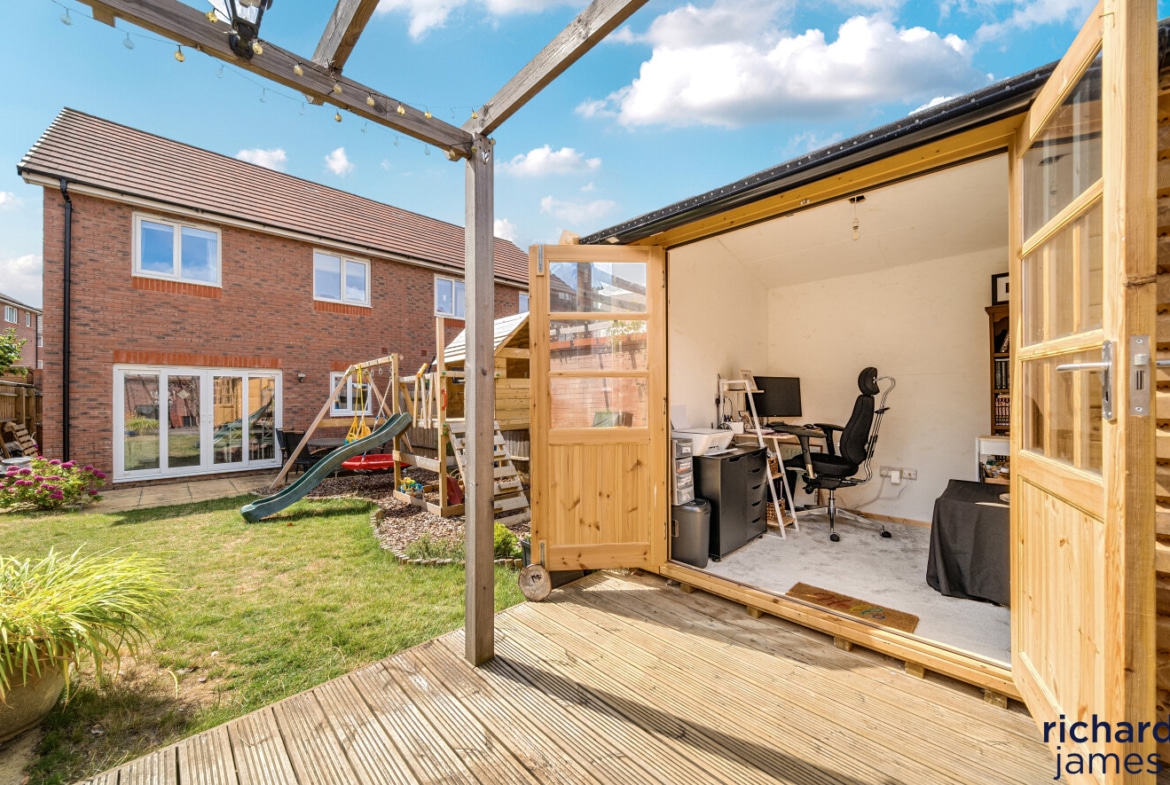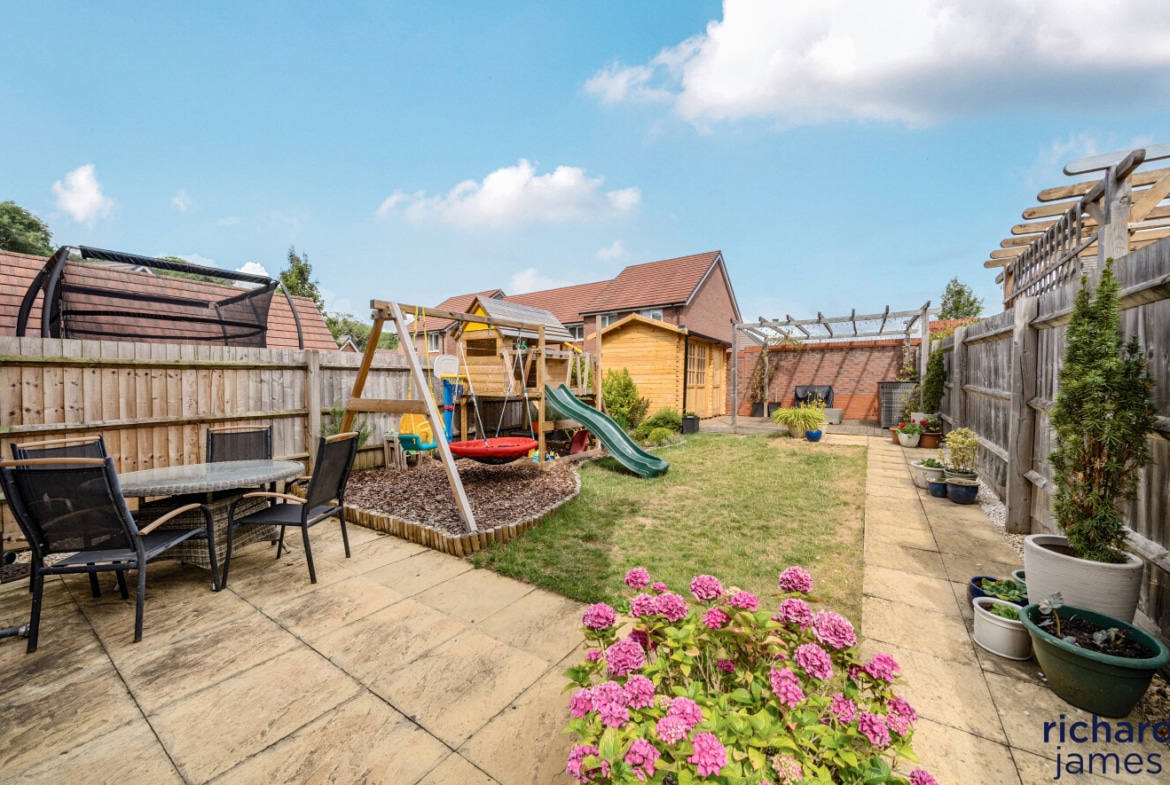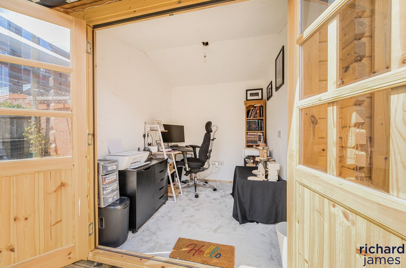 To the rear is an enclosed and private rear garden which has been improved by the current owners offering a patio seating area, leading to a good sized lawn, a children play area laid to ‘soft play bark’ plus a superb outbuilding and shed, the outbuilding offers full power, lighting and wifi making it ideal for an office.