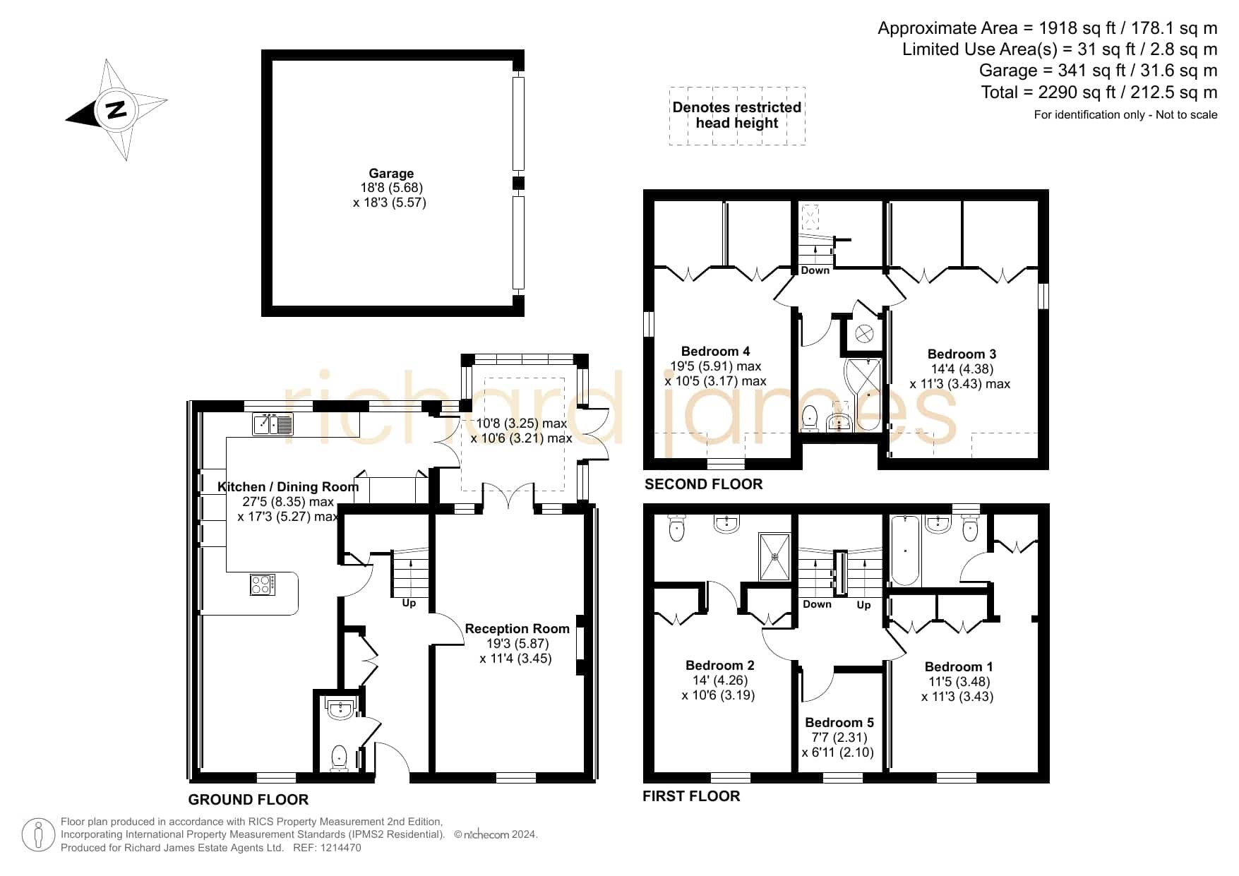 Upstairs, the first floor boasts two double bedrooms, each with fitted wardrobes and ensuites, along with the fifth bedroom. The top floor houses two additional double bedrooms and a family bathroom, providing ample accommodation for a growing family.